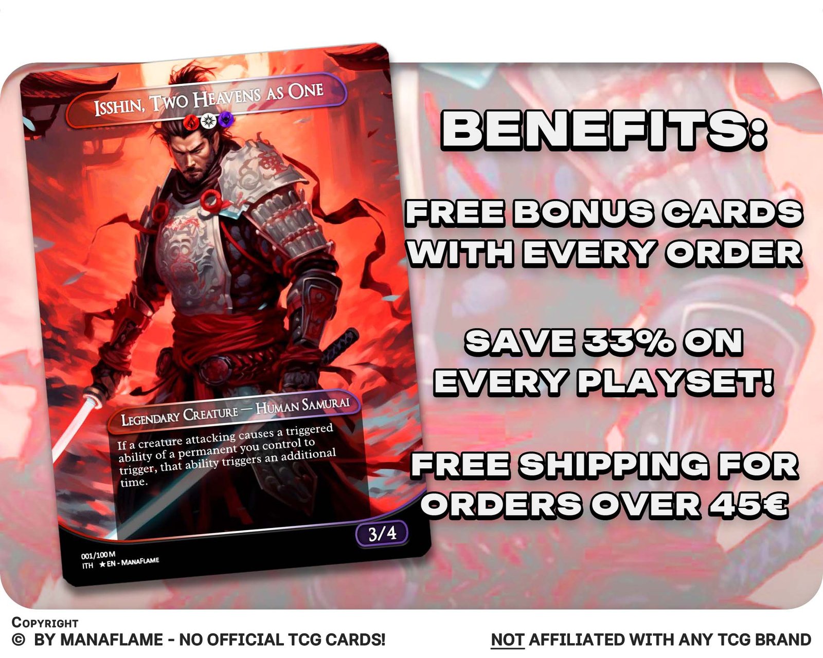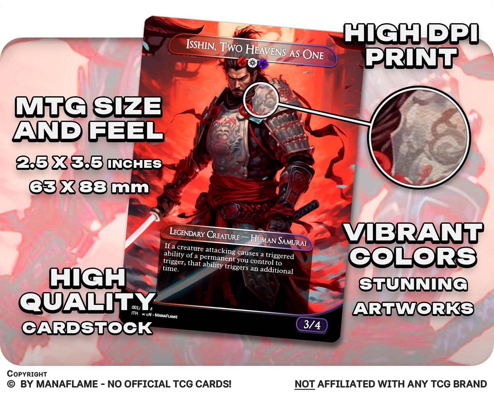 Includes 1 high-quality ManaFlame custom card of “01 – Isshin, Two Heavens as One”, crafted with great attention to detail.
