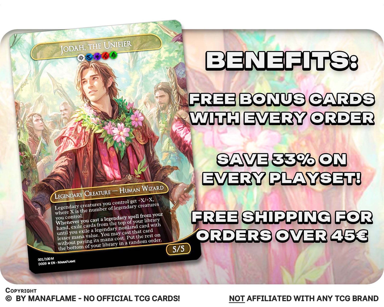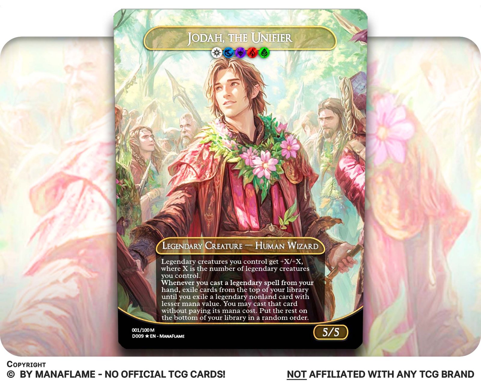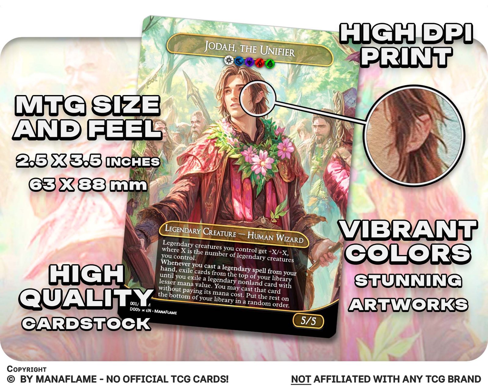 Includes 1 high-quality ManaFlame custom card of “01 – Jodah, the Unifier”, crafted with great attention to detail.