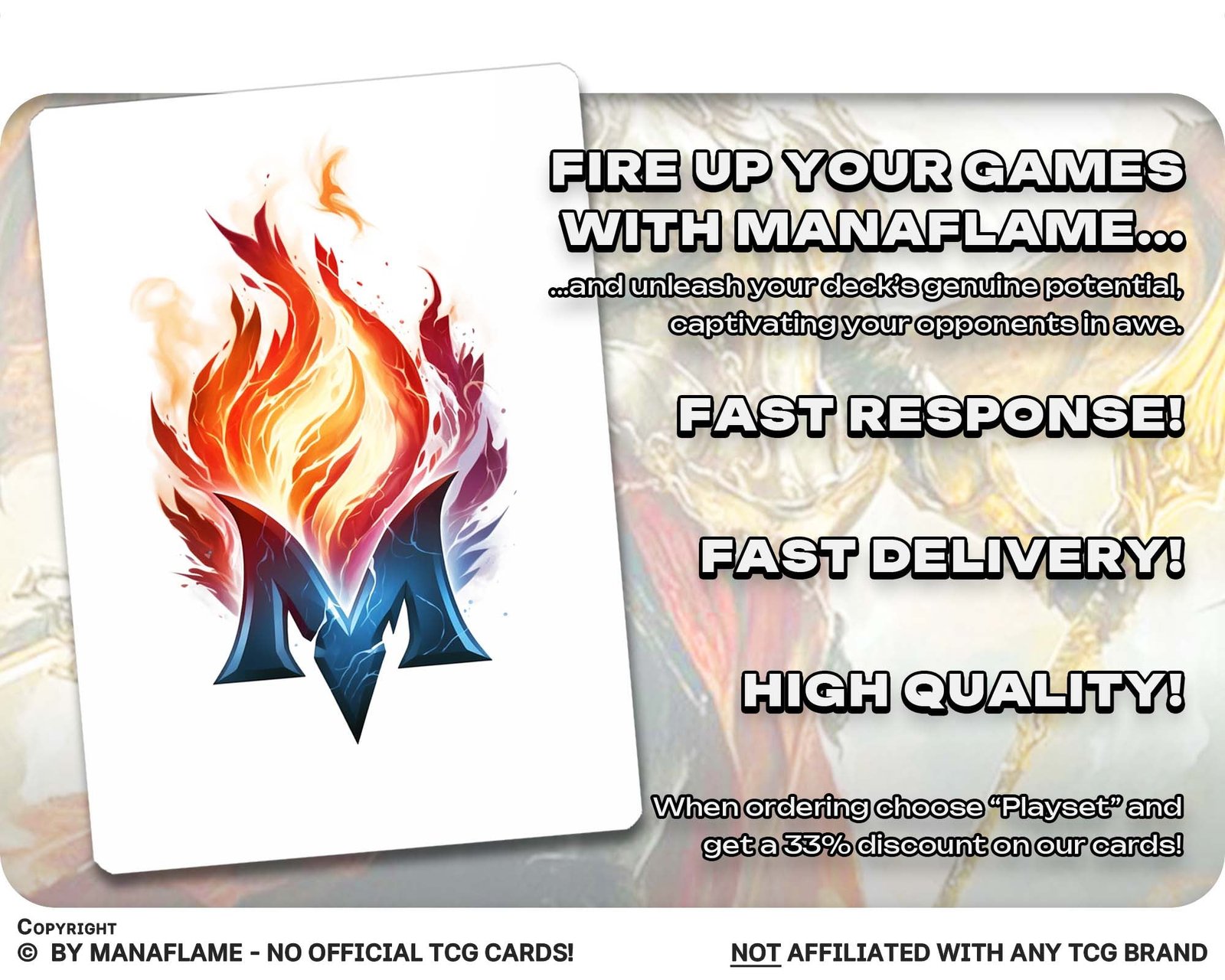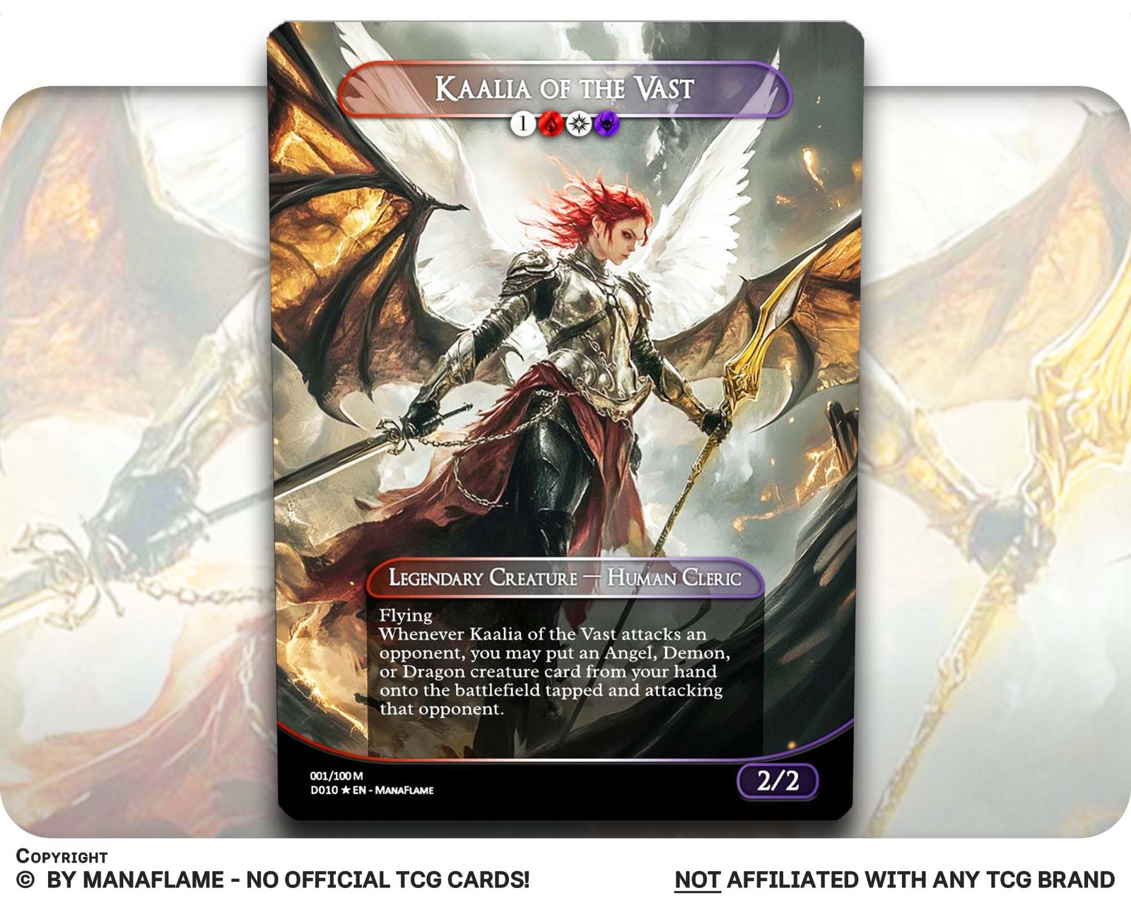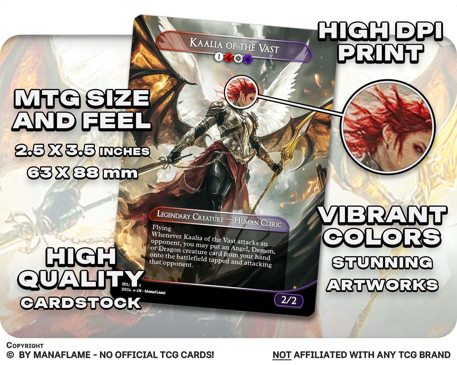 Includes 1 high-quality ManaFlame custom card of “01 – Kaalia of the Vast”, crafted with great attention to detail.
