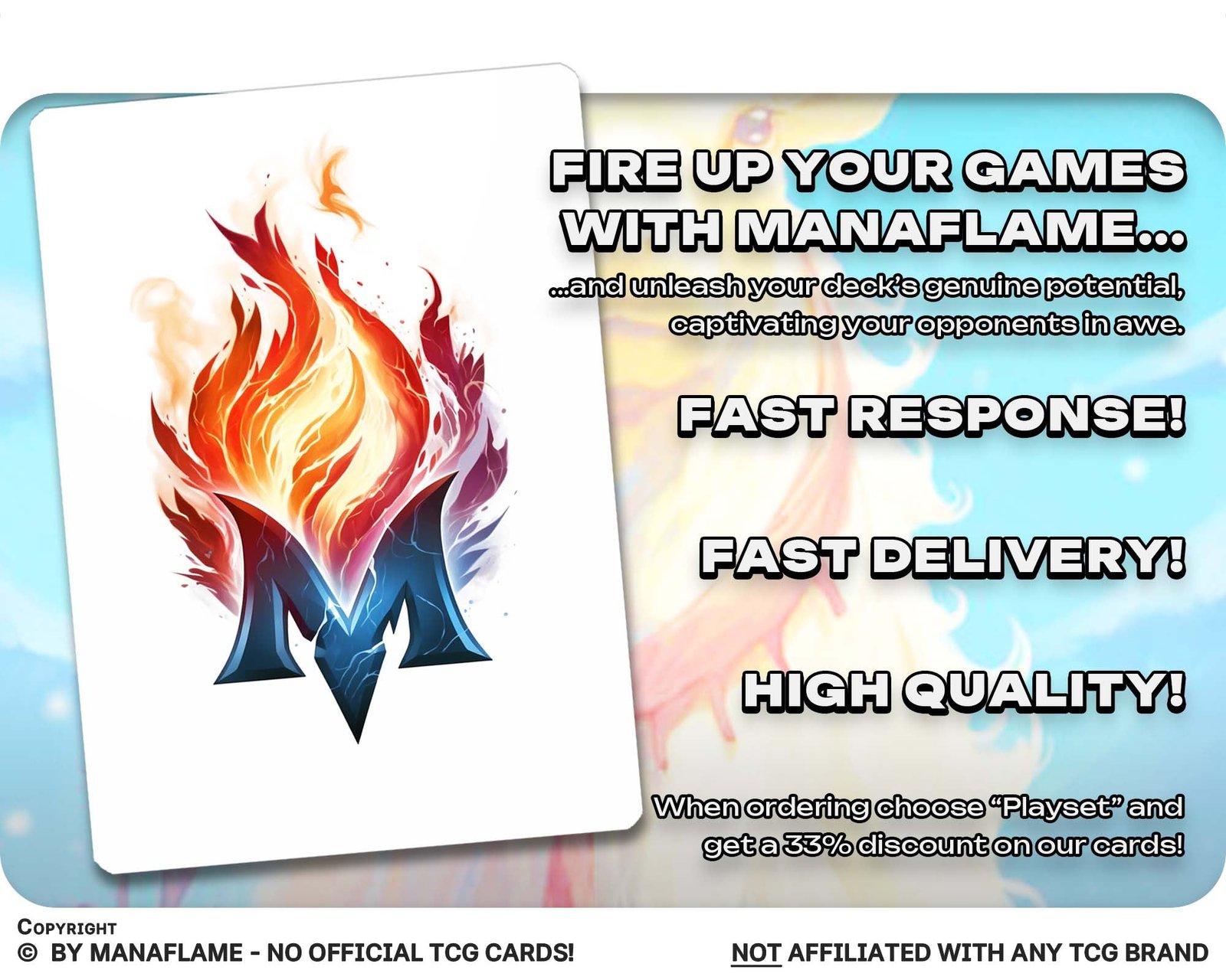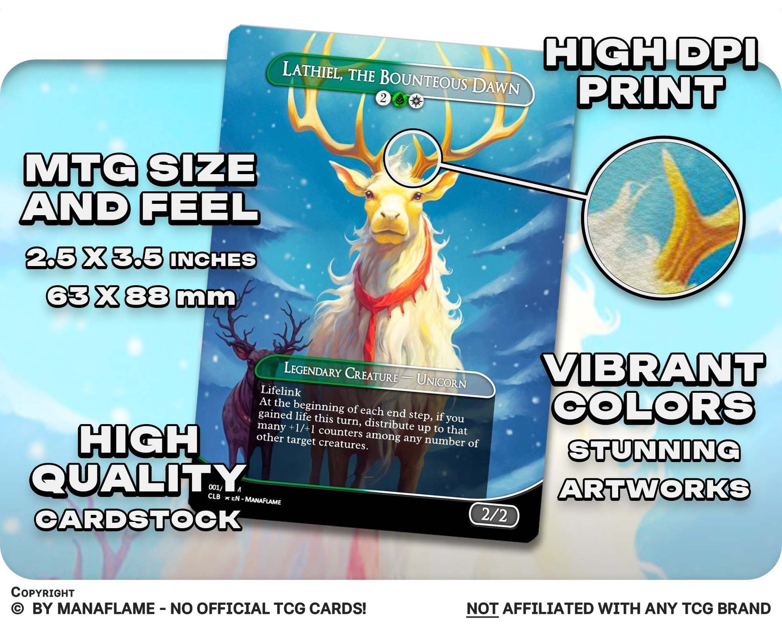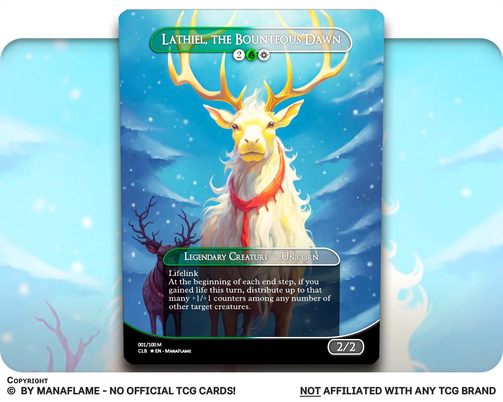 Includes 1 high-quality ManaFlame custom card of “01 – Lathiel, the Bounteous Dawn”, crafted with great attention to detail.