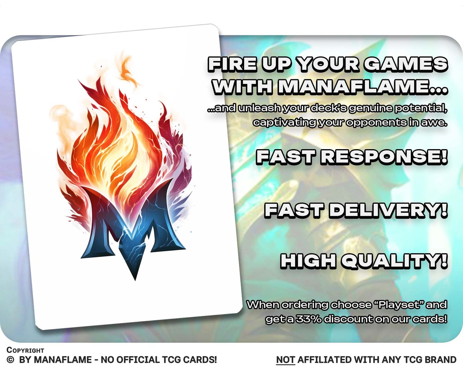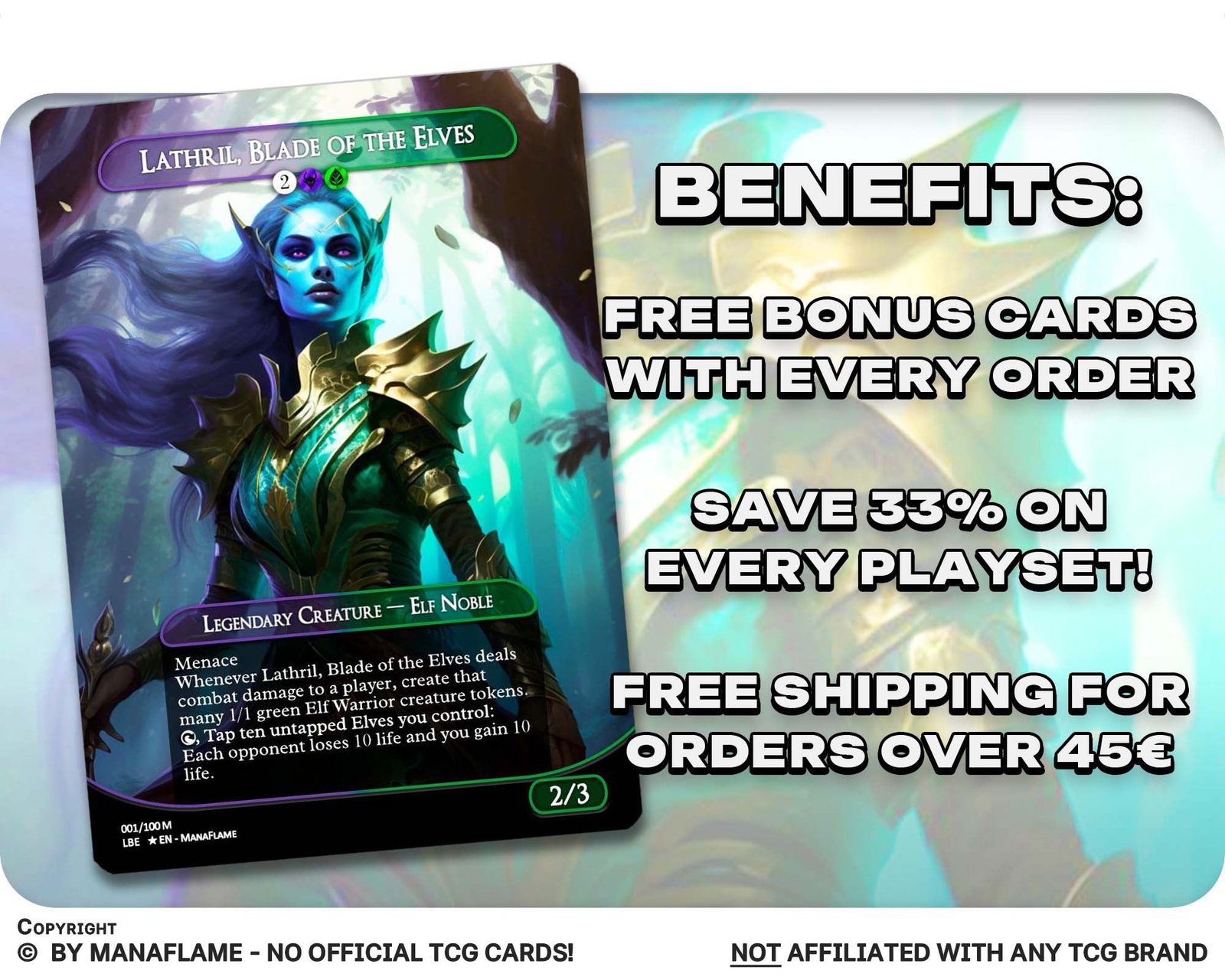 Includes 1 high-quality ManaFlame custom card of “01 – Lathril, Blade of the Elves”, crafted with great attention to detail.
