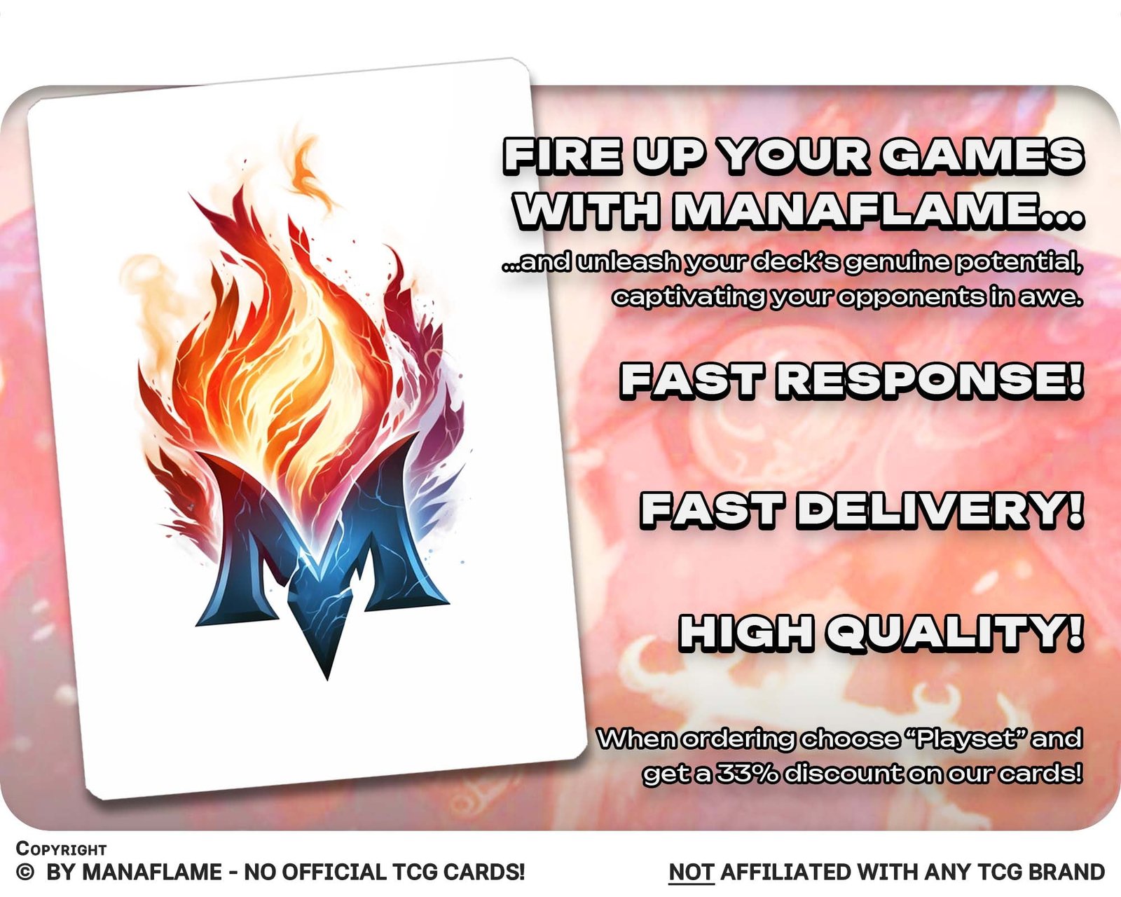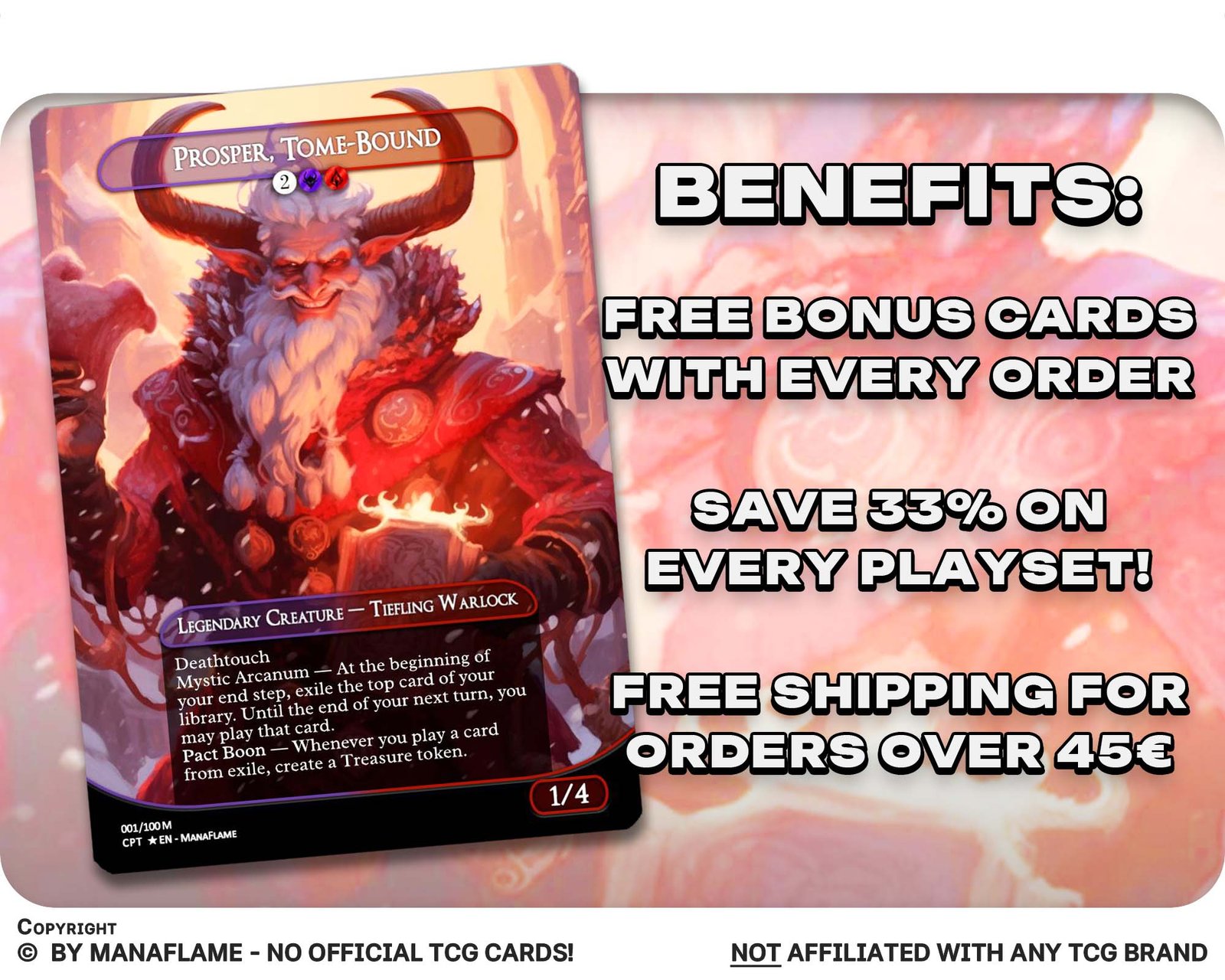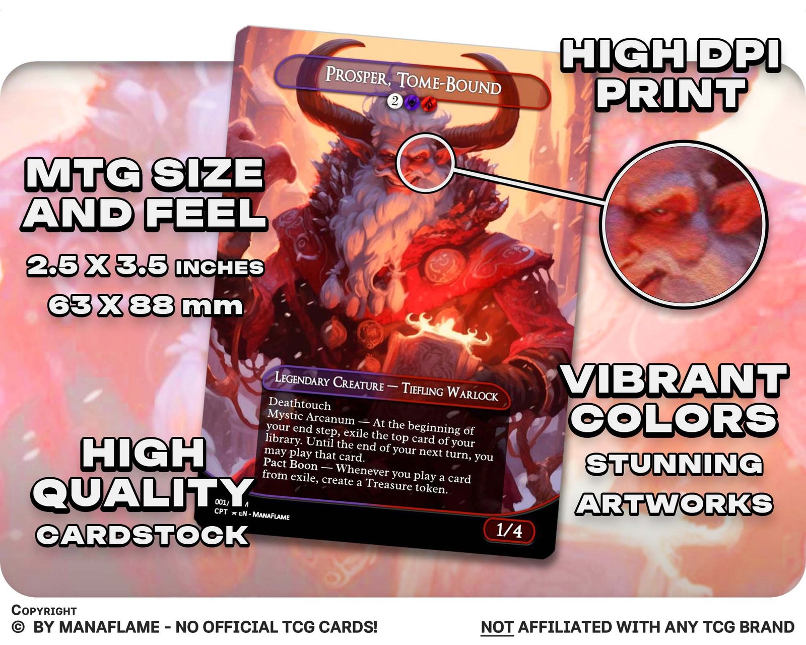 Includes 1 high-quality ManaFlame custom card of “01 – Prosper, Tome-Bound”, crafted with great attention to detail.