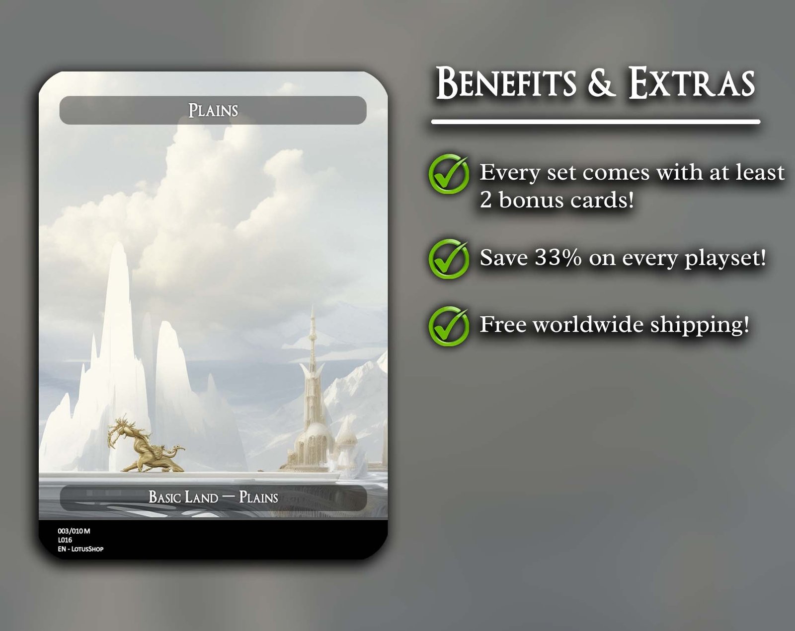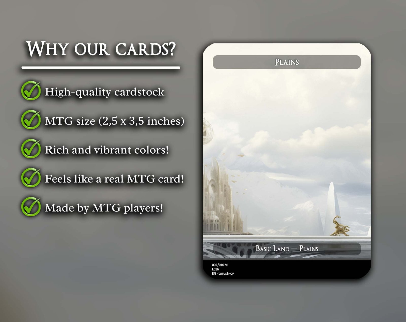 Explore the advantages: Our MTG proxies offer passionate players a wealth of benefits. Crafted with the utmost care, these proxy cards meticulously capture the essence of real MTG cards, creating a captivating and authentic gaming experience. The impressive full-art designs draw inspiration from the style of the latest MTG cards, ensuring that your collection stands out from the crowd. These enchanting cards not only enhance your gameplay but also serve as exquisite artworks that add a touch of sophistication to your MTG deck. You can rest assured that our proxy cards are made from the highest quality materials, ensuring durability and longevity.