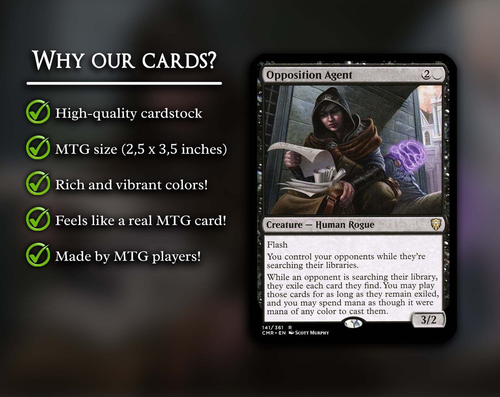 Quality that enchants: Our dedication to quality rivals the steadfastness of a wizard’s spell. Each proxy card is carefully handcrafted and made from premium materials to ensure it meets the highest standards. Trust in our expertise and attention to detail as we offer the same outstanding cardboard quality found in the famous collectible card game “Magic: The Gathering.” This premium material ensures unmatched durability and a satisfying crispness with every move in the game.