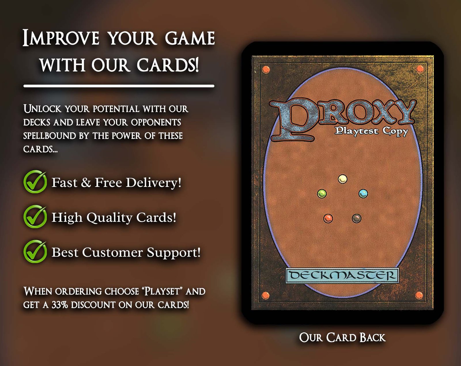 Unlock the full potential of your MTG journey with our remarkable collection of MTG proxies. Harness the power of proxy cards to shape your path to triumph. Order now to dive into the fascinating world of the game!