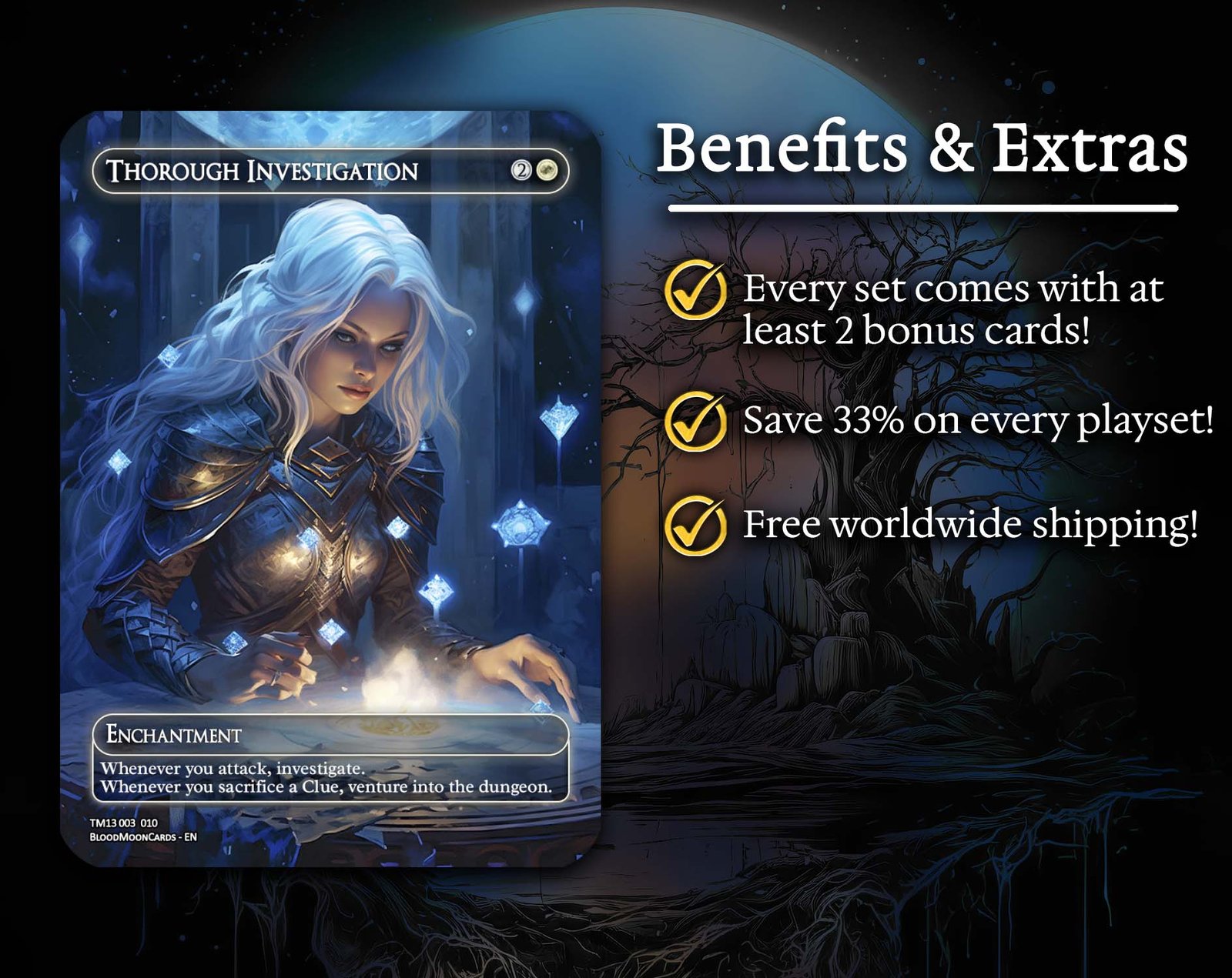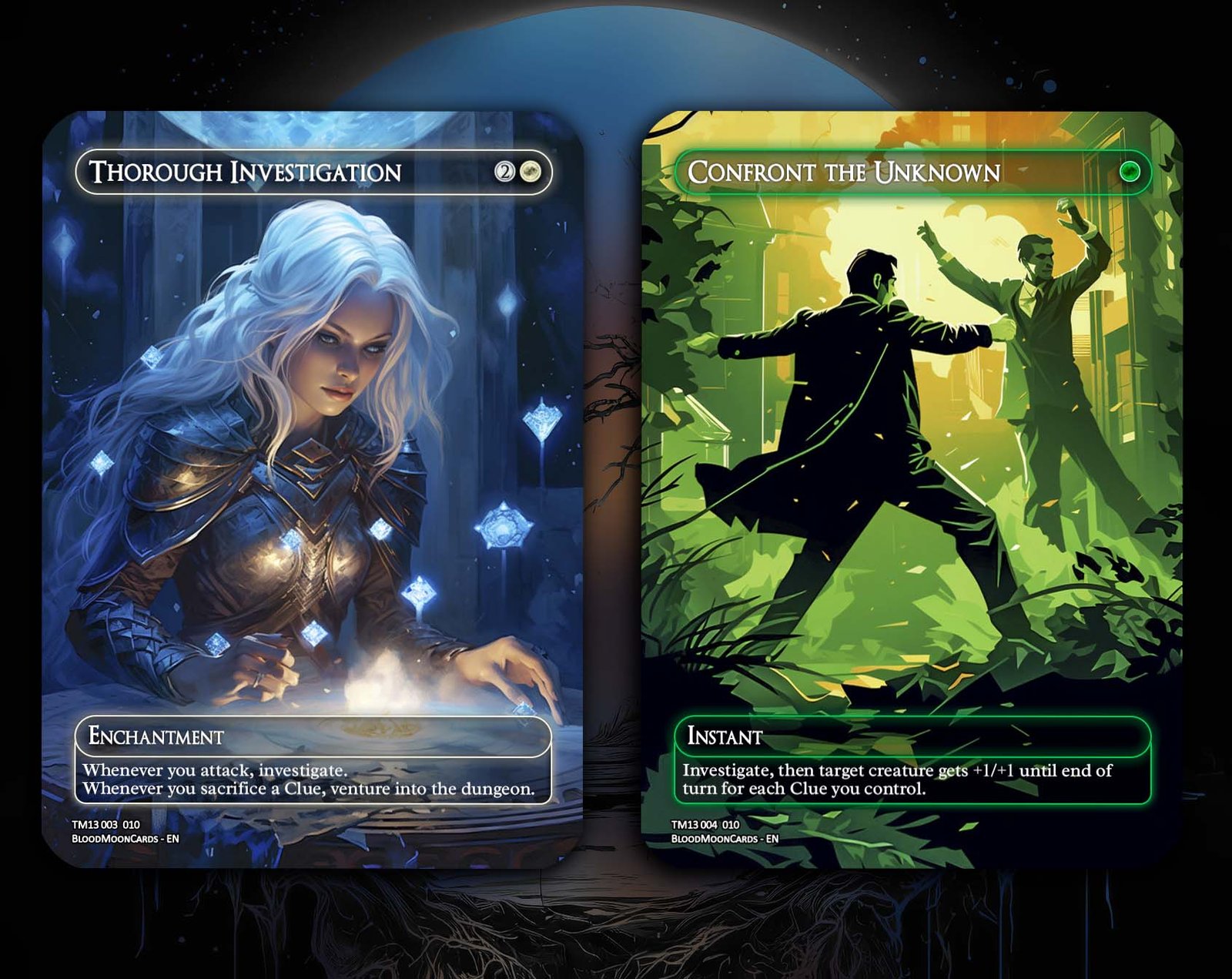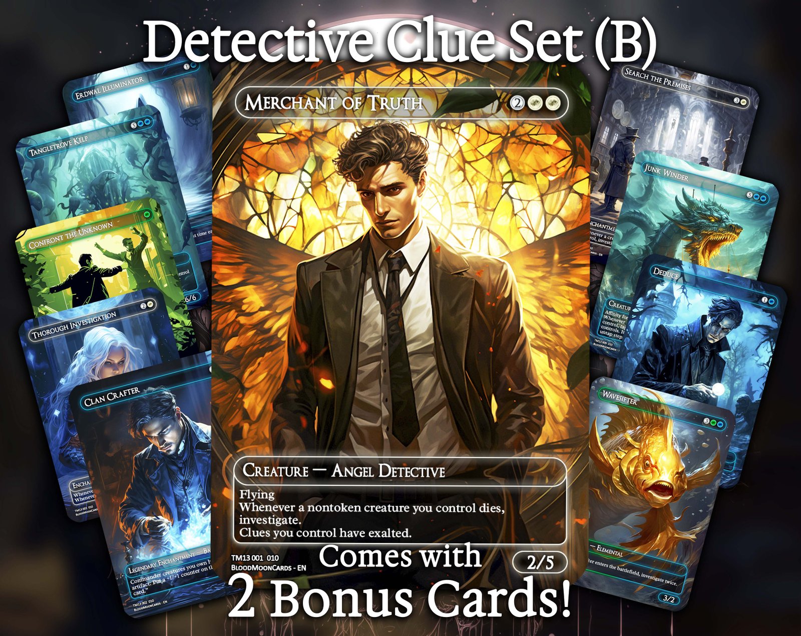 A 12-card bundle centered on Clue tokens, investigation mechanics, and detective synergies. This set expands the investigation theme with new legends, evidence-builders, and support cards that reward you for solving mysteries.