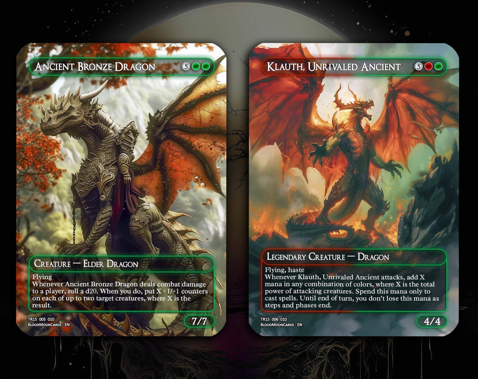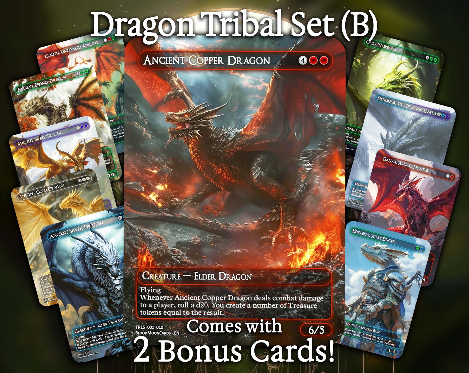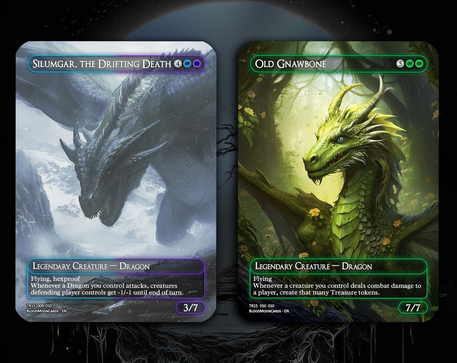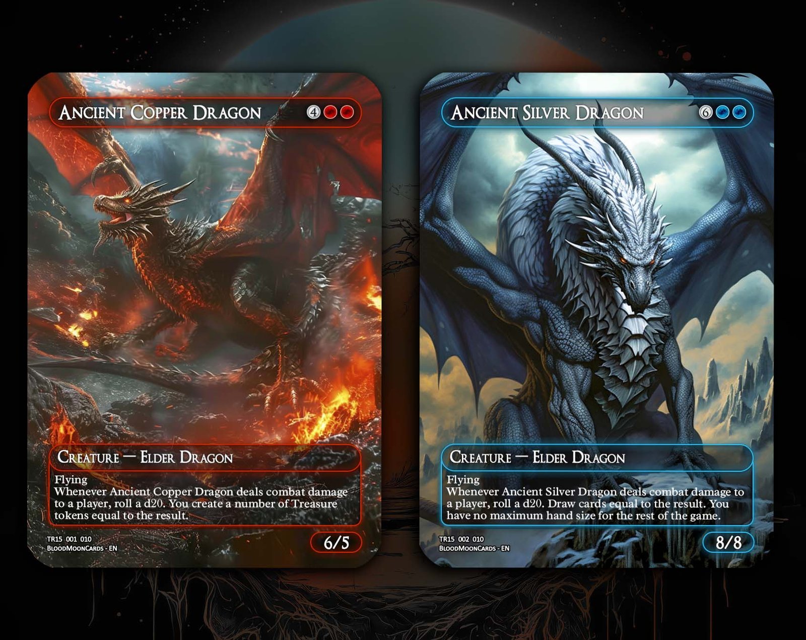 A 12-card set overflowing with the ancient power, mythic presence, and world-shaking might of Dragons. From the five Ancient metallic Dragons to terrifying legends like Tiamat, Old Gnawbone, and Klauth, this set embodies the awe and dominance of these timeless creatures. Command the skies, unleash devastating abilities, and let your Dragons rain fire, treasure, and destruction upon all who stand in your way.
