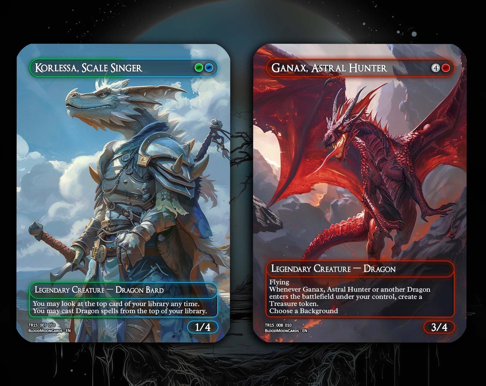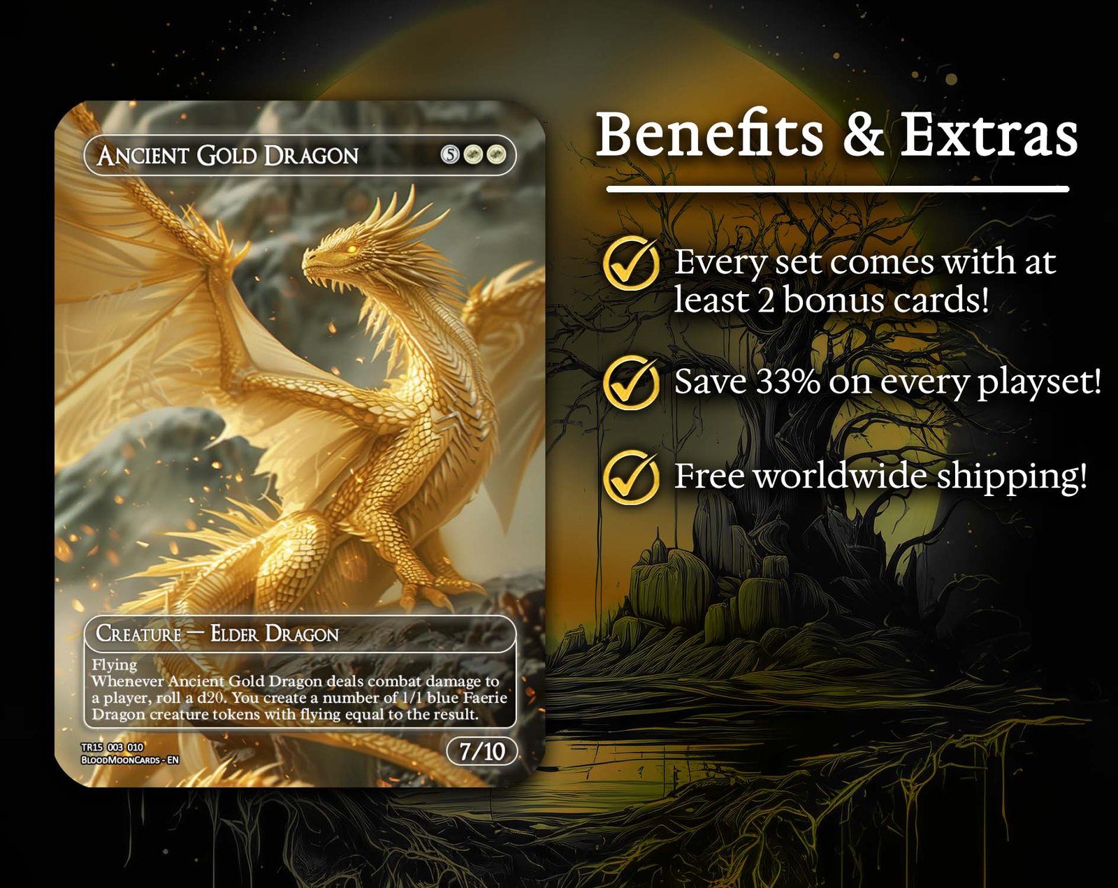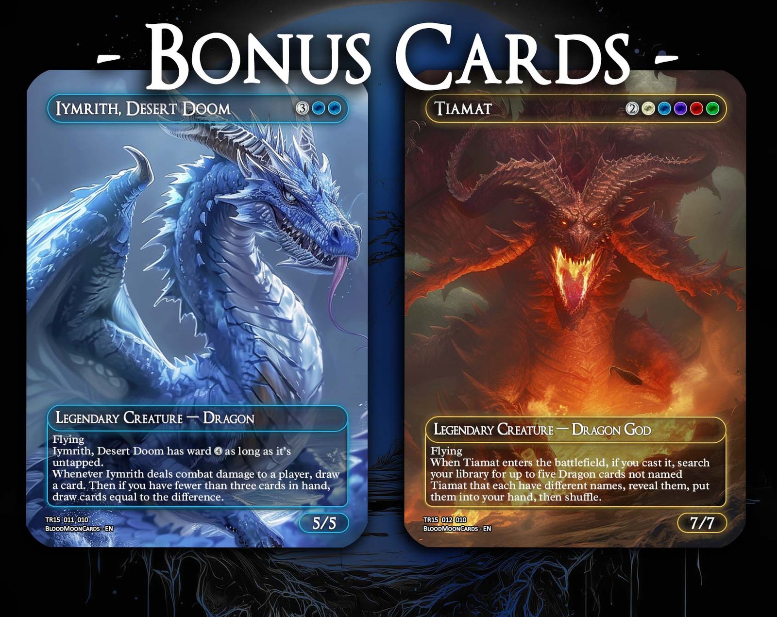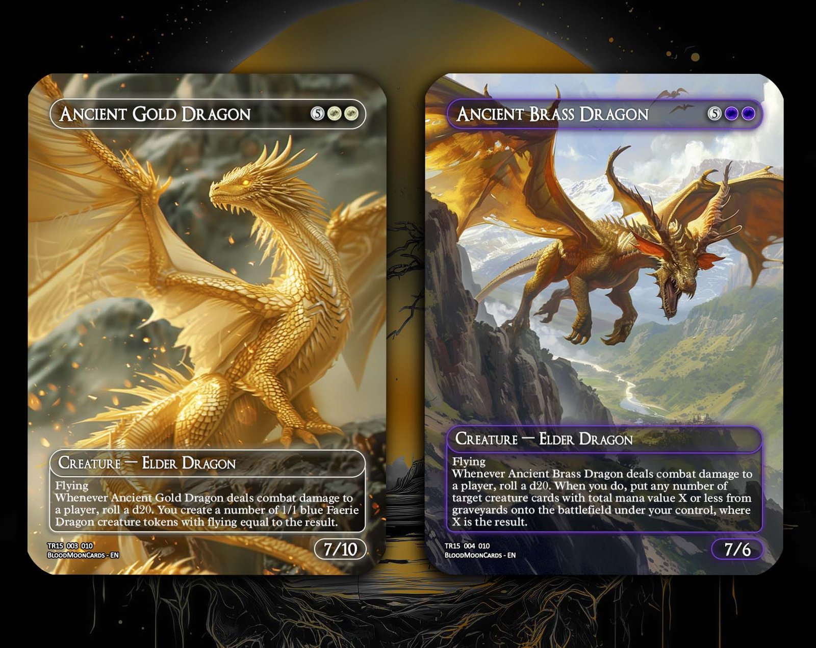 A 12-card set overflowing with the ancient power, mythic presence, and world-shaking might of Dragons. From the five Ancient metallic Dragons to terrifying legends like Tiamat, Old Gnawbone, and Klauth, this set embodies the awe and dominance of these timeless creatures. Command the skies, unleash devastating abilities, and let your Dragons rain fire, treasure, and destruction upon all who stand in your way.