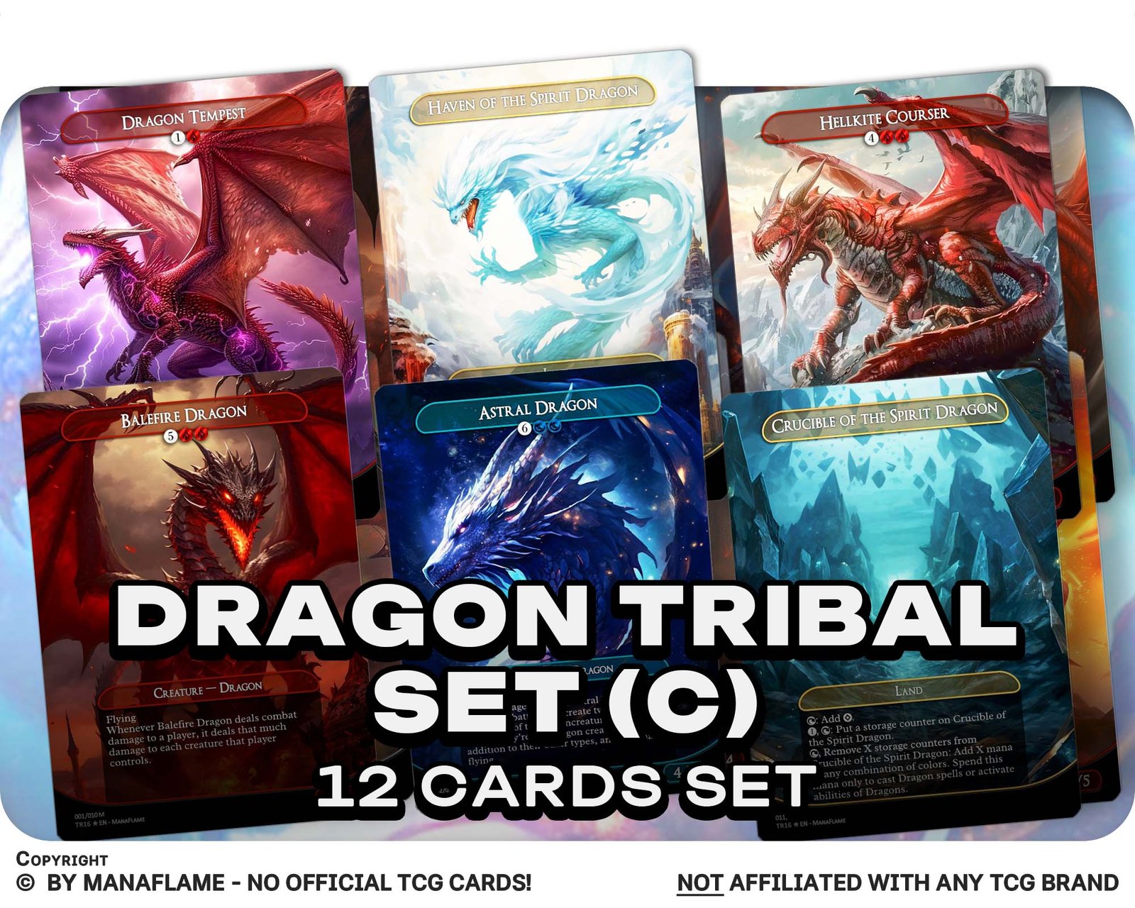 This 12-card set brings together iconic dragon powerhouses and the lands that fuel them. From devastating threats like Balefire Dragon and Terror of the Peaks to tribal enablers such as Dragon Tempest and Crucible of the Spirit Dragon, this set is designed to maximize fiery board presence and overwhelm opponents.