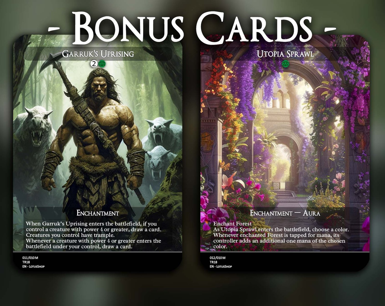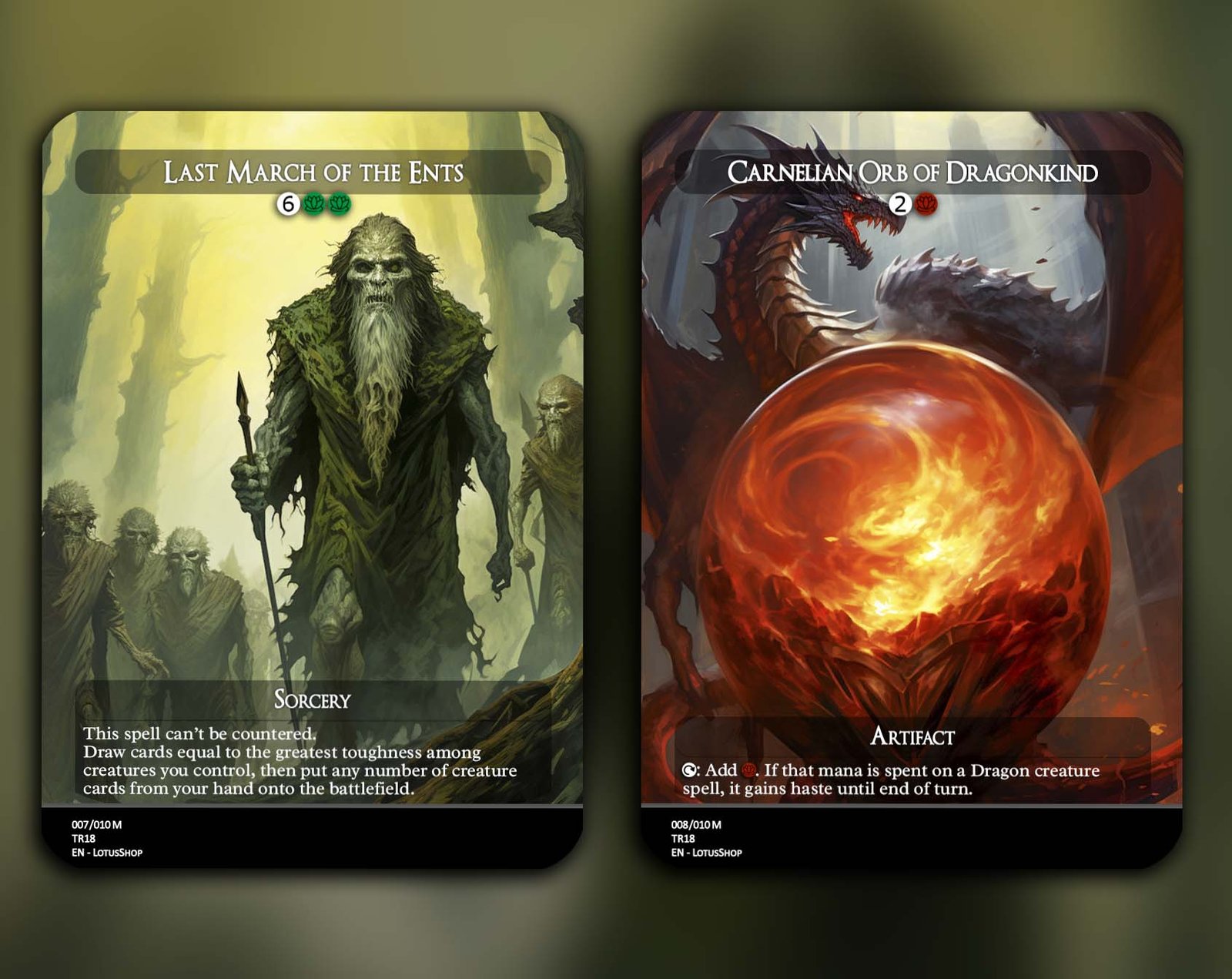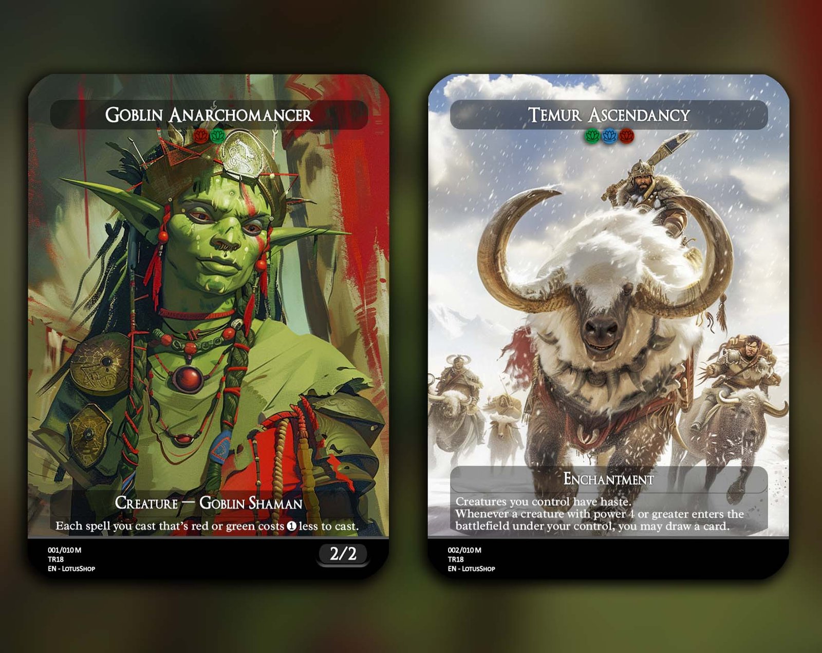 A 12-card support package for Dragon decks, centered on ramp, card advantage, and enablers that make your Dragons hit harder and faster. From Goblin Anarchomancer and Orbs of Dragonkind for mana acceleration to Temur Ascendancy and Garruk’s Uprising for card draw and trample, this set amplifies your Dragon synergies while adding resilience with powerful staples like The Great Henge and Last March of the Ents.