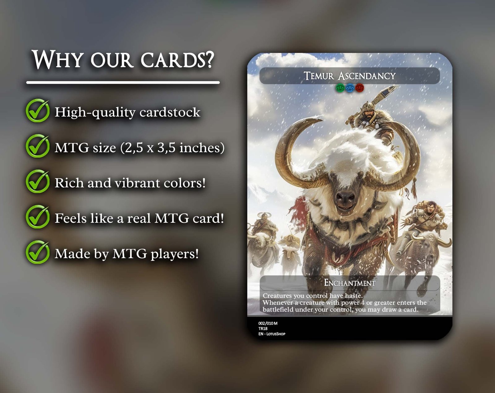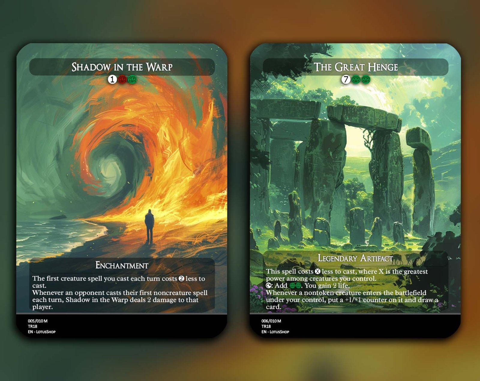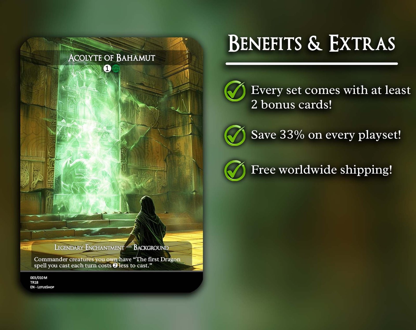 A 12-card support package for Dragon decks, centered on ramp, card advantage, and enablers that make your Dragons hit harder and faster. From Goblin Anarchomancer and Orbs of Dragonkind for mana acceleration to Temur Ascendancy and Garruk’s Uprising for card draw and trample, this set amplifies your Dragon synergies while adding resilience with powerful staples like The Great Henge and Last March of the Ents.