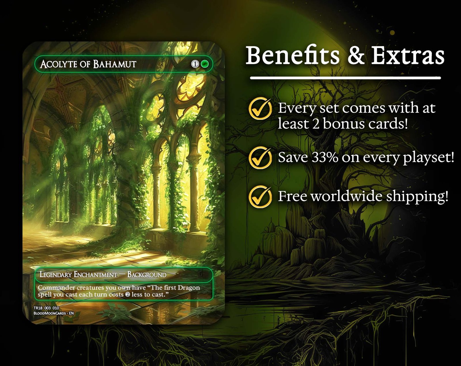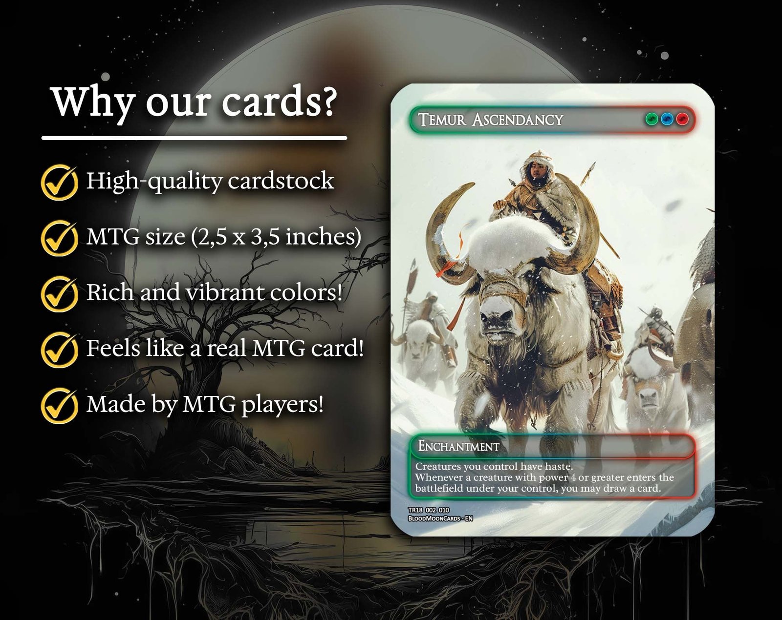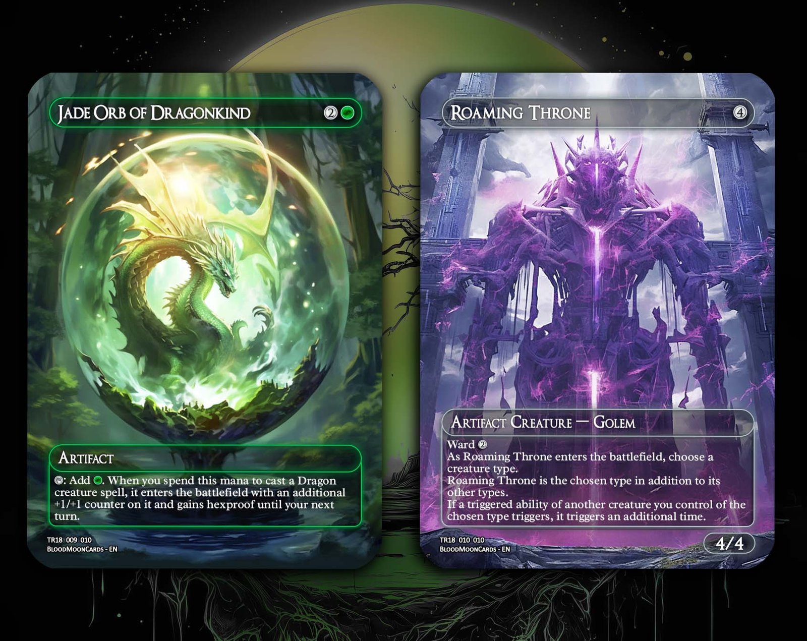 A 12-card set focusing on the support, ramp, and synergies that empower Dragon decks to reach their full potential. From mana accelerators like Goblin Anarchomancer and the Dragonkind Orbs to draw engines such as Temur Ascendancy and Garruk’s Uprising, this set provides the backbone every Dragon commander craves. With board wipes, legendary artifacts, and scaling enchantments, your Dragons will enter the battlefield faster, stronger, and more overwhelming than ever.
