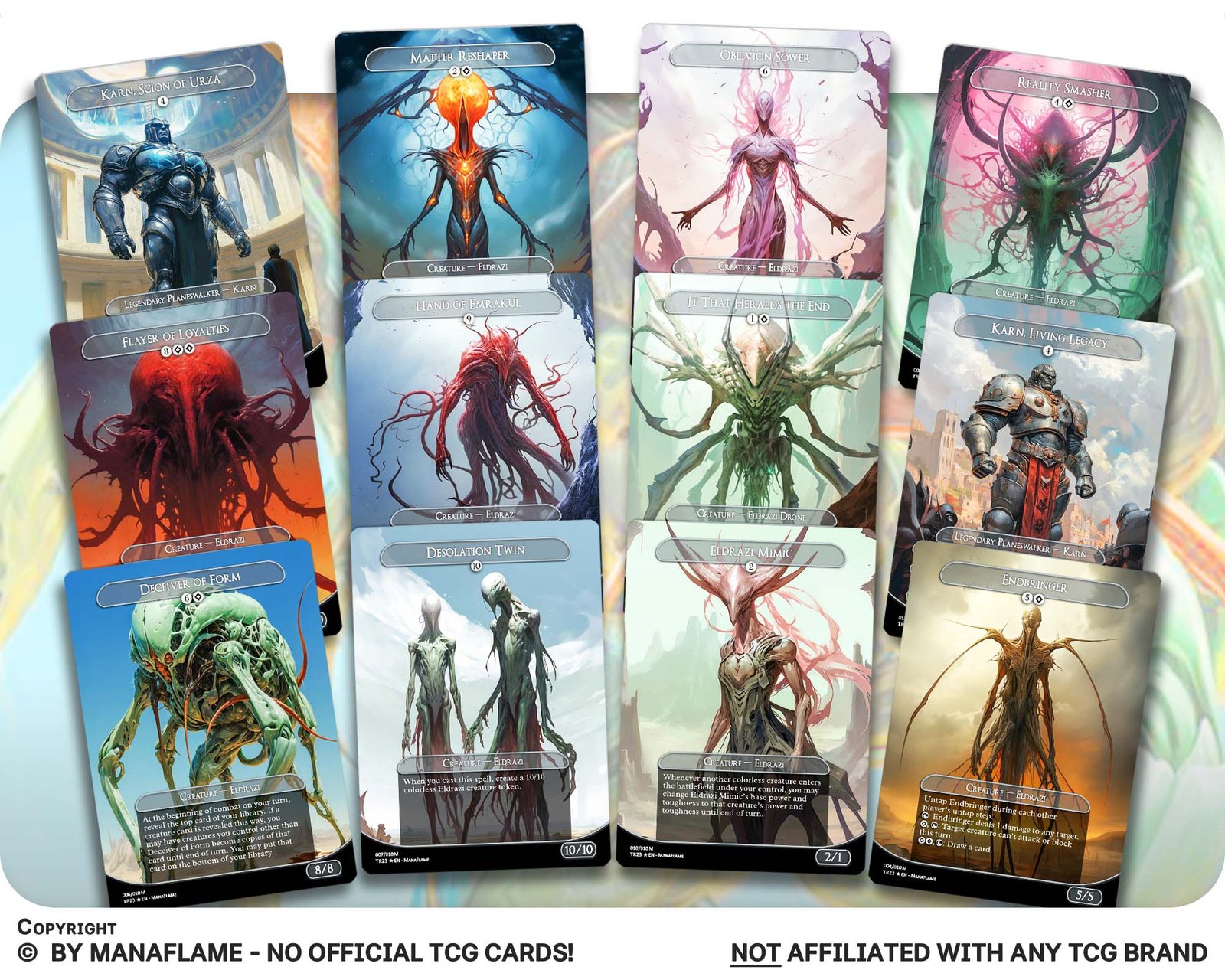 This 12-card set features some of the most fearsome midrange Eldrazi and their allies, bringing annihilation and inevitability to the battlefield. From the devastating Reality Smasher and Endbringer to titanic threats like Desolation Twin and Flayer of Loyalties, every card here fuels the alien, unstoppable machine of the Blind Eternities. Even Karn, Scion of Urza and Karn, Living Legacy join in, adding artifact-driven power to the cosmic swarm.