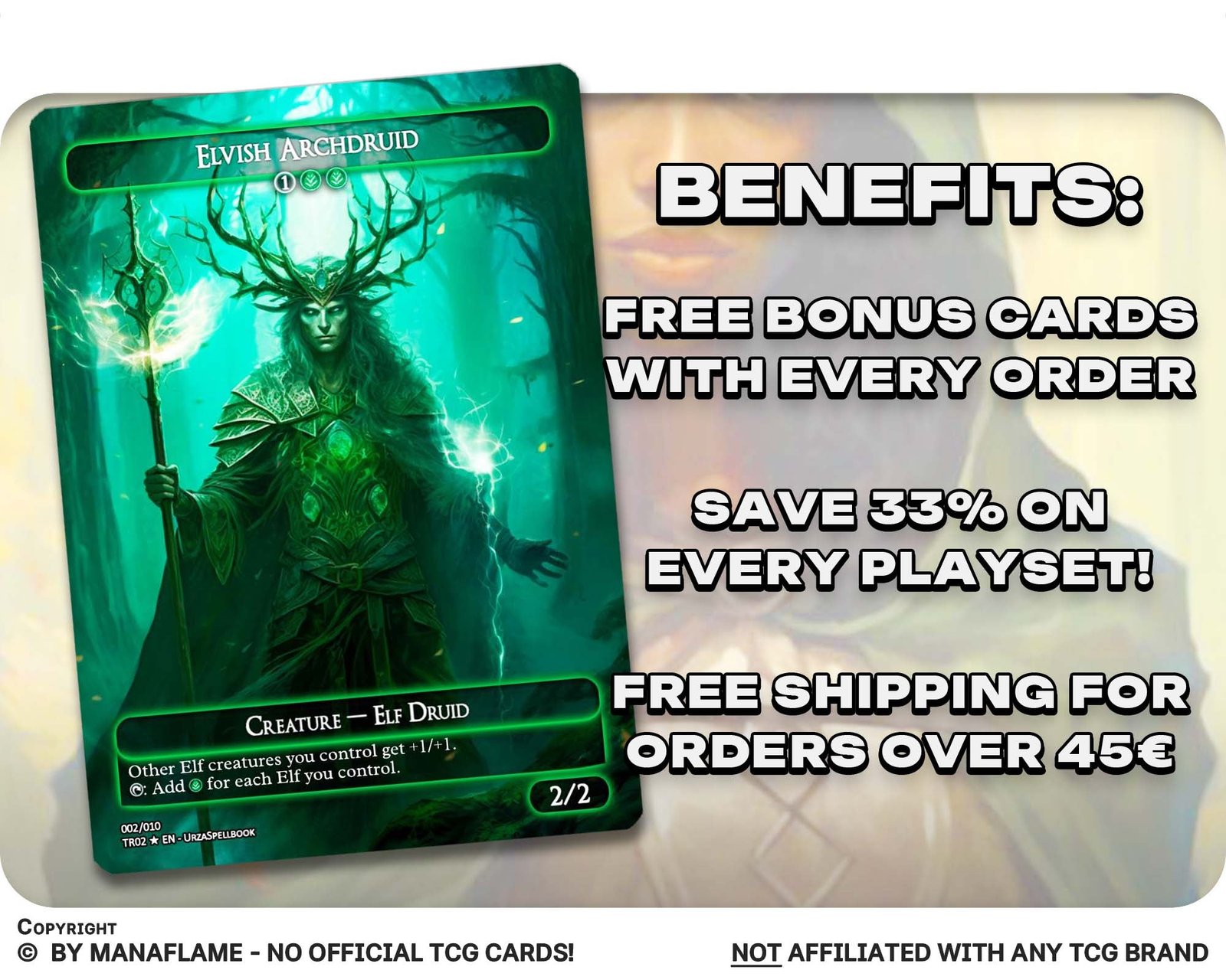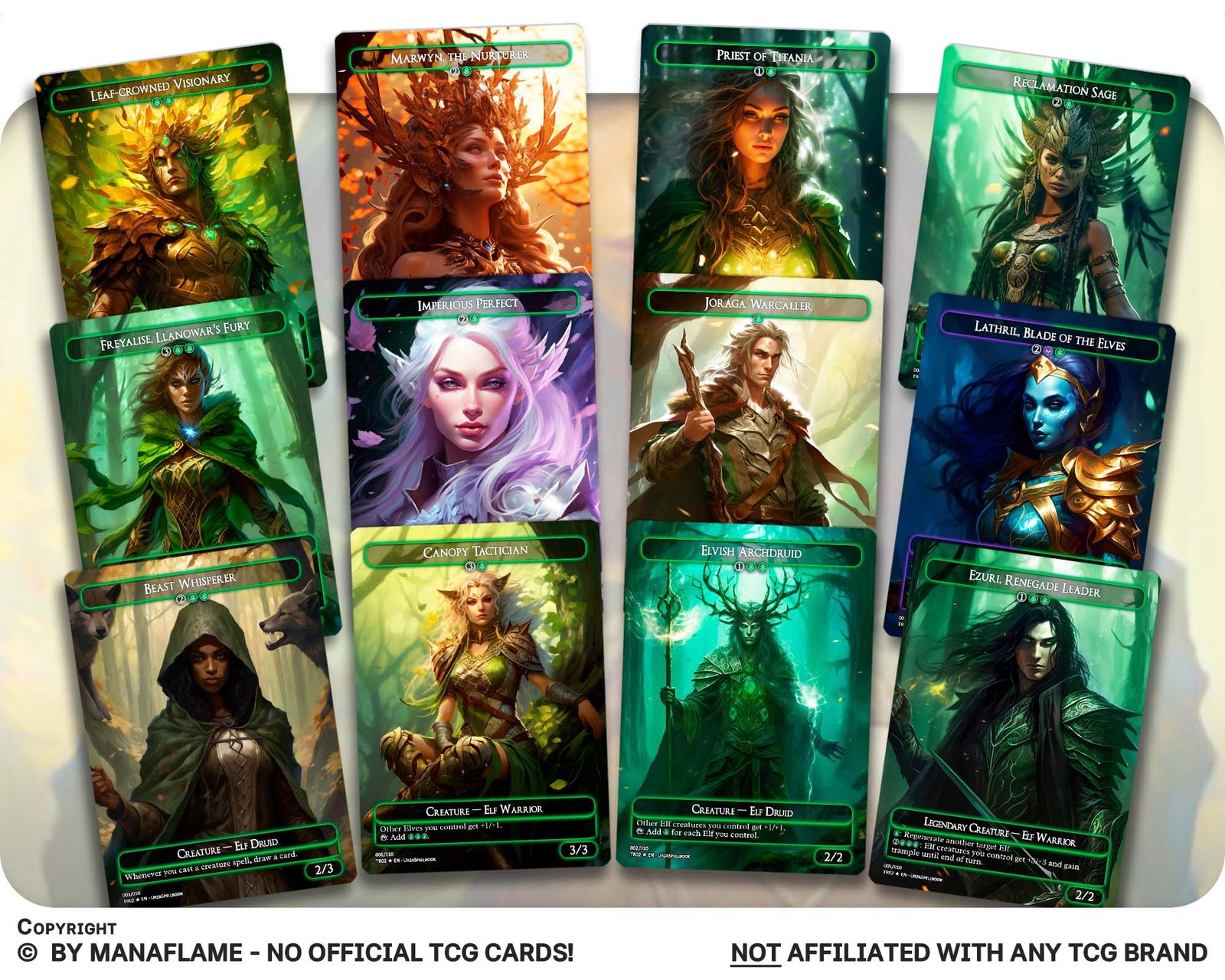 A 12-card collection of Elf tribal staples — featuring legendary leaders, mana engines, lords, and card-advantage pieces. Perfect for proxy enthusiasts who want to swarm the battlefield, generate massive mana, and overwhelm opponents with the endless strength of the elves.