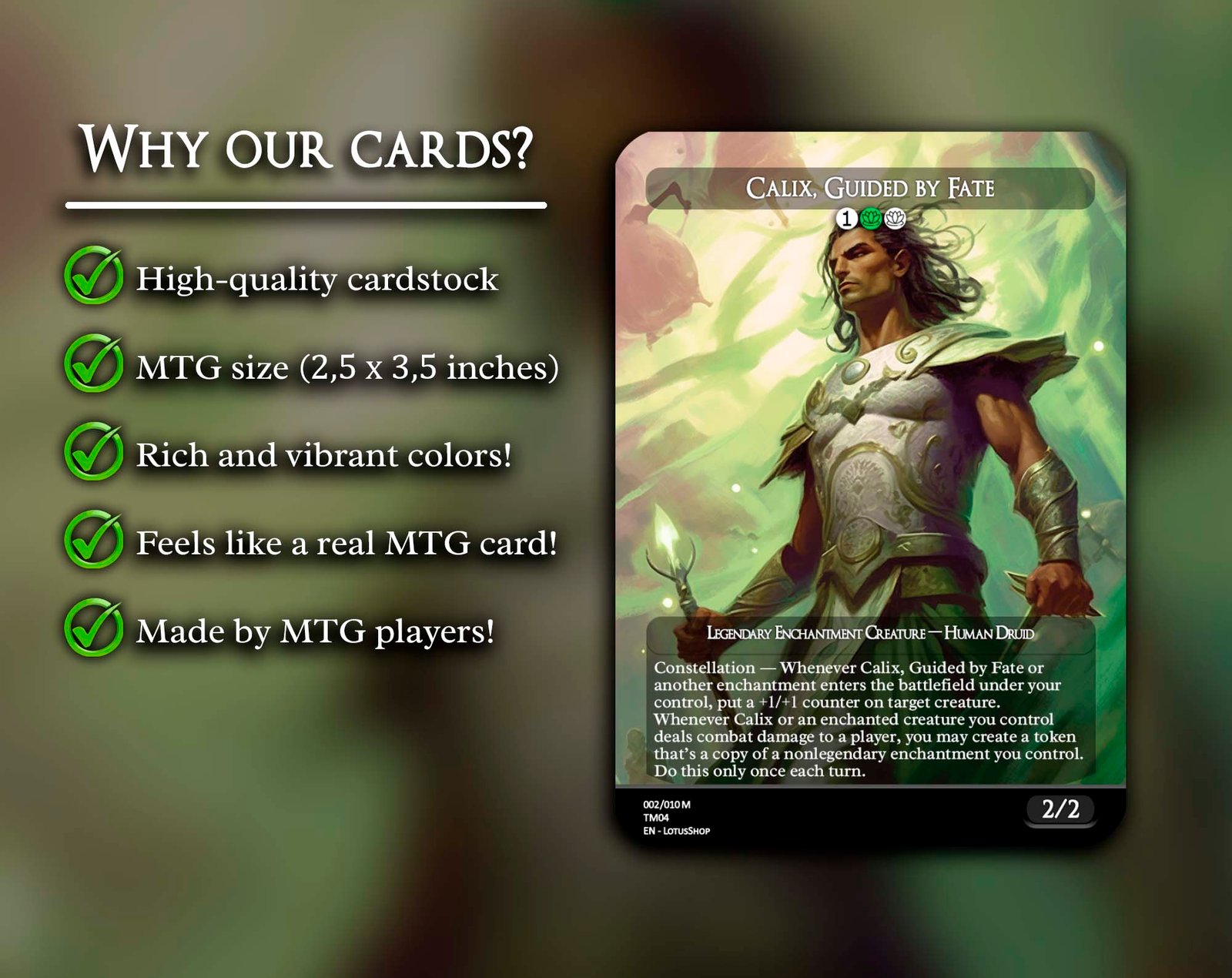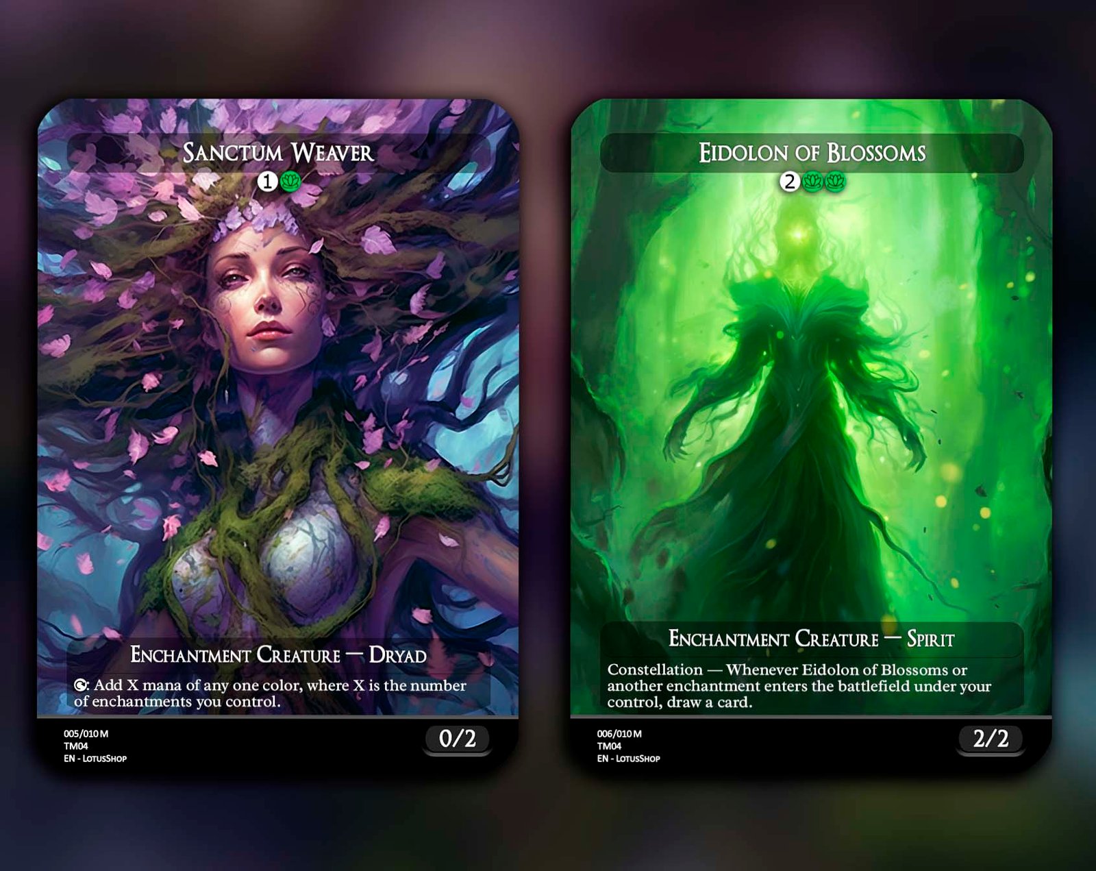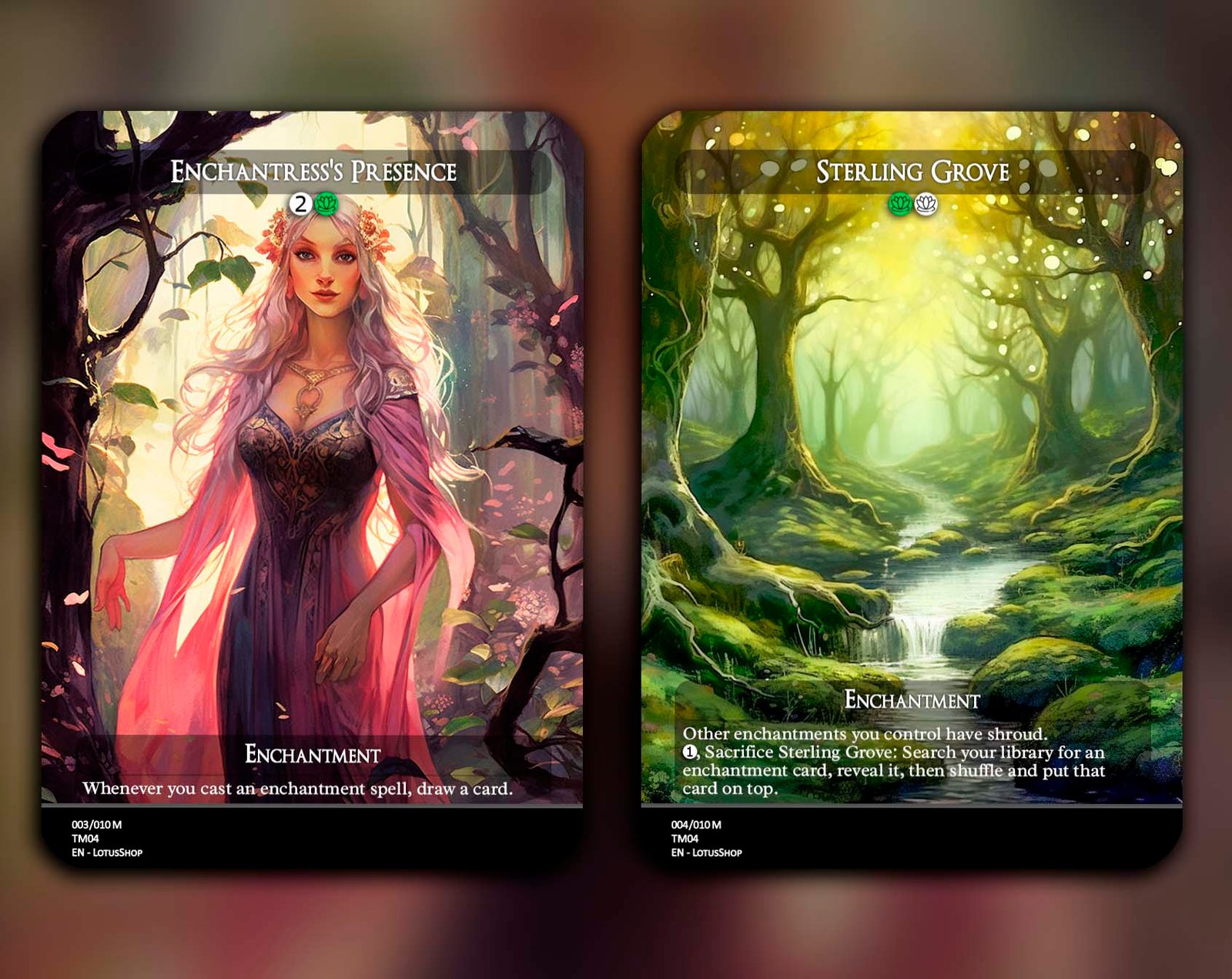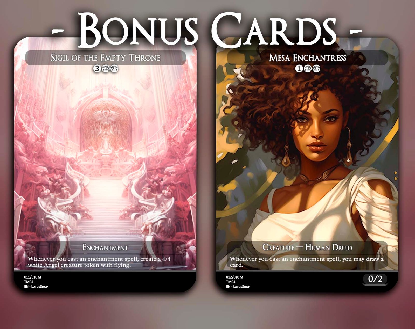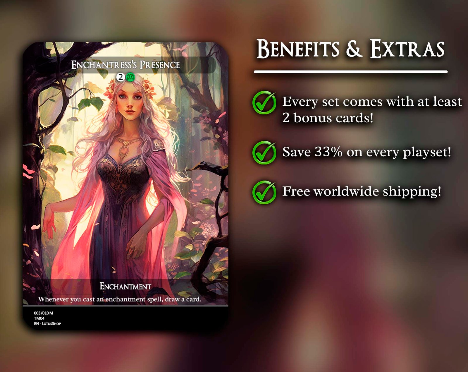 This 12-card bundle celebrates the enchantment archetype with the most iconic Enchantress creatures and support pieces ever printed. Draw cards with every enchantment you cast, ramp explosively, and overwhelm the board with value. Core engines like Sythis, Harvest’s Hand, Argothian Enchantress, and Mesa Enchantress keep your hand full, while payoff cards such as Sigil of the Empty Throne and Setessan Champion turn enchantments into board dominance.