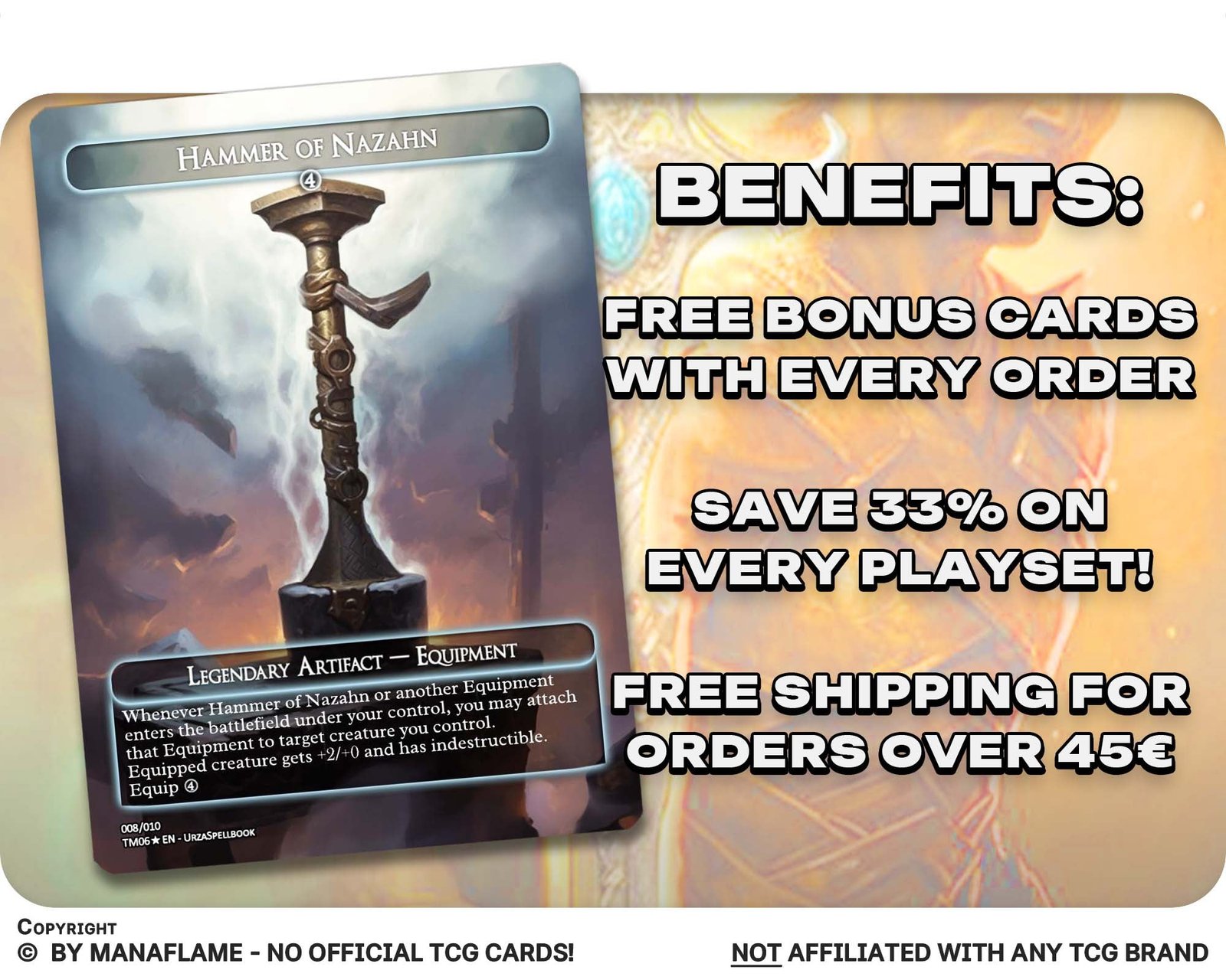 A 12-card collection of equipment staples and support pieces — from iconic swords and legendary gear to tutors and synergy engines. Perfect for proxy enthusiasts who want to forge powerful battlefields and maximize the strength of their equipped creatures.