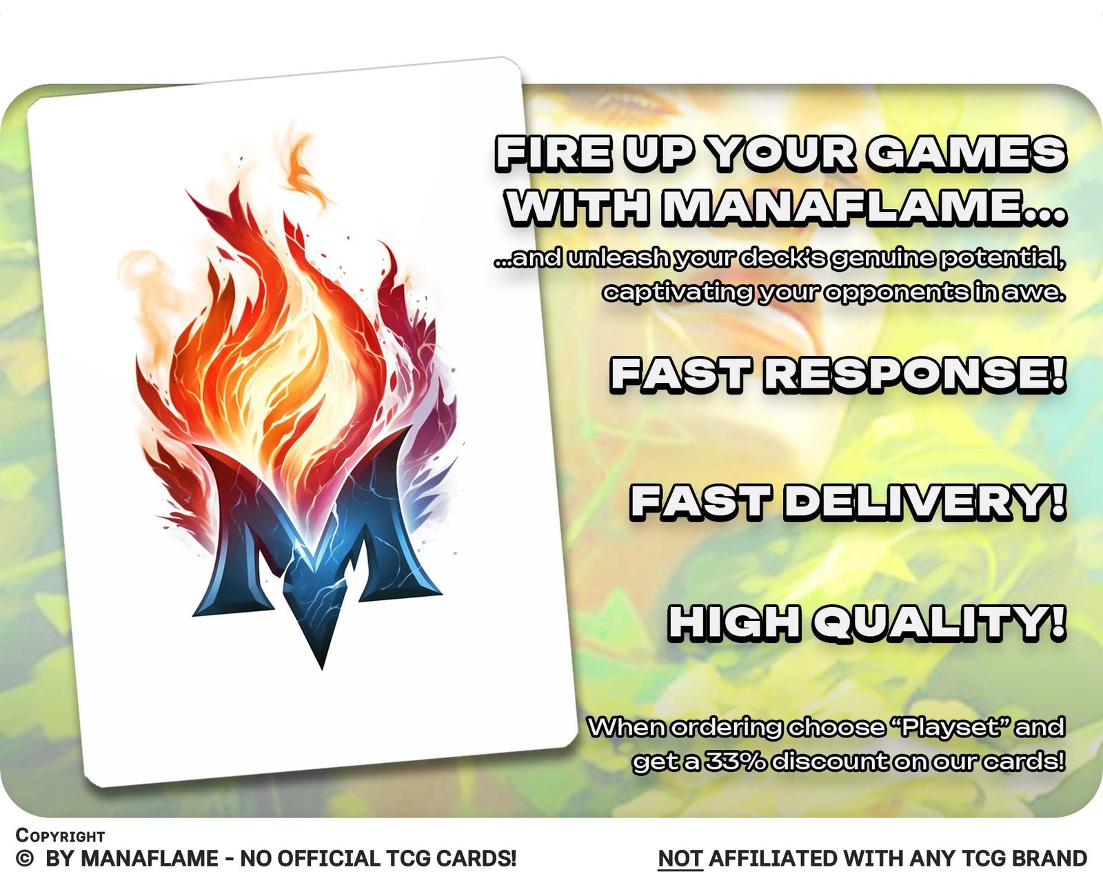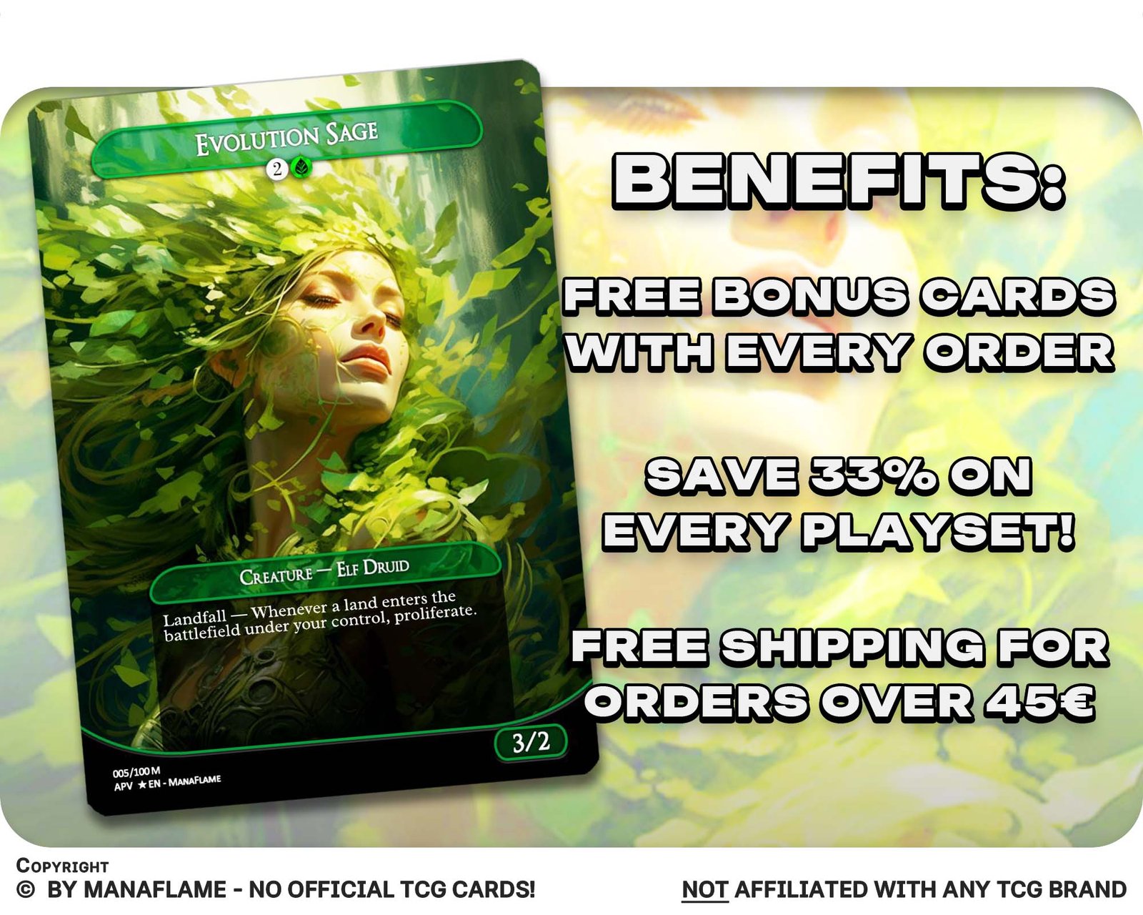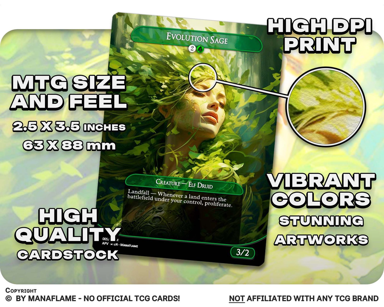 Includes 1 high-quality ManaFlame custom card of “Evolution Sage”, crafted with great attention to detail.