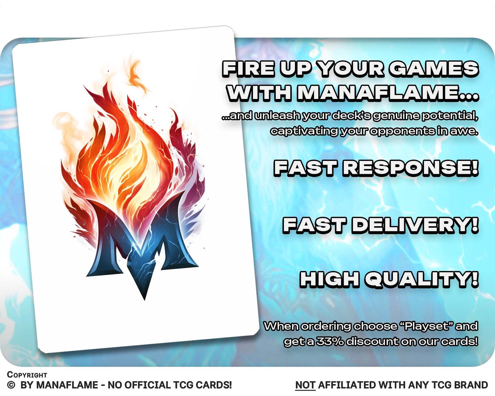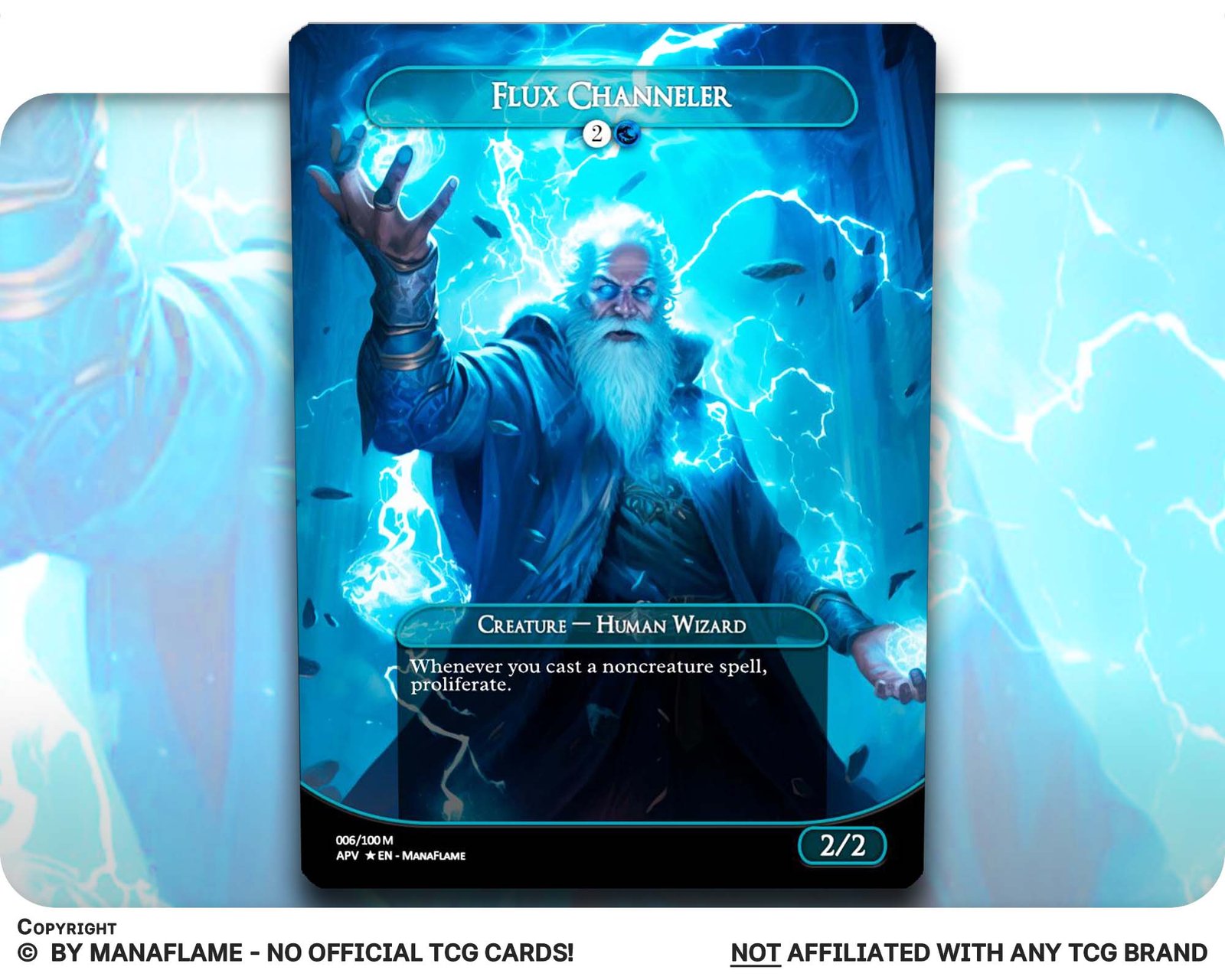 Includes 1 high-quality ManaFlame custom card of “Flux Channeler”, crafted with great attention to detail.