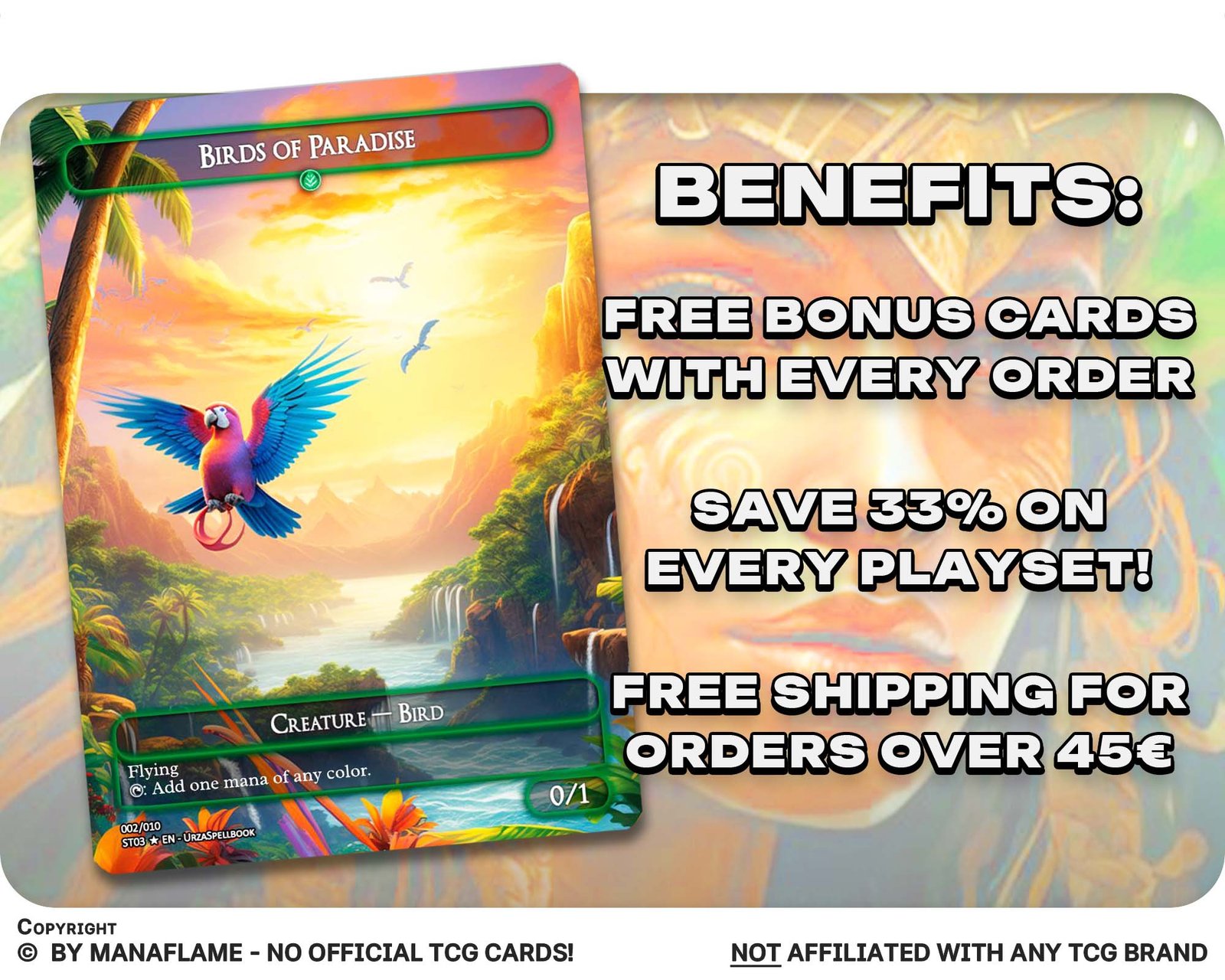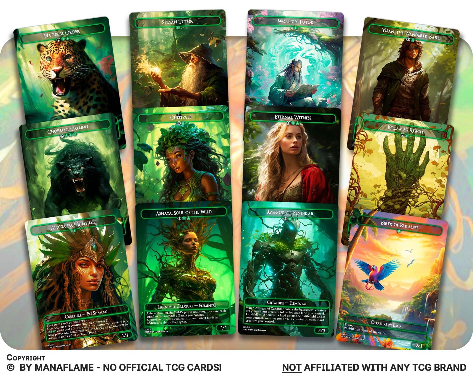 A 12-card collection of green’s most iconic staples — ramp, tutors, recursion, and massive threats. Perfect for proxy enthusiasts who want to channel green’s strengths: explosive mana, resilient creatures, and overwhelming board presence.