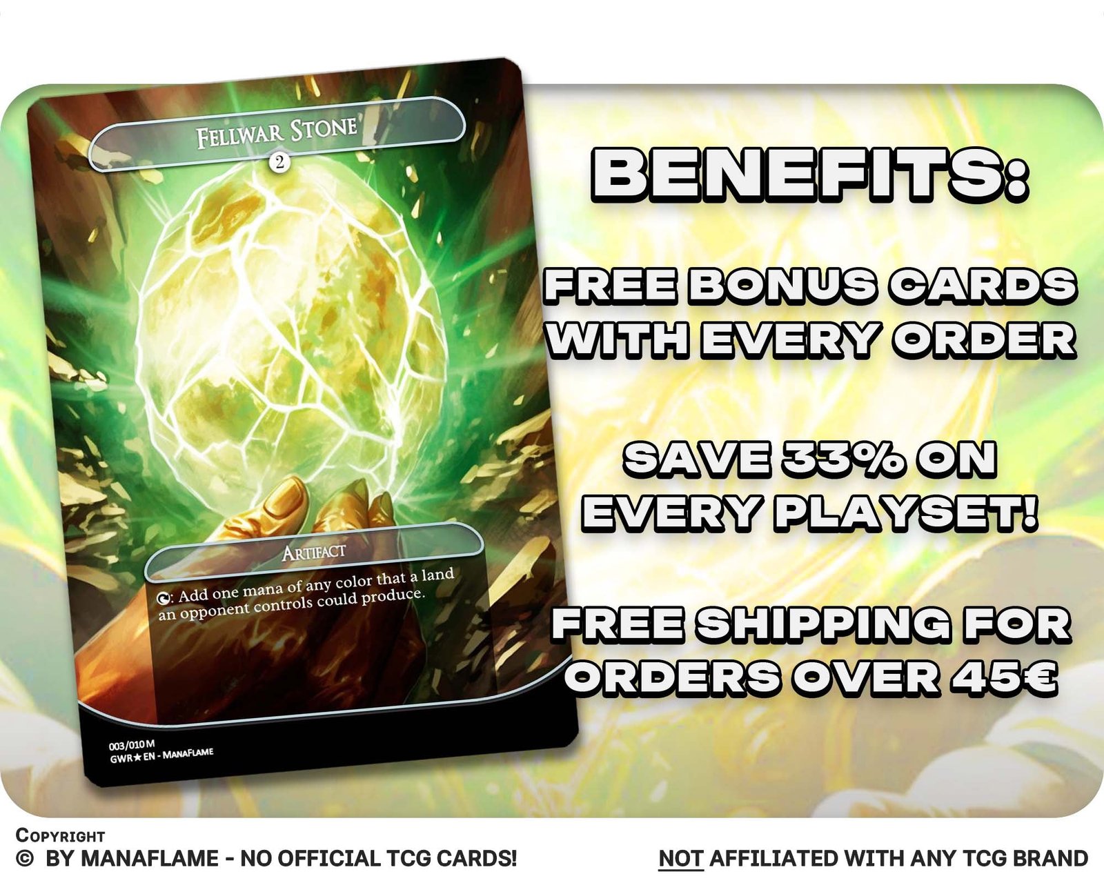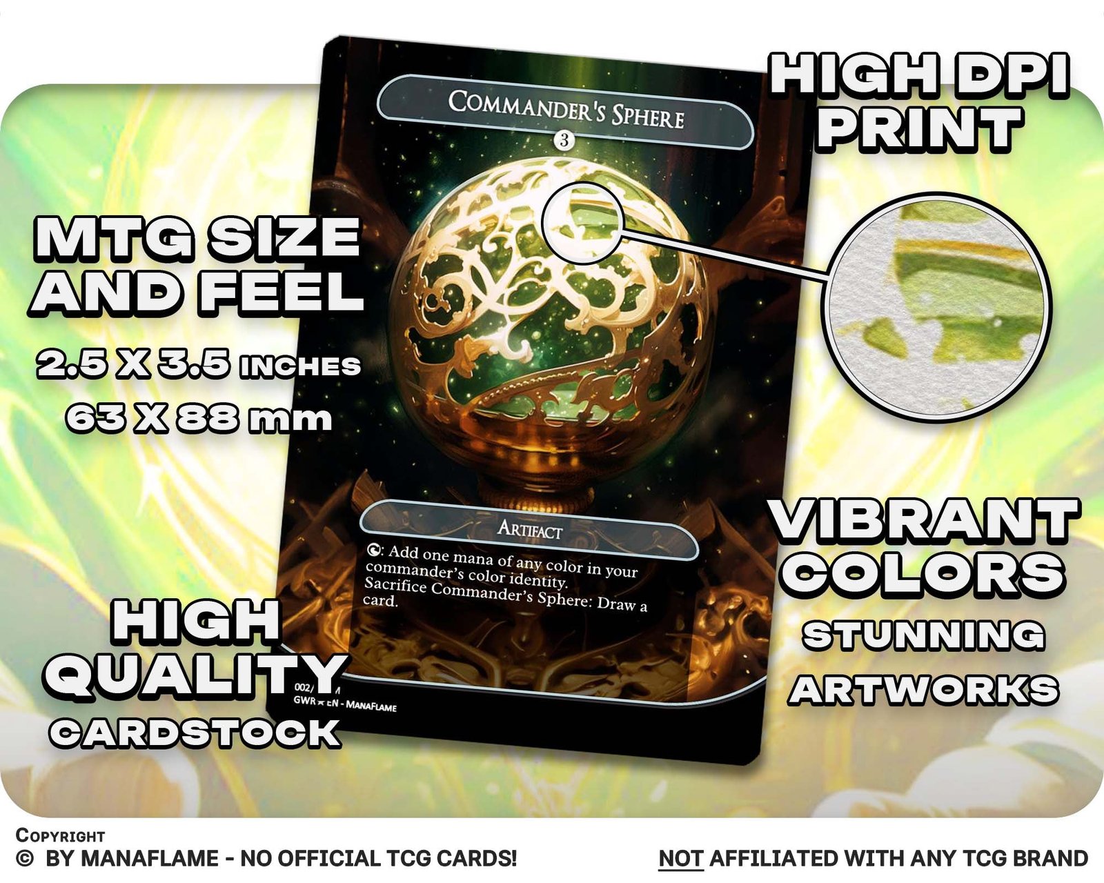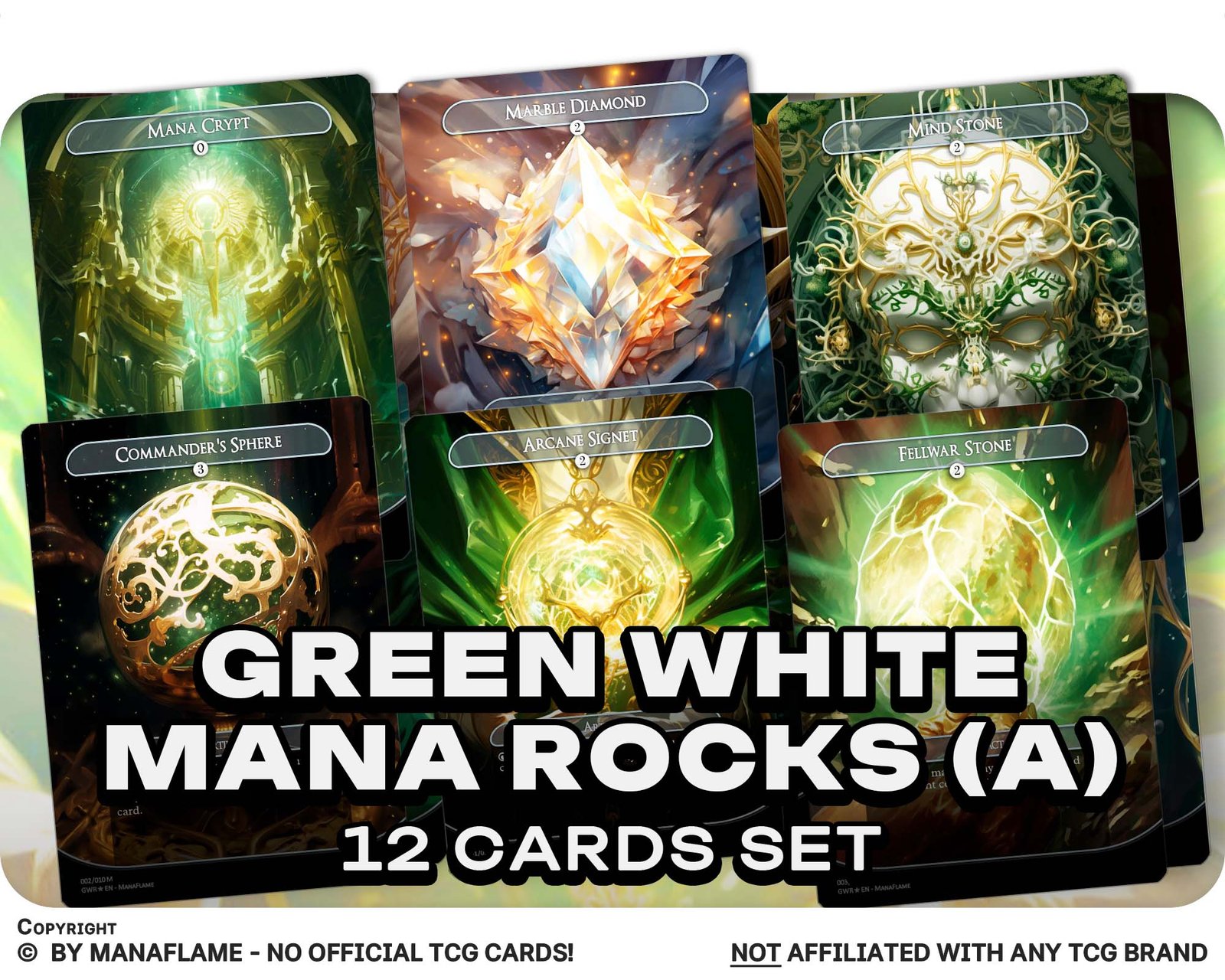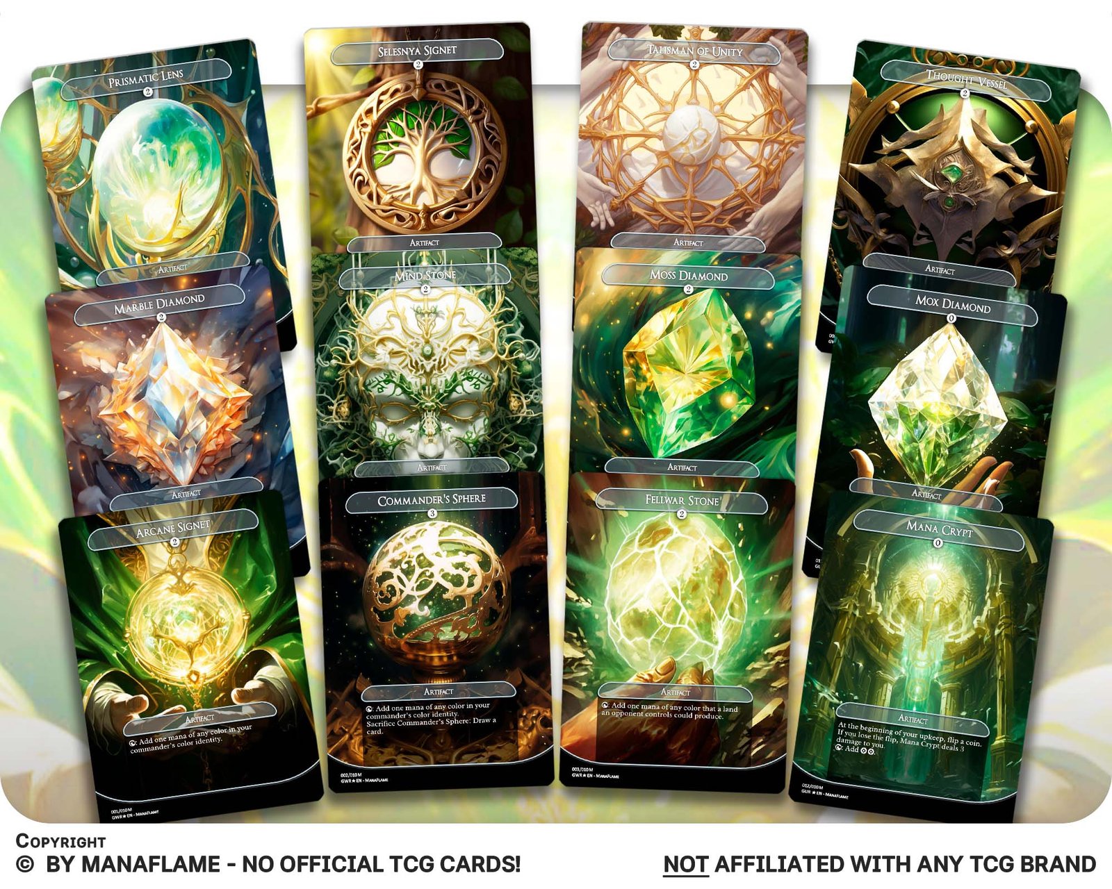 This 12-card set brings together staple mana rocks for green-white decks, reimagined as ManaFlame proxies. Perfect for Selesnya Commander builds, ramp strategies, or anyone who wants reliable acceleration and fixing.