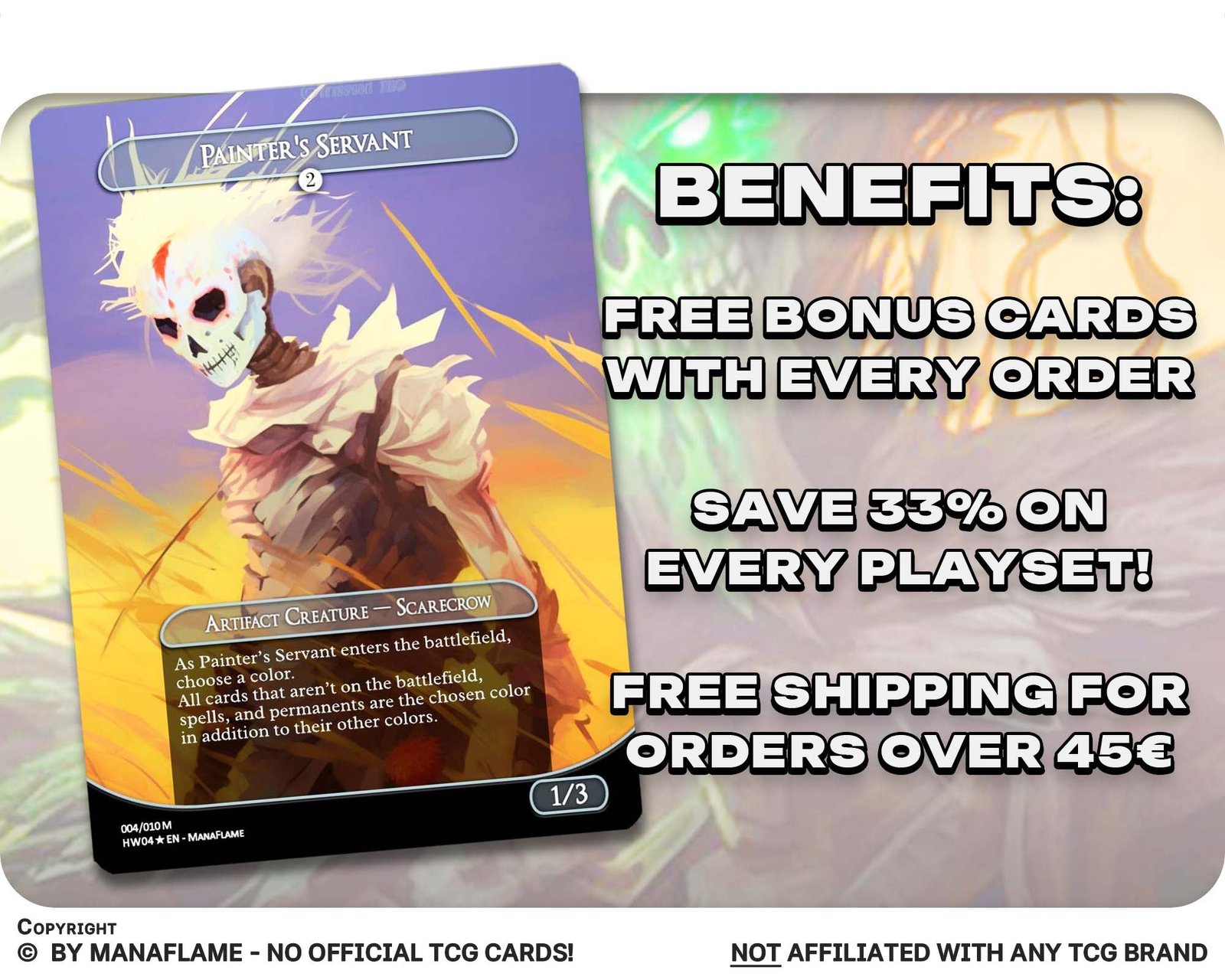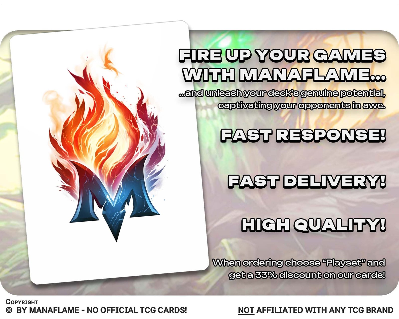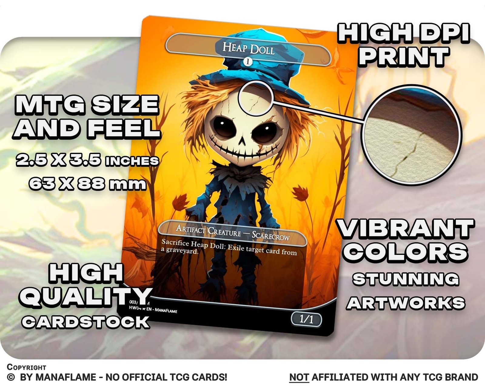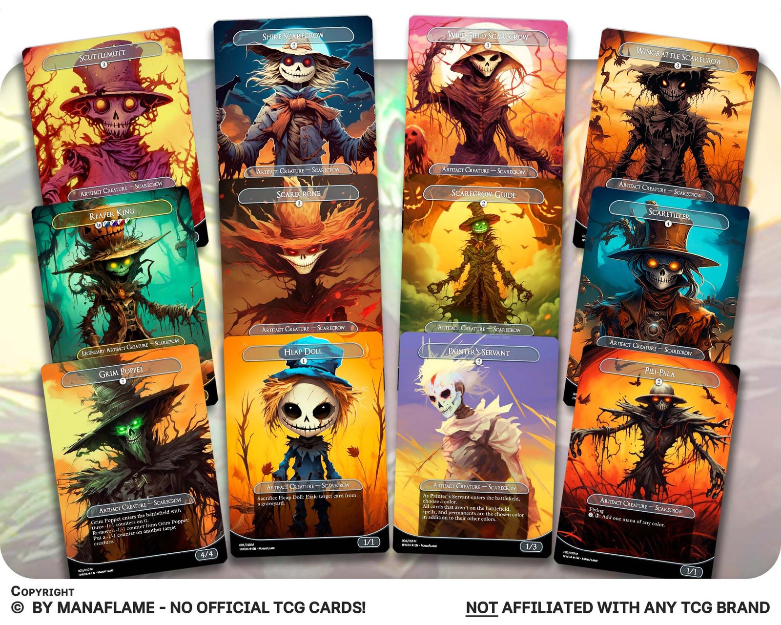 This 12-card set brings the eerie world of scarecrows and harvest horrors to life, reimagined as ManaFlame proxies. Perfect for Halloween tables, Reaper King tribal decks, or collectors who love the unsettling charm of stitched guardians.