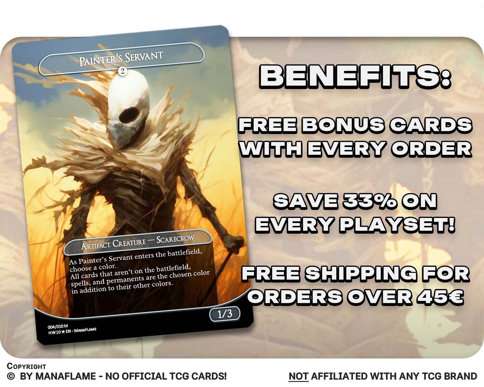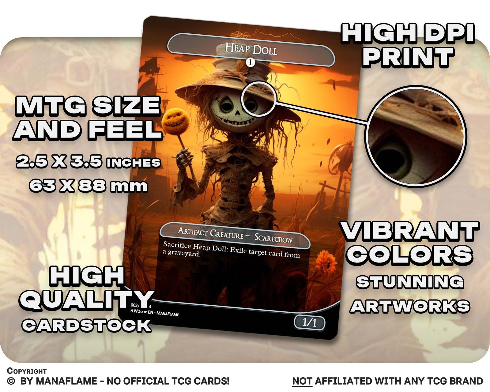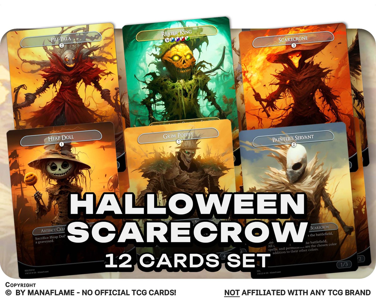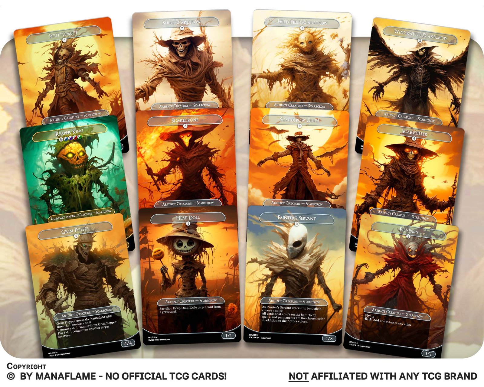 A creepy 12-card set of scarecrows and harvest horrors, reimagined as ManaFlame proxies. Perfect for Reaper King decks, Halloween tribal nights, or collectors who love the eerie charm of these stitched guardians.