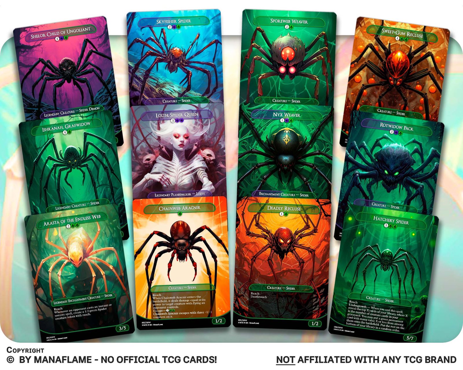 This 12-card set spins a web of terror with spider-themed legends and creatures, reimagined as ManaFlame proxies. Perfect for Halloween nights, creepy-crawly Commander brews, or collectors who love the eight-legged horrors of Magic.