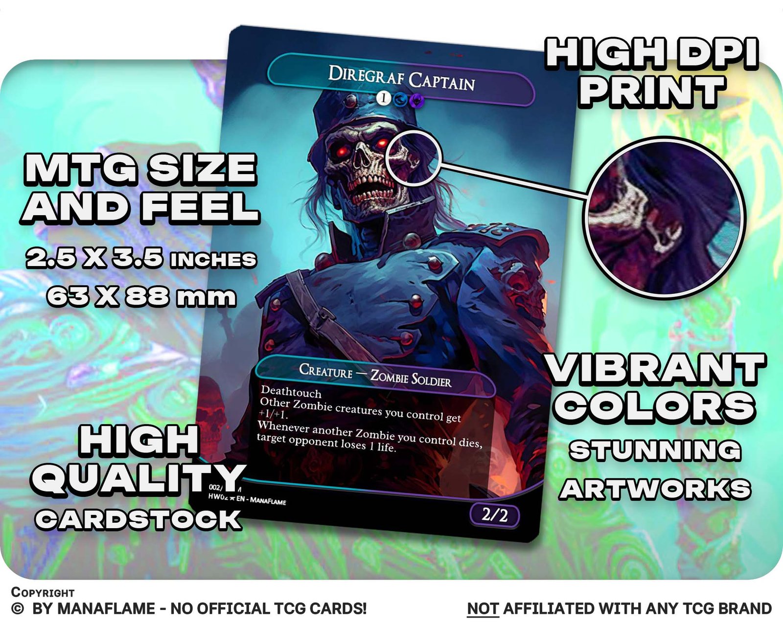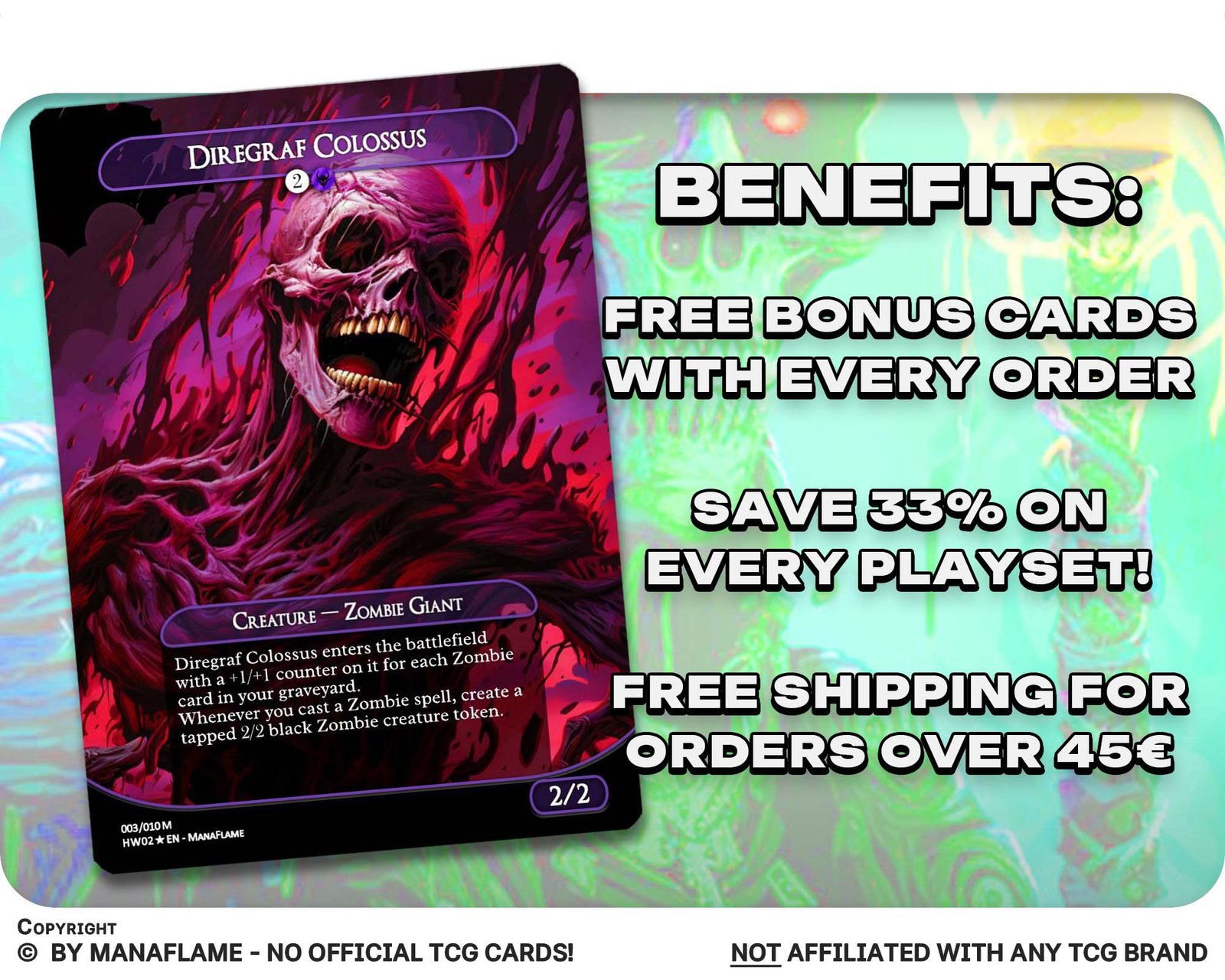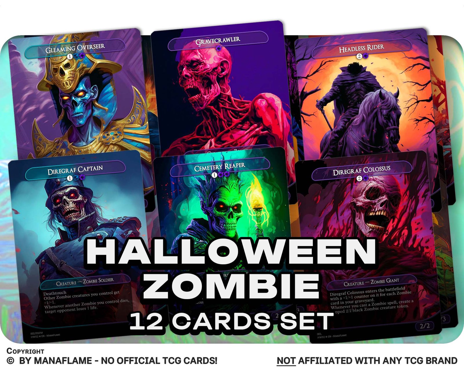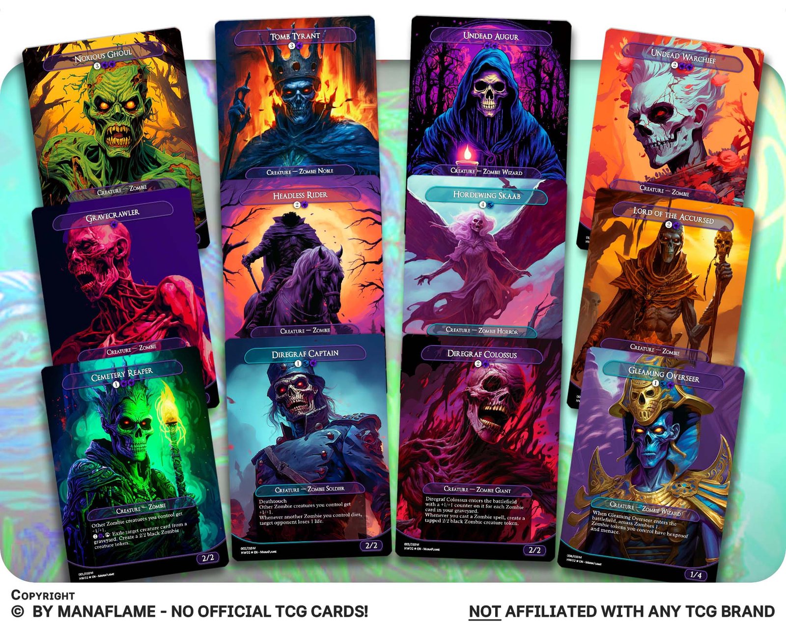 This 12-card set unleashes a horde of undead terrors, reimagined as ManaFlame proxies. Perfect for Zombie tribal decks, Halloween Commander nights, or collectors who love the shambling horror of the grave.