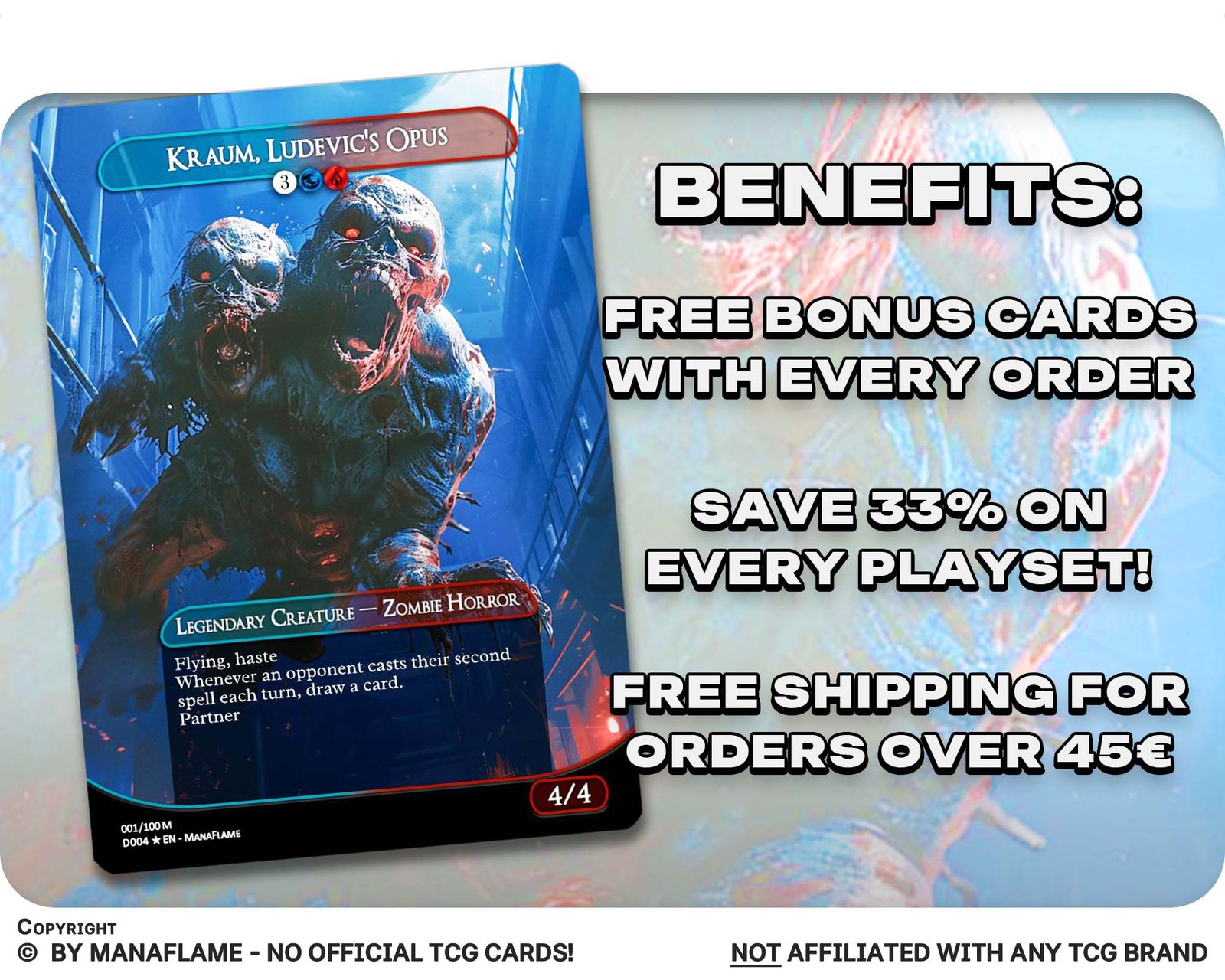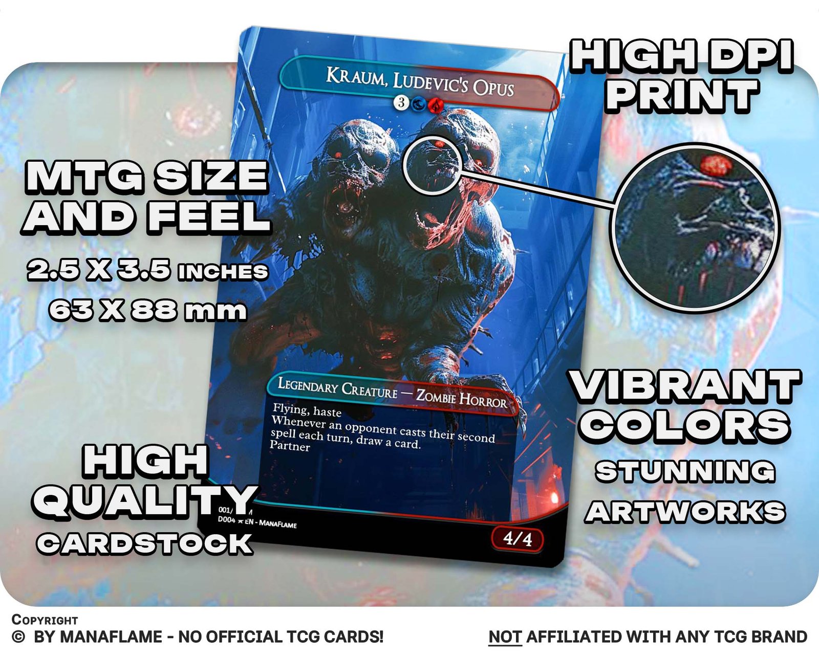 Includes 1 high-quality ManaFlame custom card of “Kraum, Ludevic’s Opus”, crafted with great attention to detail.