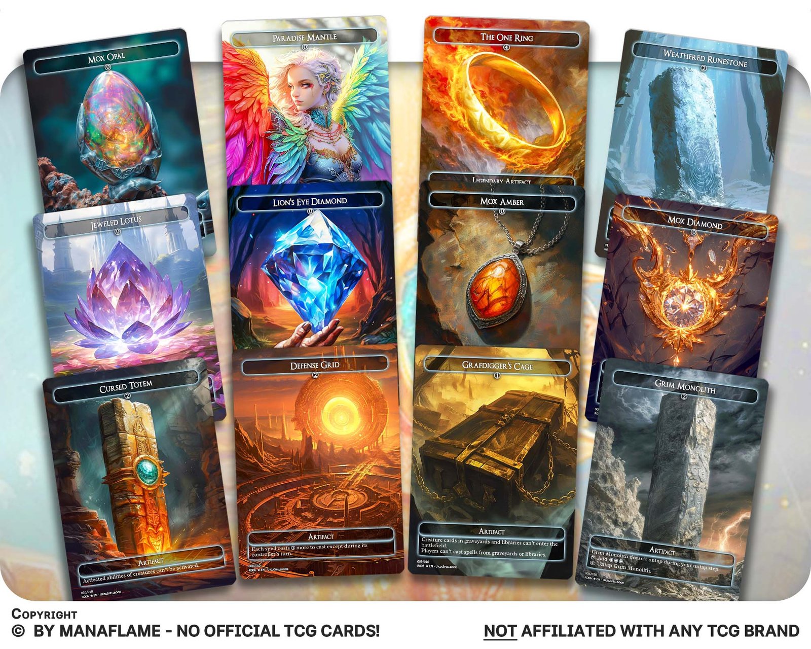 A premium 12-card mix of iconic mana artifacts, explosive accelerants, and disruptive utility pieces. This set blends fast ramp with powerful hate artifacts, making it perfect for proxy enthusiasts who want both speed and control in their decks.