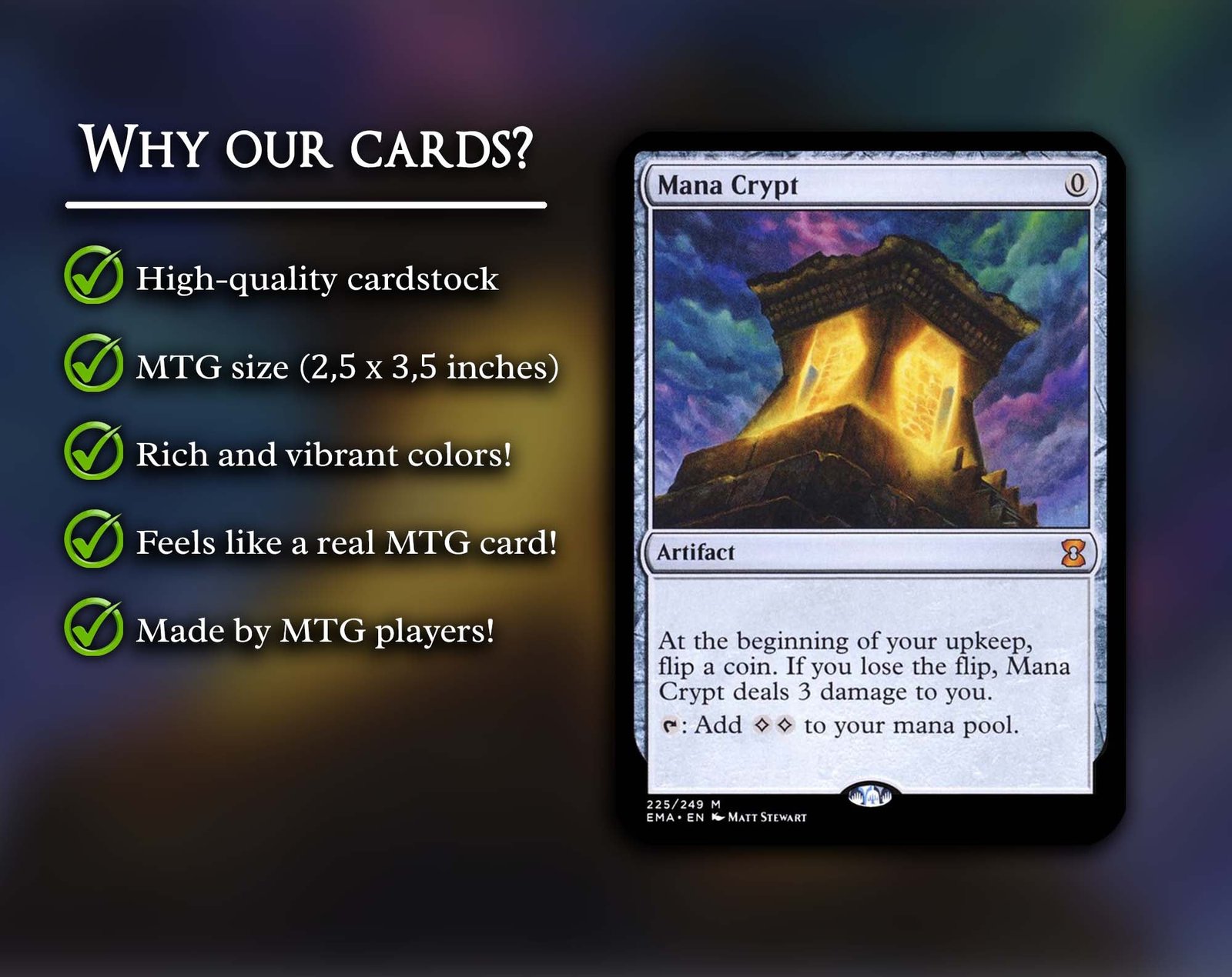 Quality that enchants: Our dedication to quality rivals the steadfastness of a wizard’s spell. Each proxy card is carefully handcrafted and made from premium materials to ensure it meets the highest standards. Trust in our expertise and attention to detail as we offer the same outstanding cardboard quality found in the famous collectible card game “Magic: The Gathering.” This premium material ensures unmatched durability and a satisfying crispness with every move in the game.