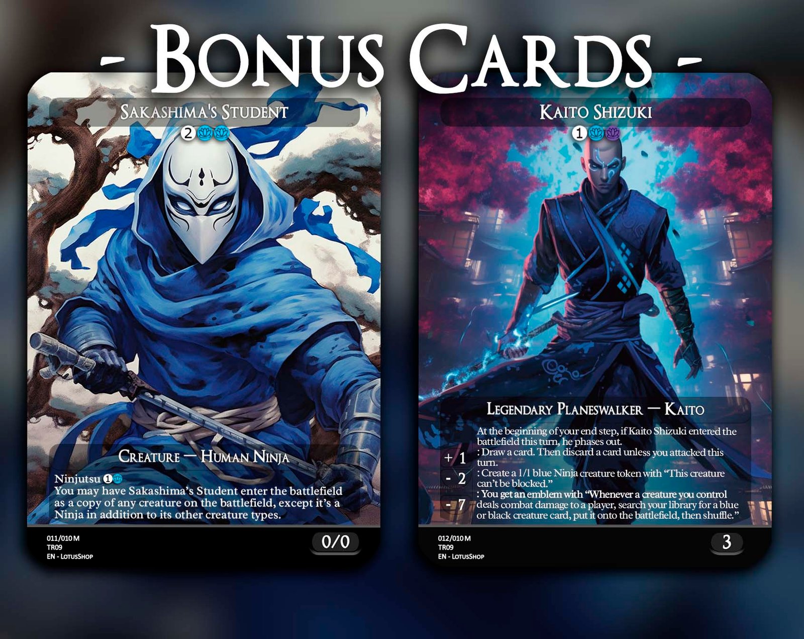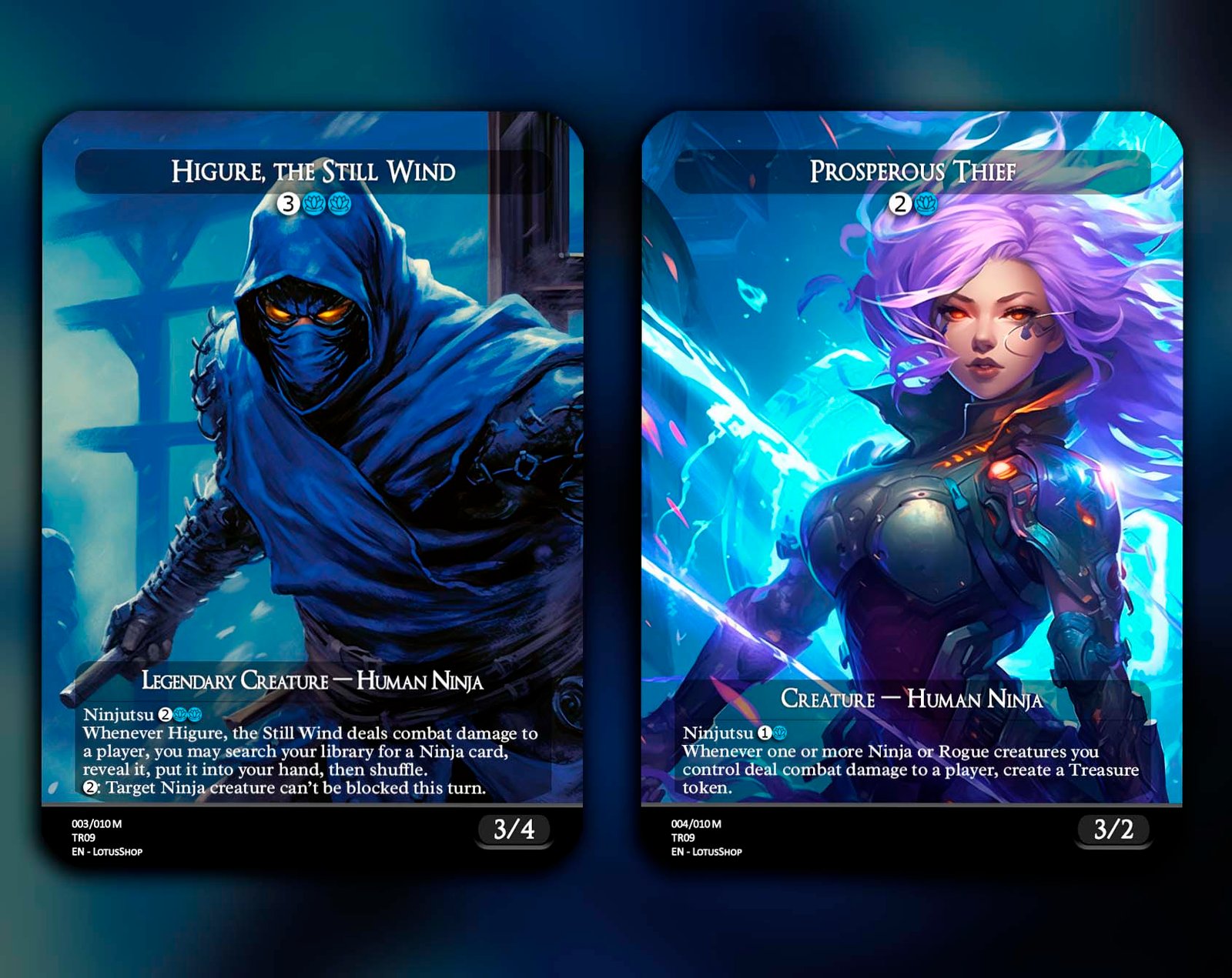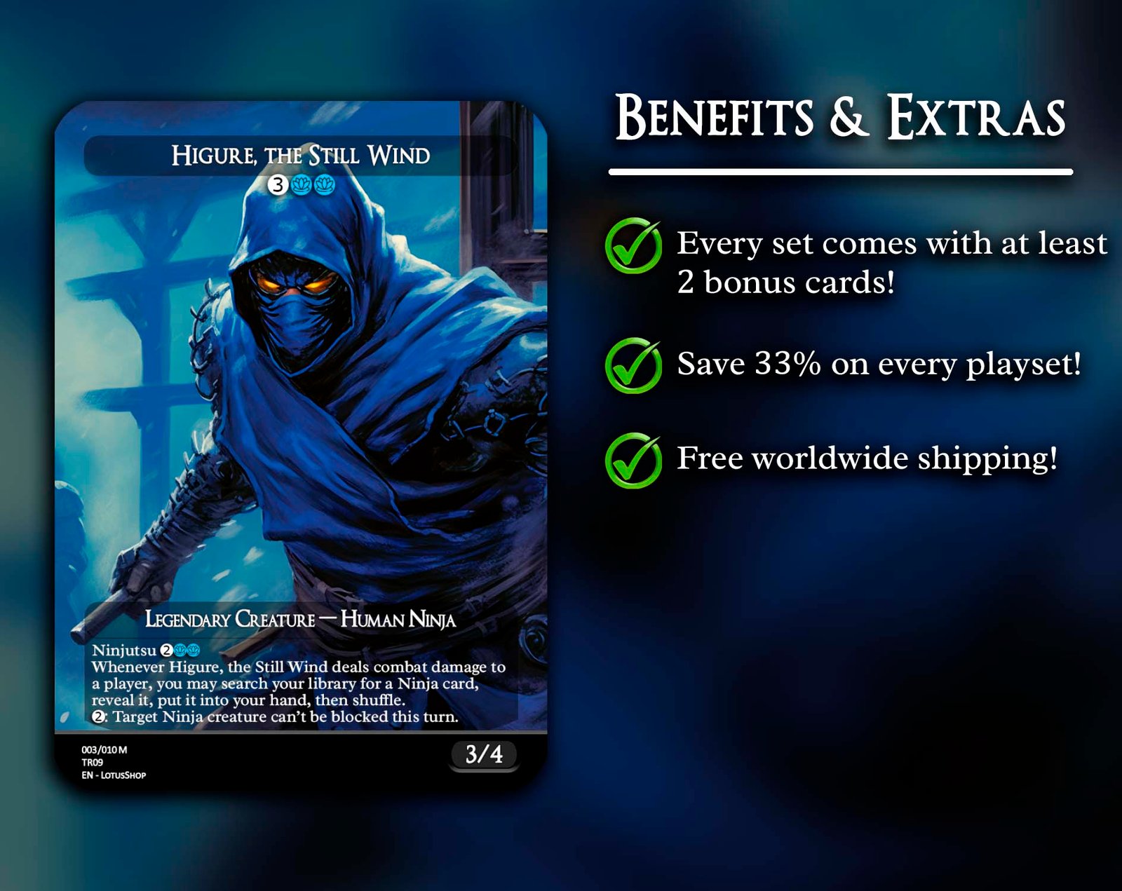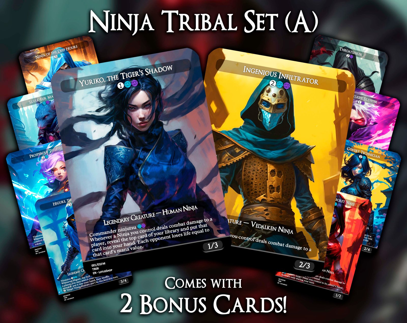 Step into the shadows with this 12-card Ninja Tribal set, built around stealth, evasion, and the iconic Ninjutsu mechanic. From the legendary Yuriko, the Tiger’s Shadow to classic powerhouses like Higure, the Still Wind and Ninja of the Deep Hours, this set is perfect for players who enjoy striking unseen and overwhelming opponents with precision.