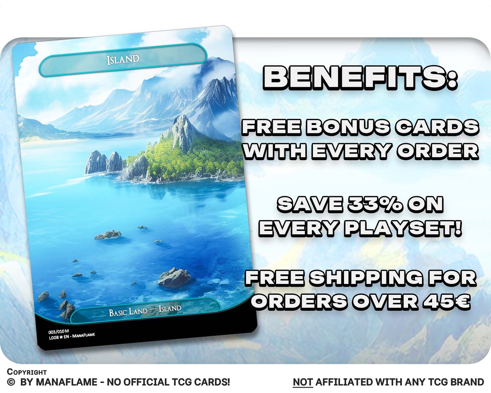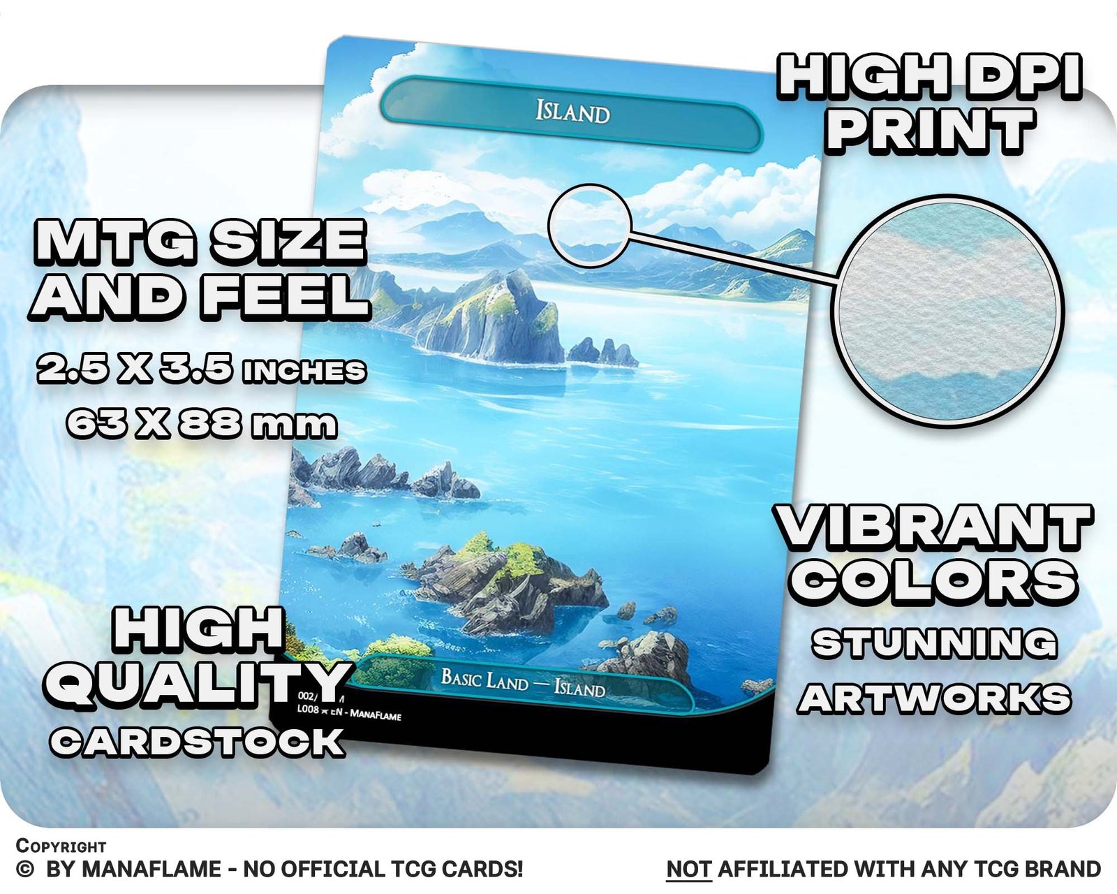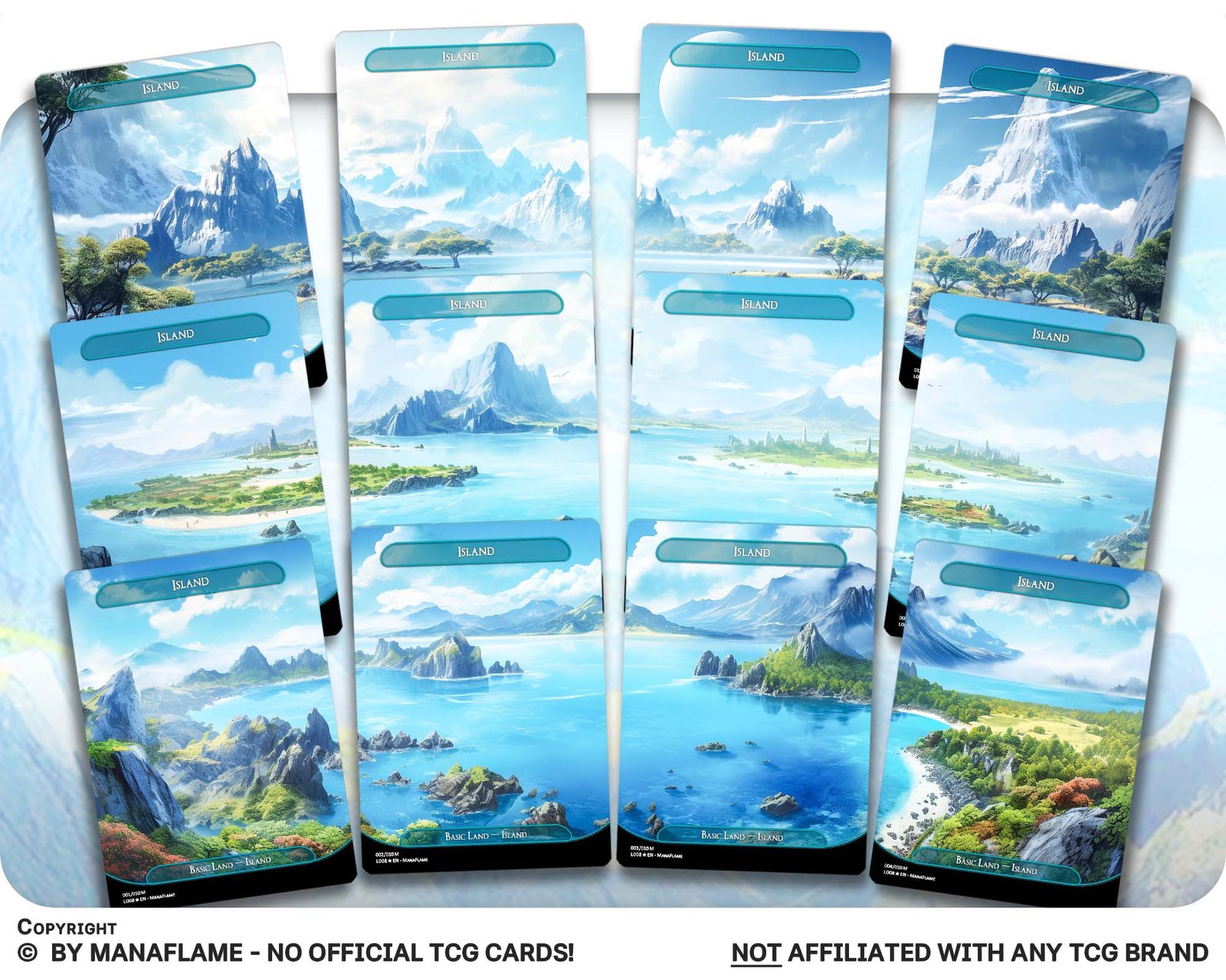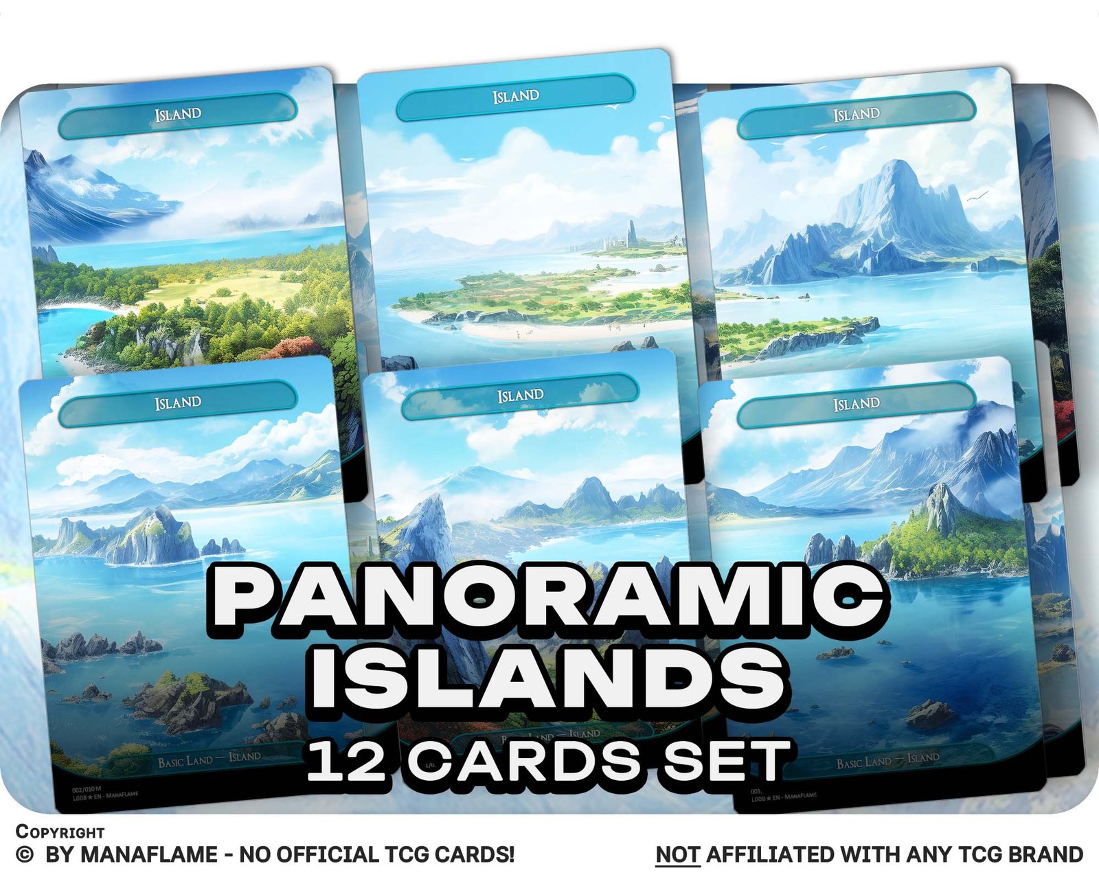 A beautiful 12-card basic land bundle featuring panoramic Island artworks. Each card flows into the next, forming a sweeping ocean vista — perfect for players who want their blue decks to feel as immersive as the tides themselves.
