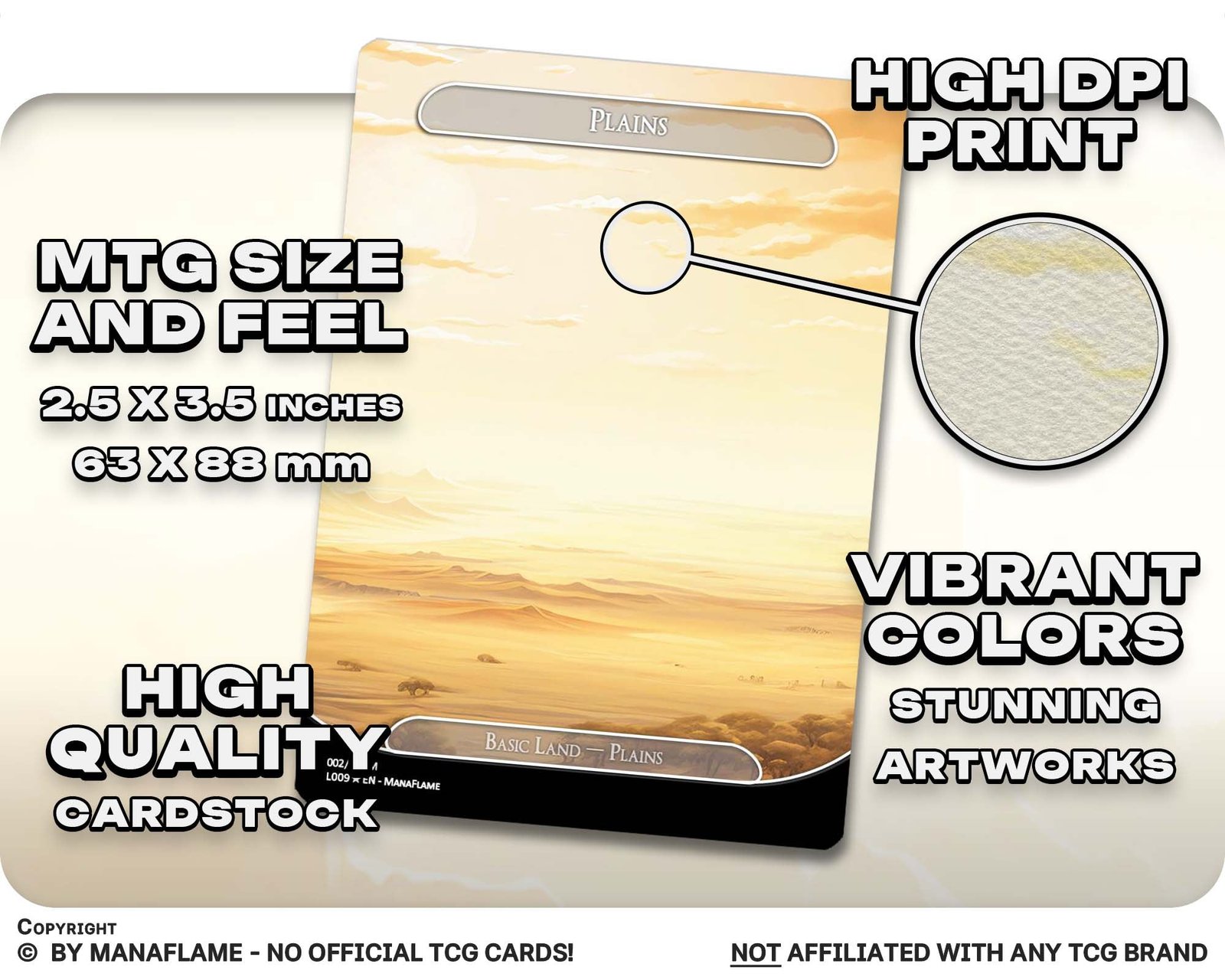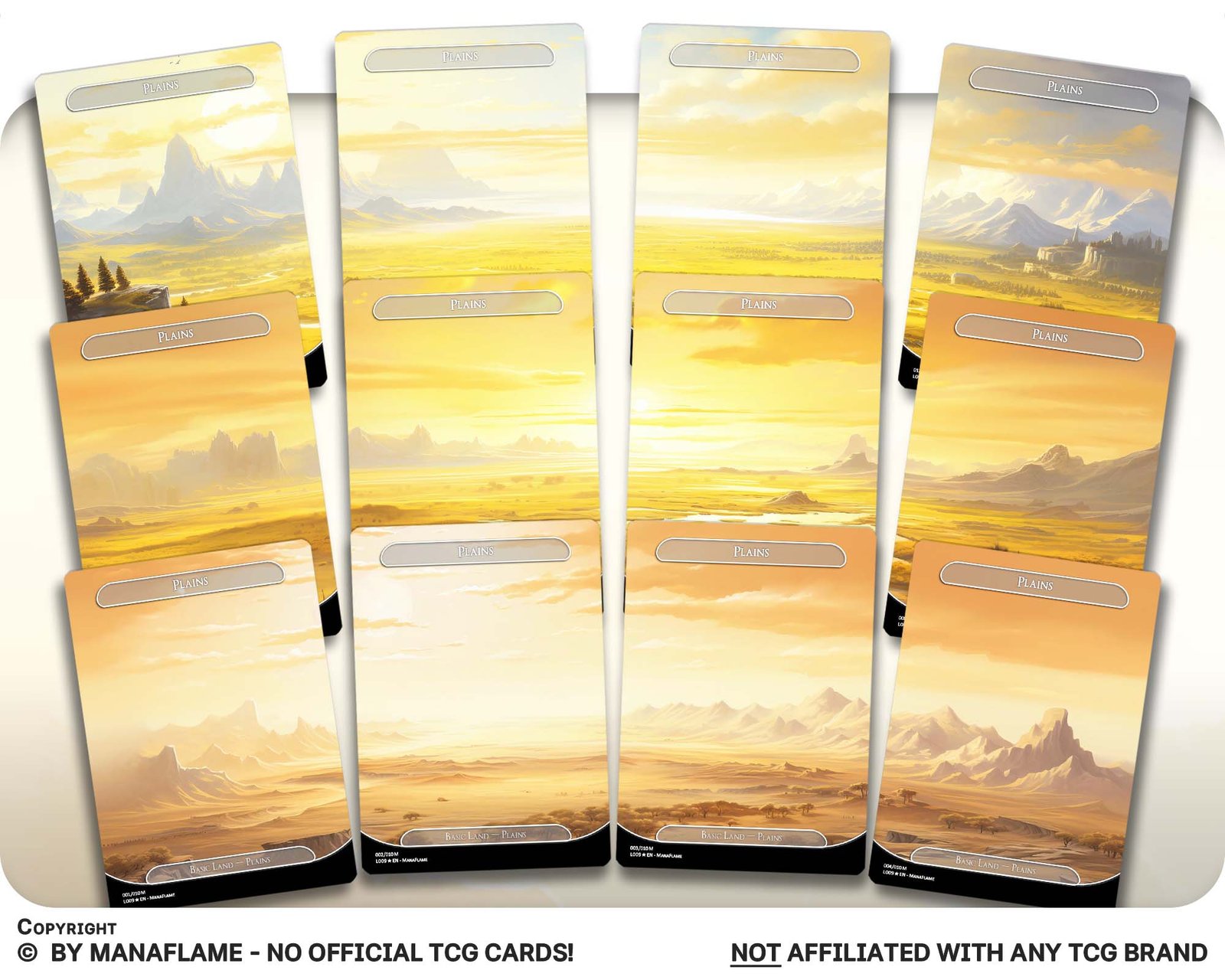 A radiant 12-card basic land bundle featuring panoramic Plains artworks. Each card connects seamlessly to the next, forming a vast golden horizon — perfect for white decks that shine with unity and light.