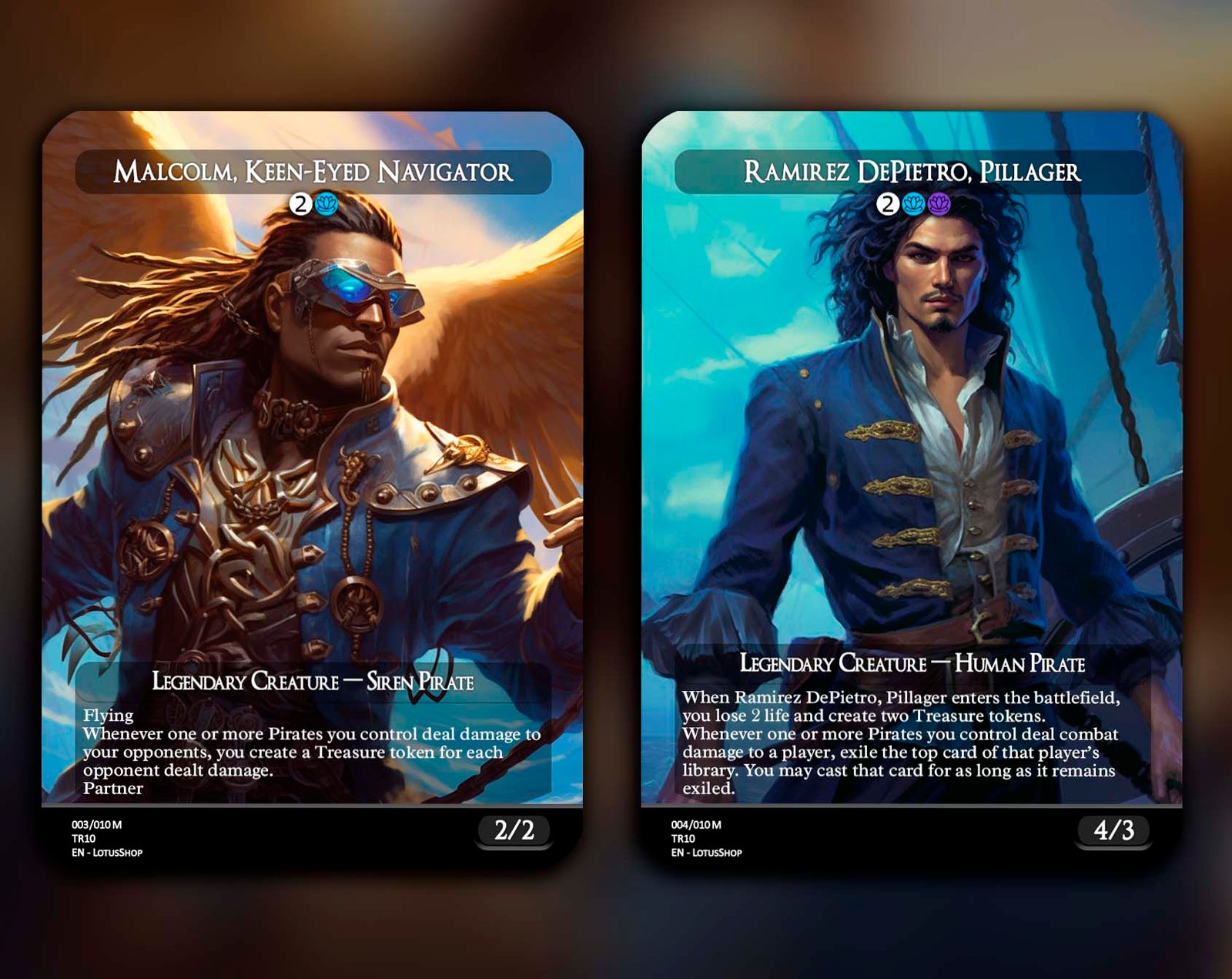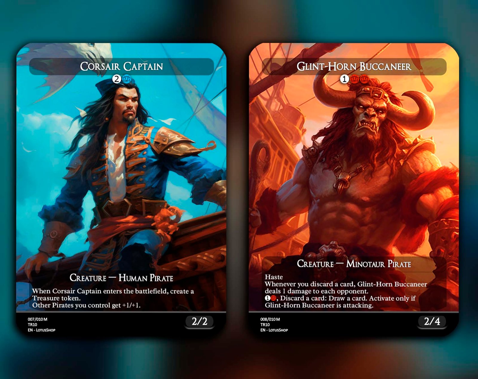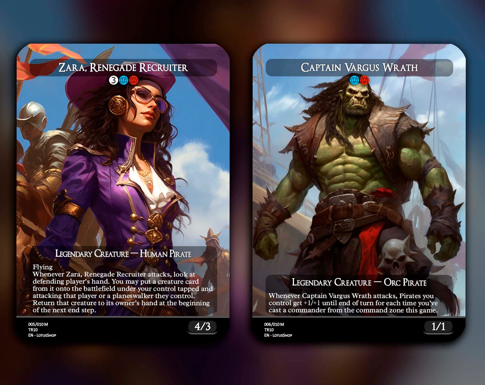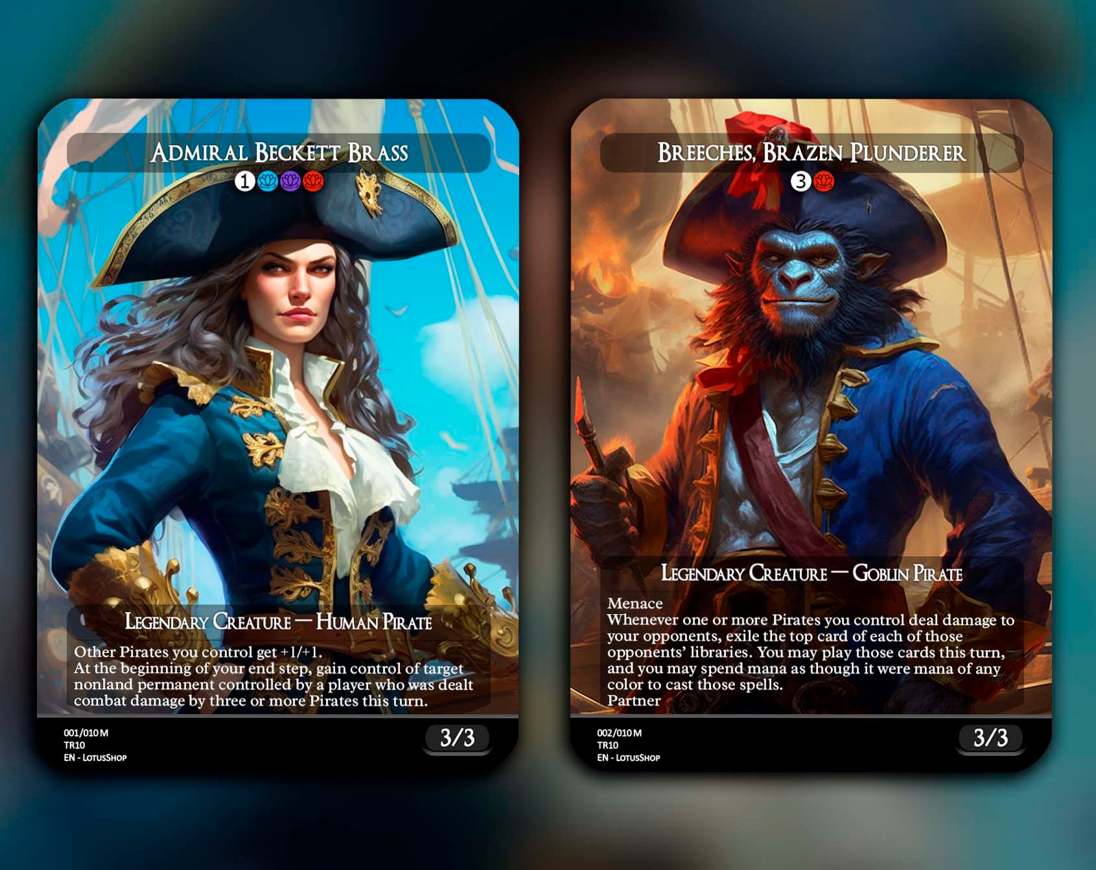 Hoist the black flag and raid the high seas with this 12-card Pirate Tribal set! Featuring legendary captains like Admiral Beckett Brass and Zara, Renegade Recruiter, alongside swashbuckling rogues like Breeches, Brazen Plunderer and Malcolm, Keen-Eyed Navigator, this set is packed with treasure, chaos, and adventure. Perfect for building decks that plunder opponents, create Treasure tokens, and command the seas of EDH.