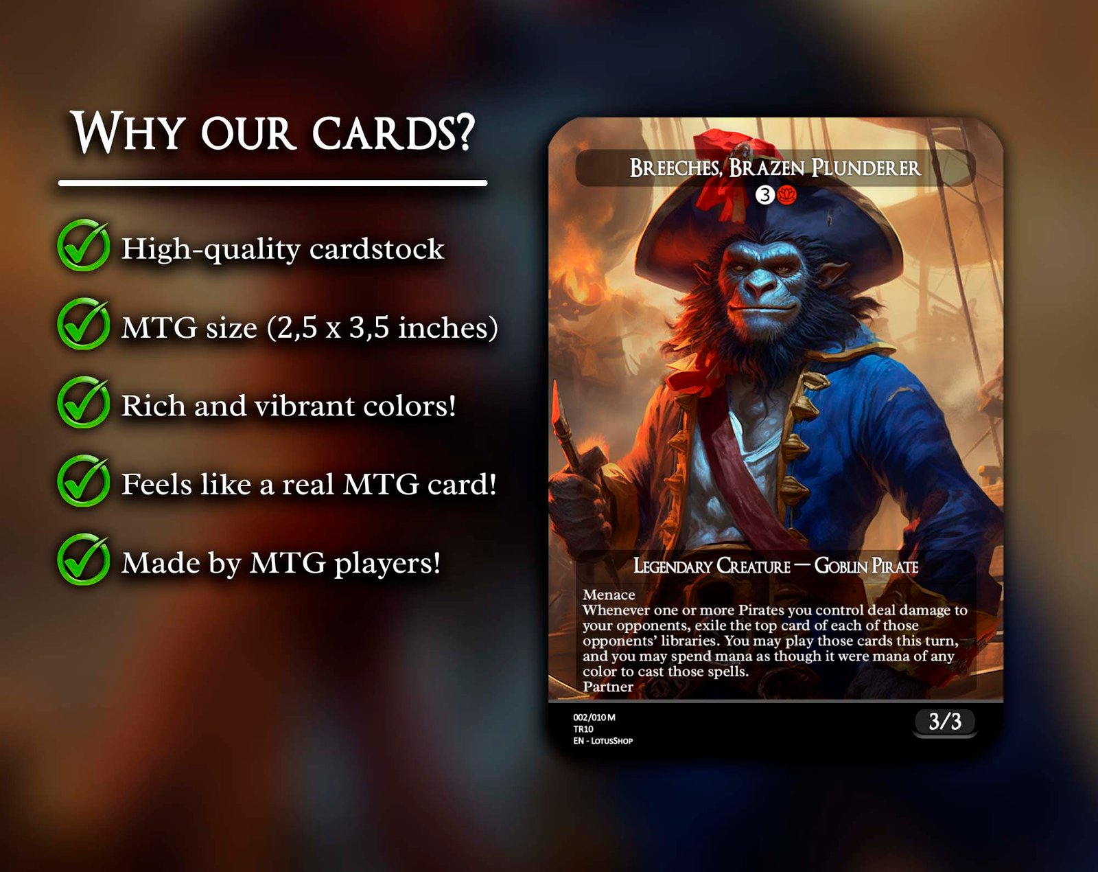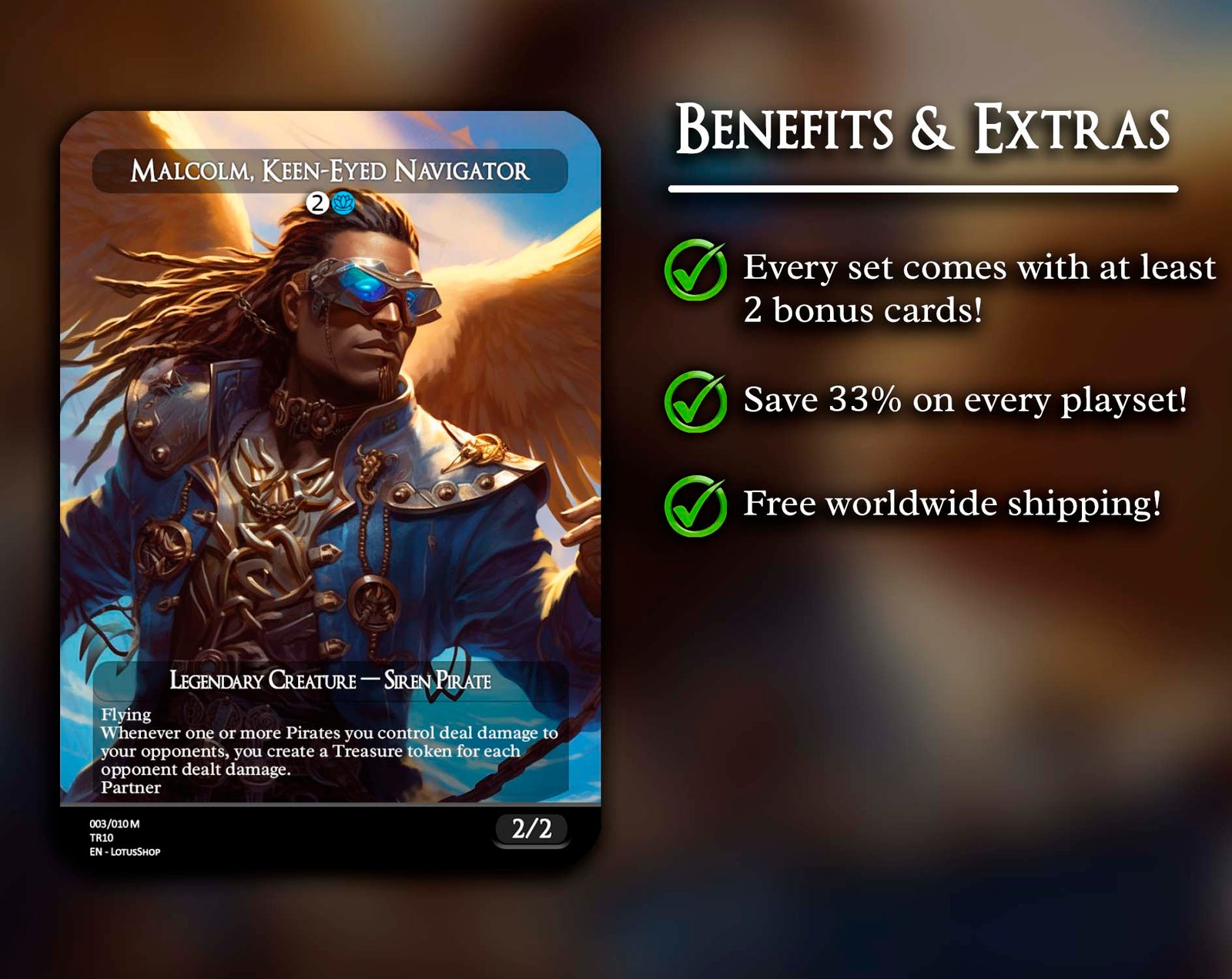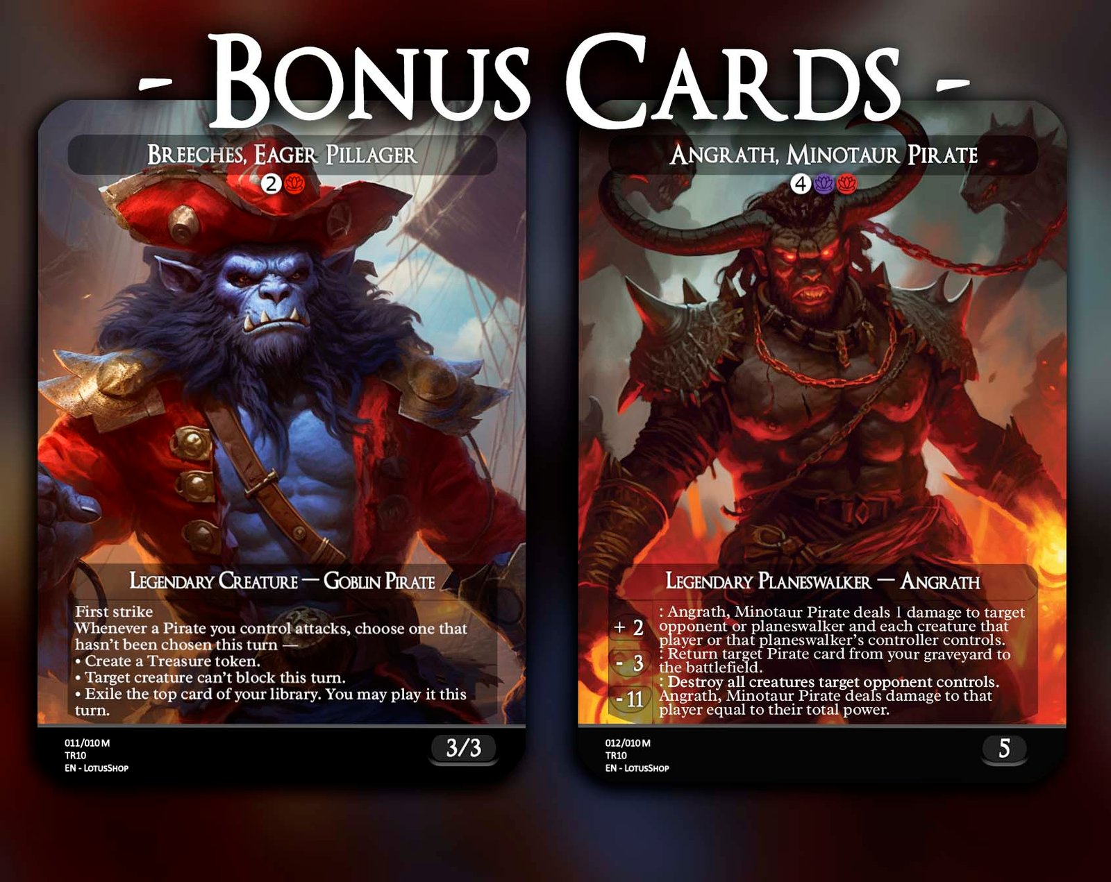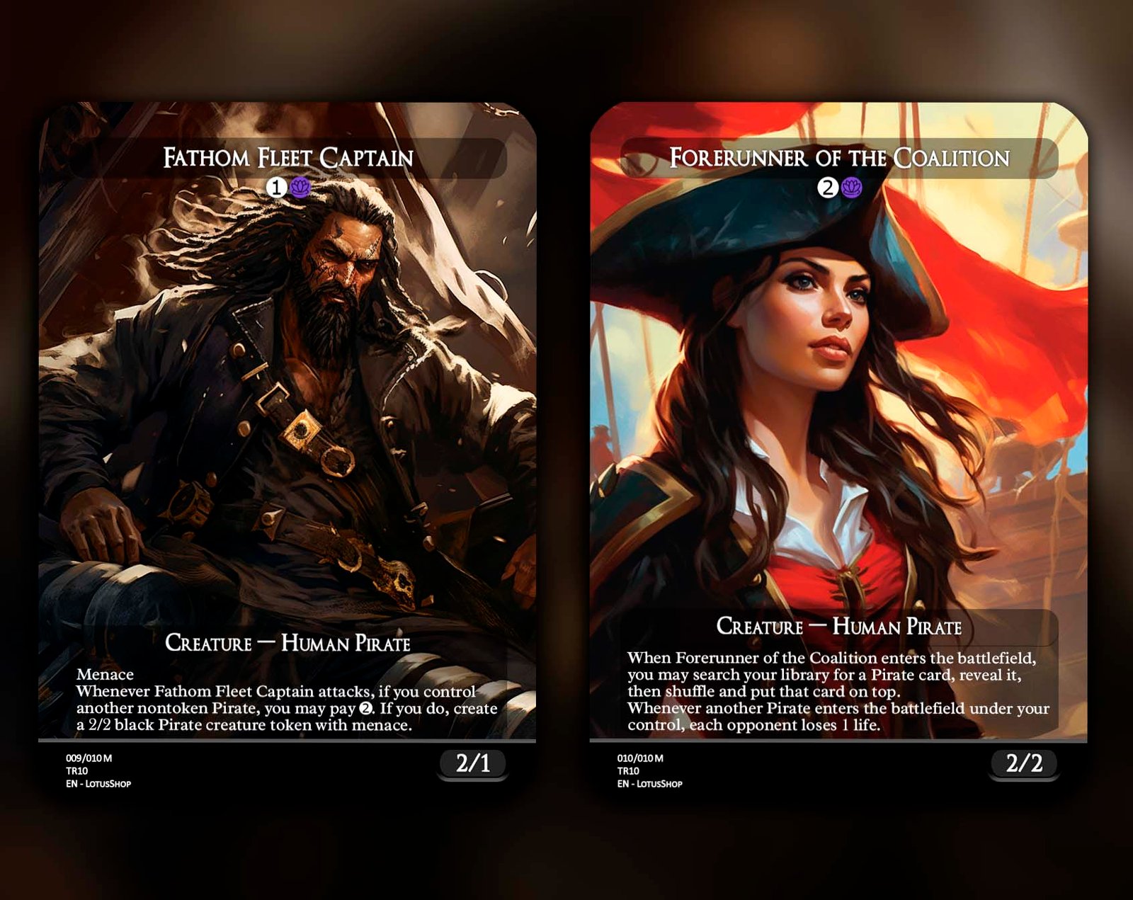 Hoist the black flag and raid the high seas with this 12-card Pirate Tribal set! Featuring legendary captains like Admiral Beckett Brass and Zara, Renegade Recruiter, alongside swashbuckling rogues like Breeches, Brazen Plunderer and Malcolm, Keen-Eyed Navigator, this set is packed with treasure, chaos, and adventure. Perfect for building decks that plunder opponents, create Treasure tokens, and command the seas of EDH.