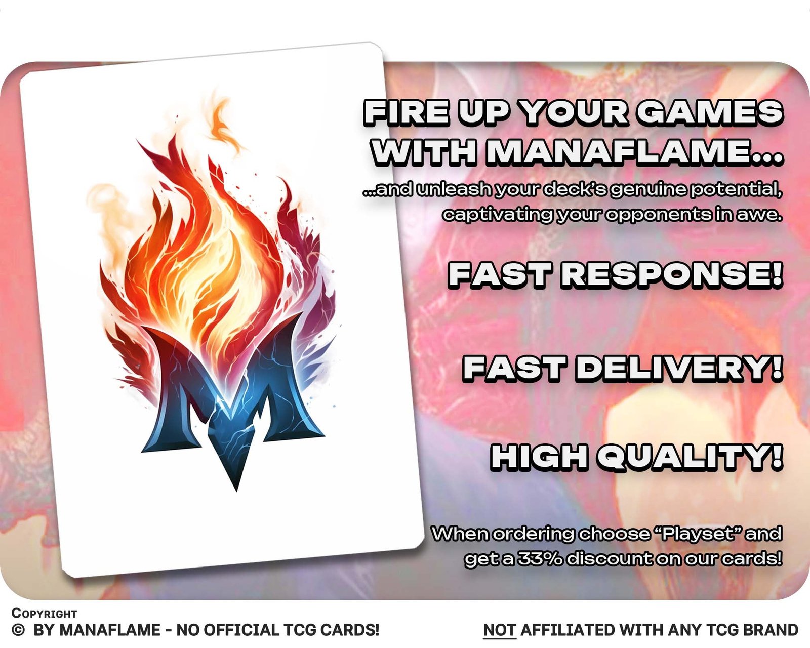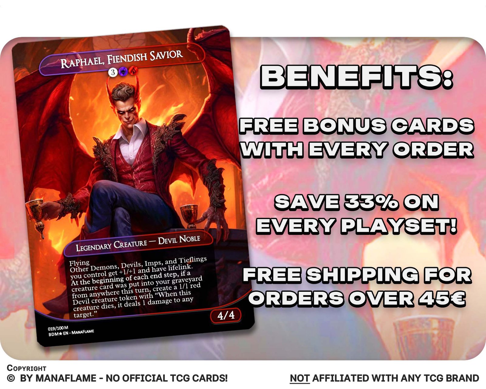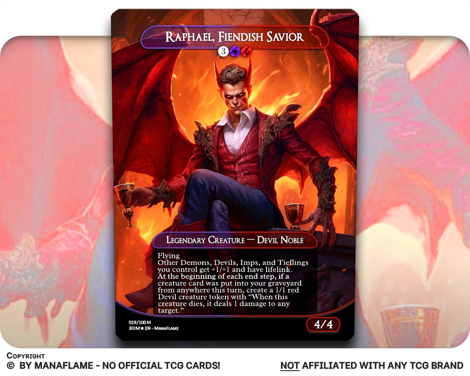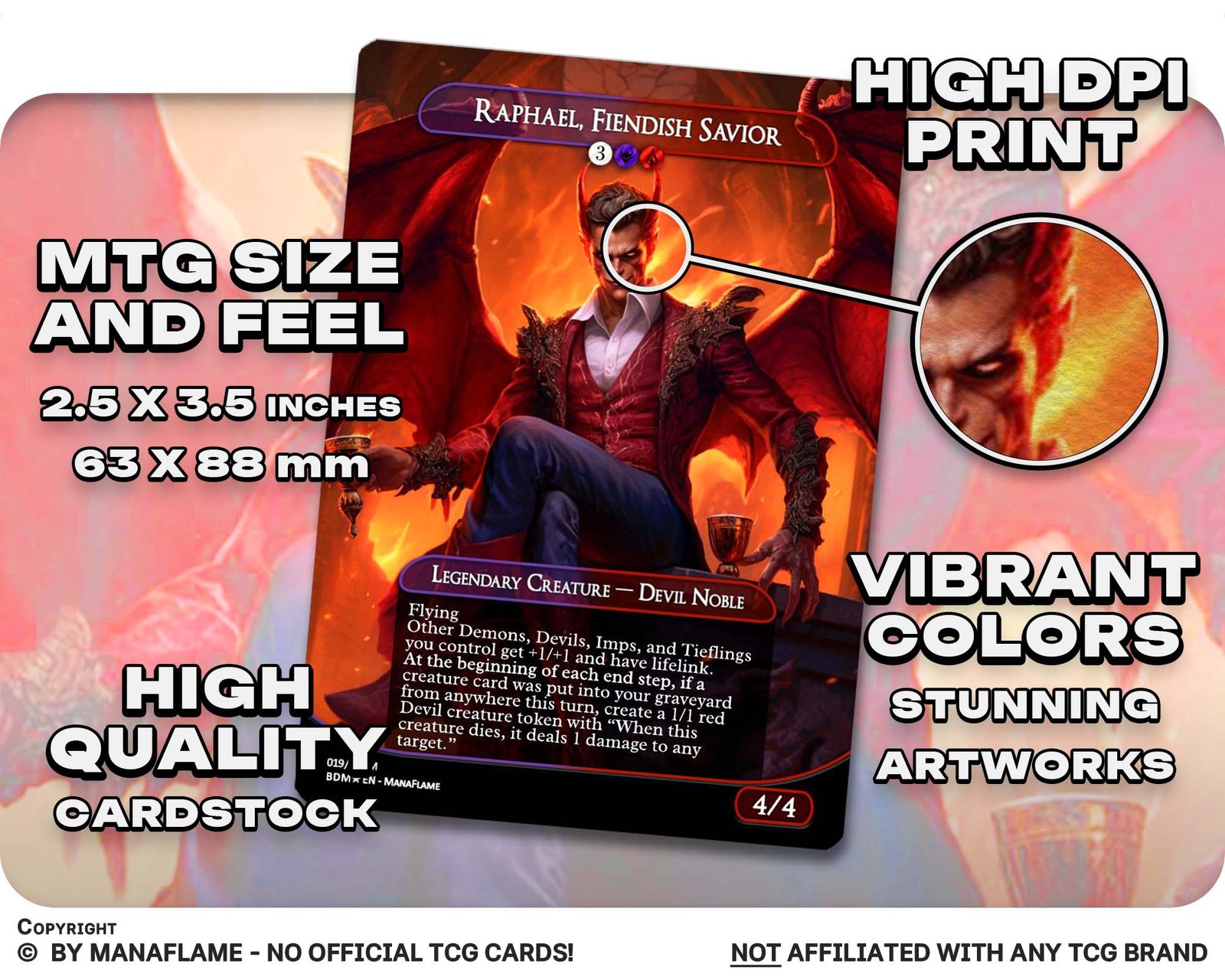 Includes 1 high-quality ManaFlame custom card of “Raphael, Fiendish Savior”, crafted with great attention to detail.