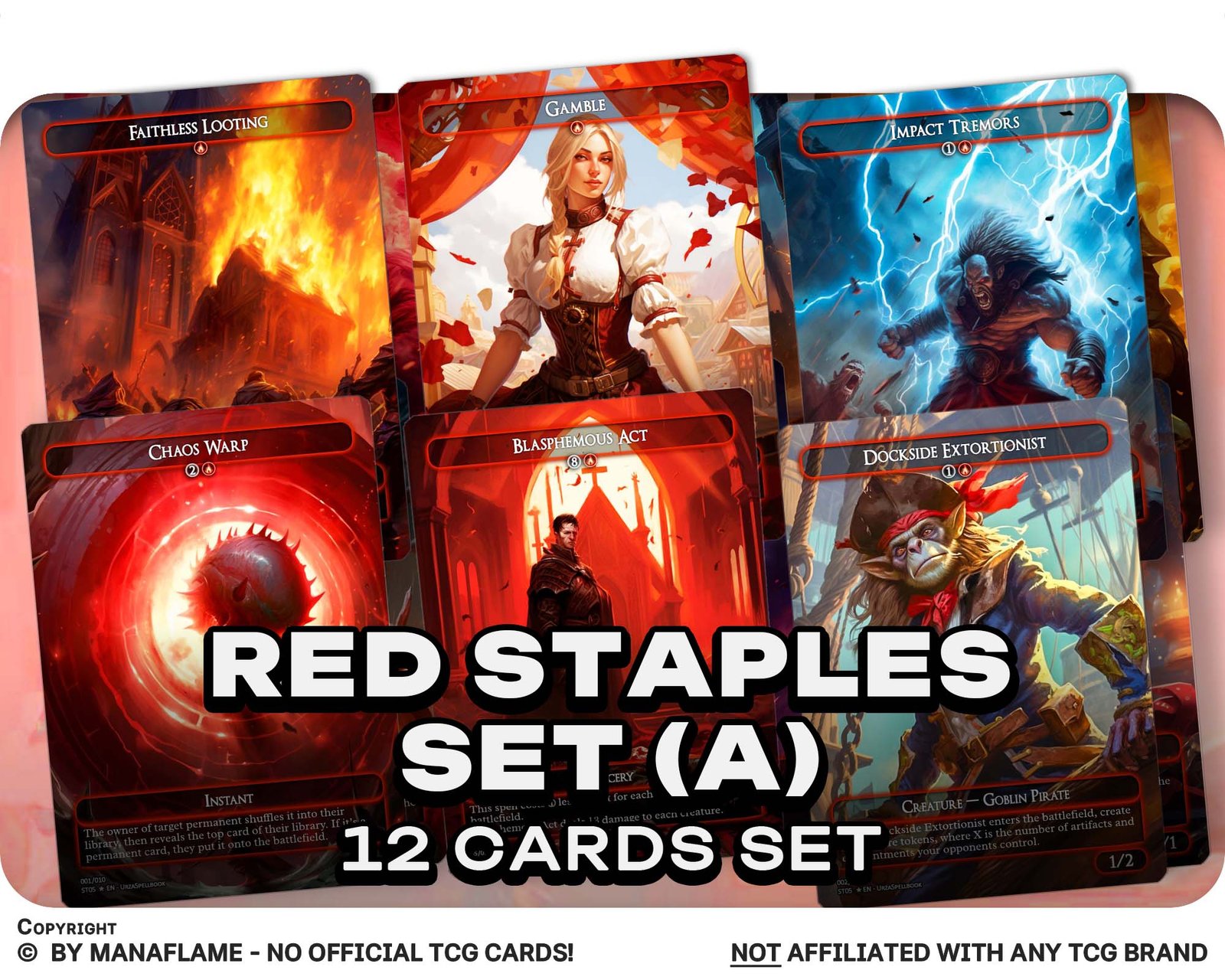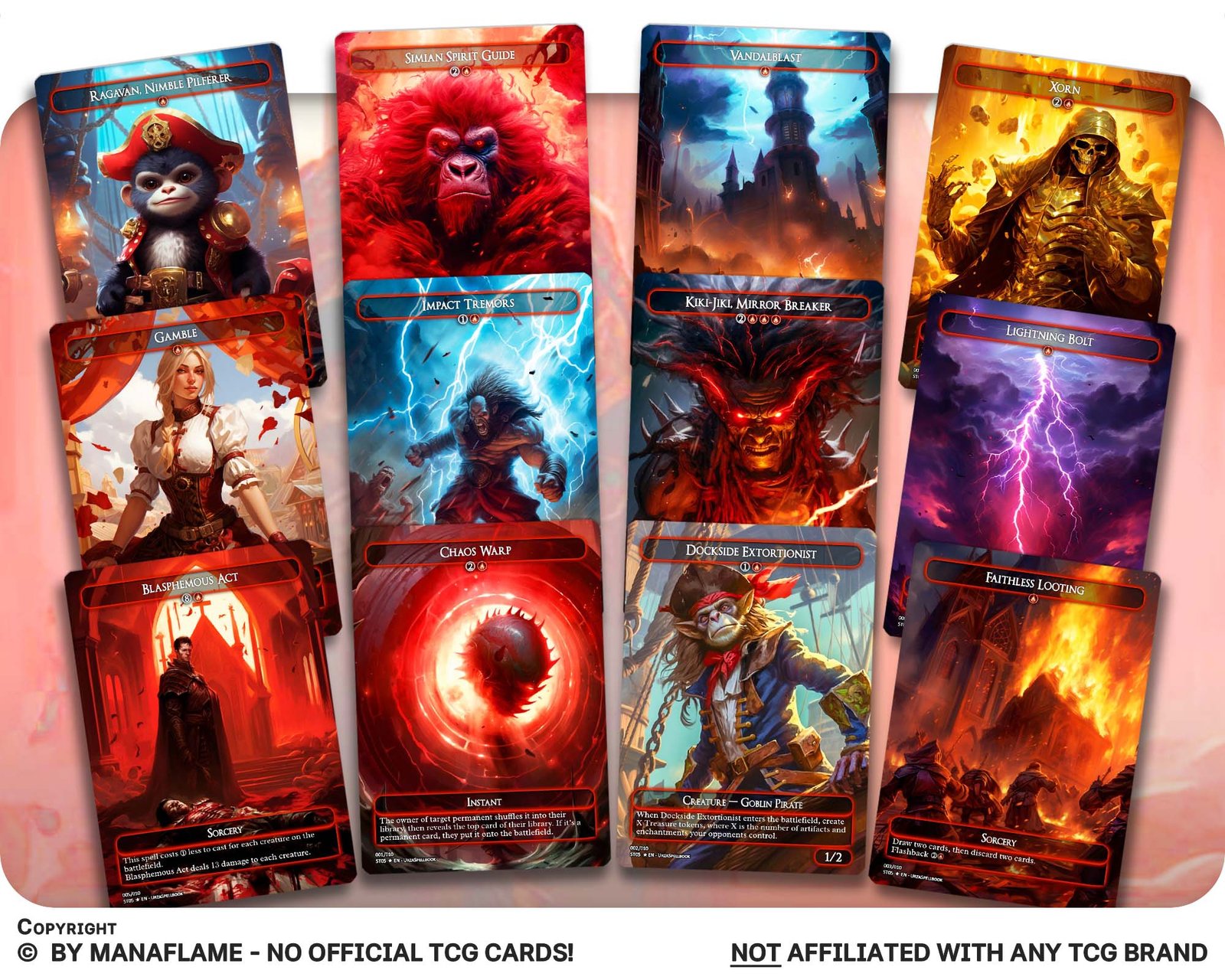 A fiery 12-card collection of red’s most iconic staples — from fast mana and efficient removal to chaotic board wipes and combo enablers. Perfect for proxy enthusiasts who want to unleash red’s speed, aggression, and unpredictability.