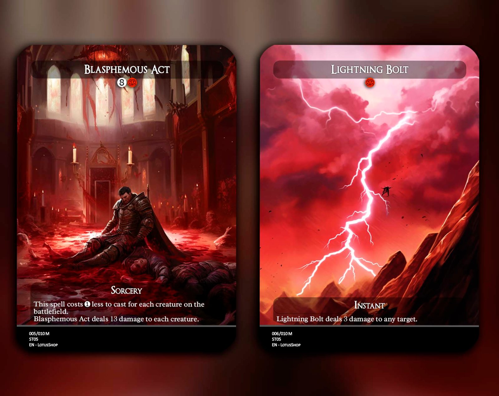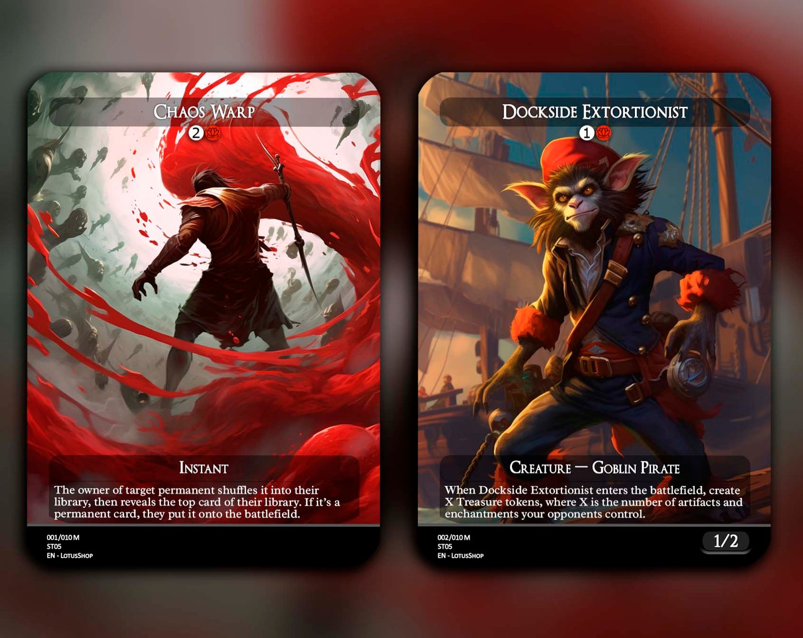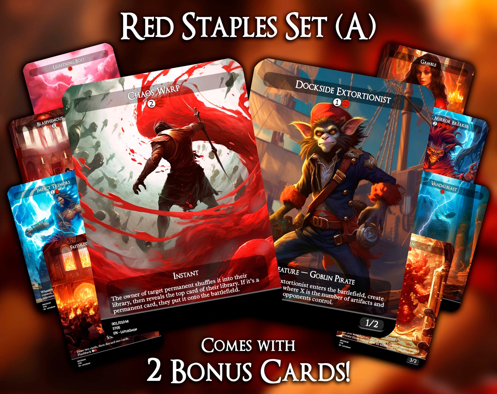 This 12-card set gathers the most iconic red staples for Commander, combining explosive ramp, removal, and game-winning synergies. From universal answers like Chaos Warp and Vandalblast, to powerhouse cards like Dockside Extortionist, Kiki-Jiki, Mirror Breaker, and Ragavan, Nimble Pilferer, this package captures red’s chaos and speed. Add in classics like Lightning Bolt, Faithless Looting, and Blasphemous Act, and you’ve got the perfect foundation for any red-inclusive deck.