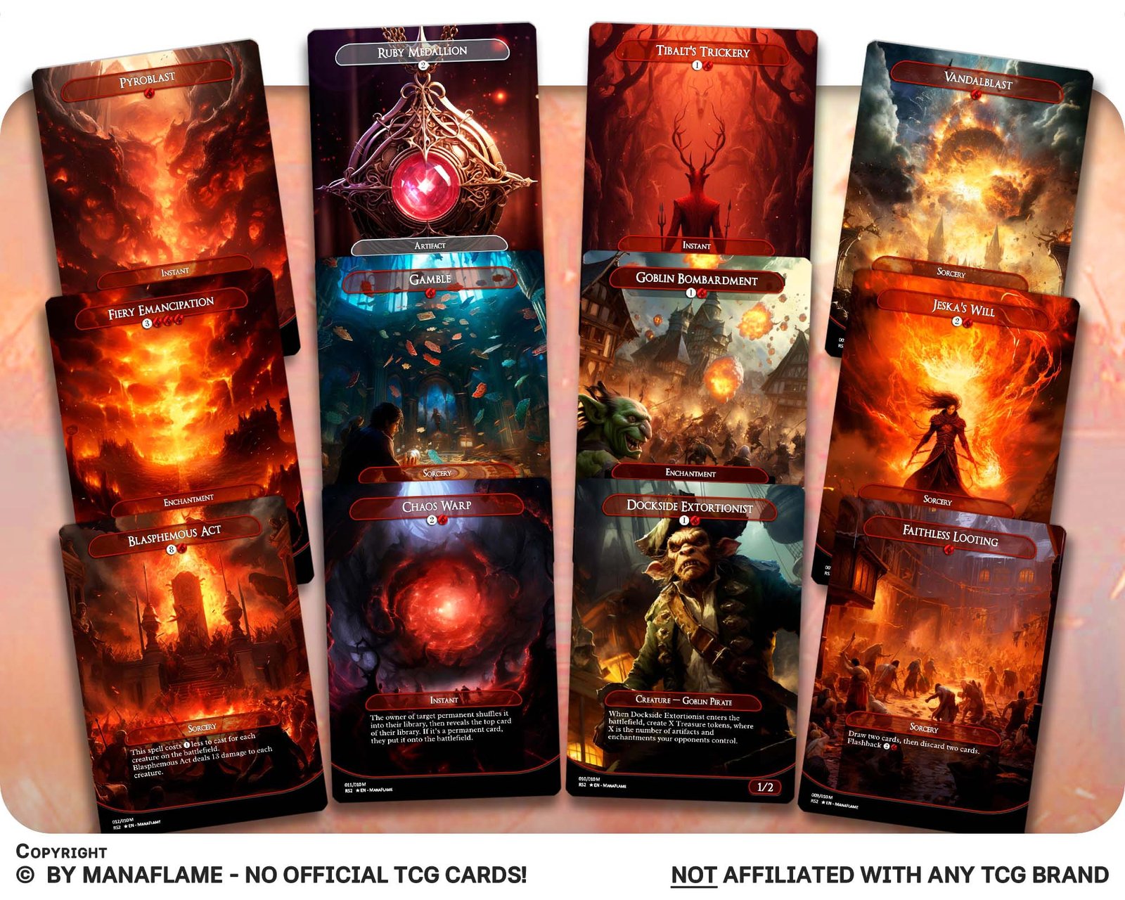 This 12-card set captures more of red’s most powerful staples in Commander. Packed with artifact removal, devastating board wipes, and iconic value spells, these cards showcase the versatility and explosiveness that make red an essential color in any deck.
