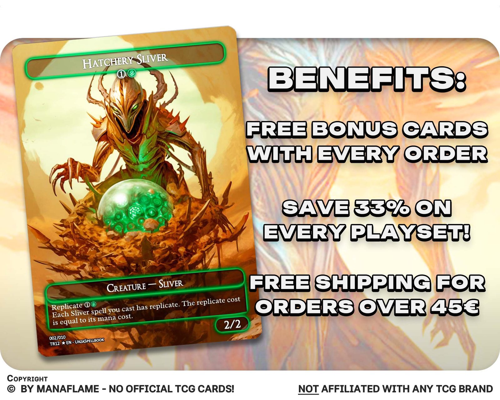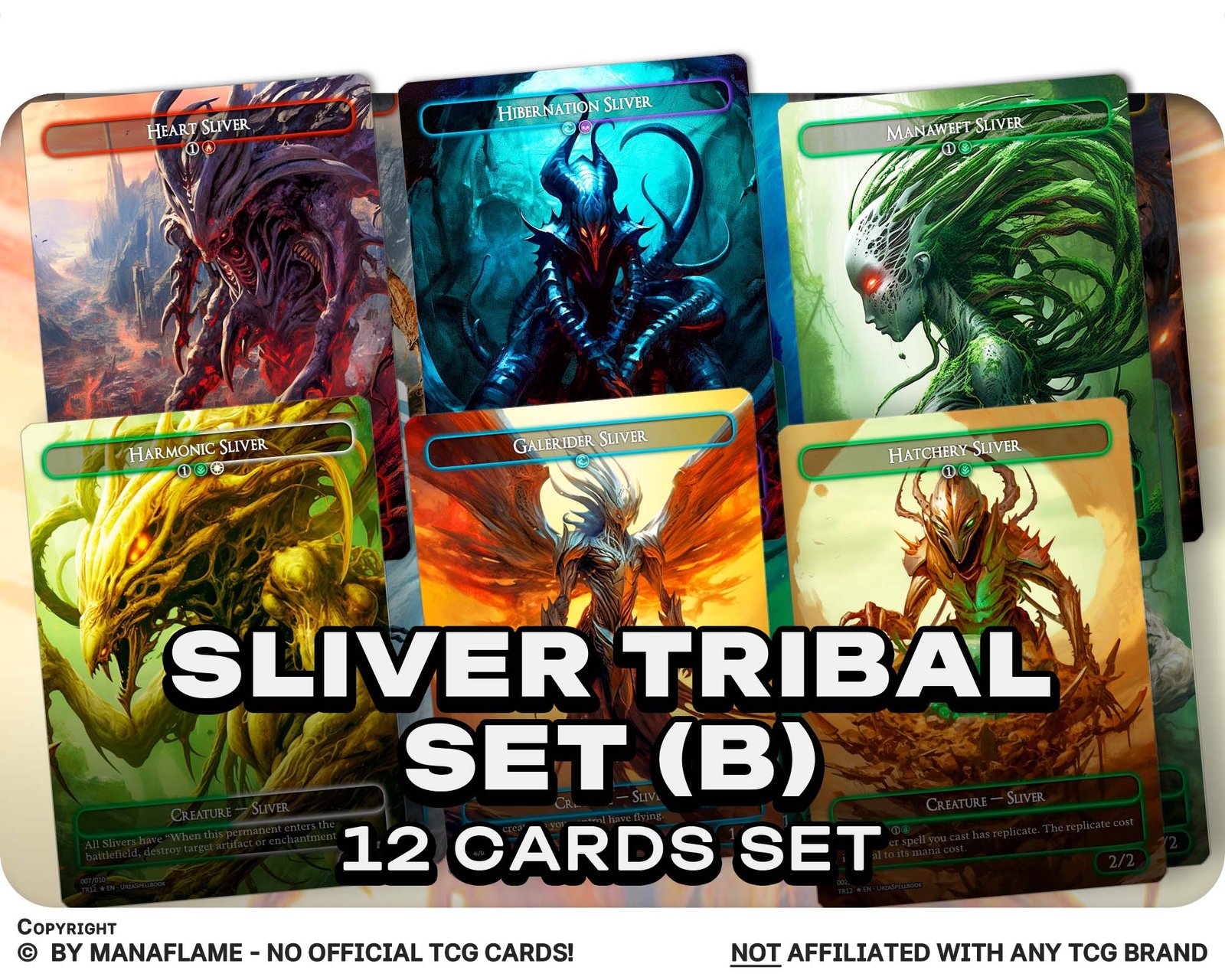 A 12-card collection of essential Sliver tribal pieces — featuring mana fixing, haste, flying, protection, and utility effects that enhance the hive’s adaptability. Perfect for proxy enthusiasts who want to expand their swarm and harness the diverse strengths that make Slivers one of Magic’s most feared tribes.