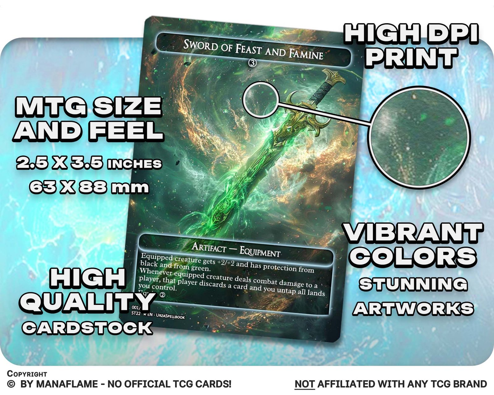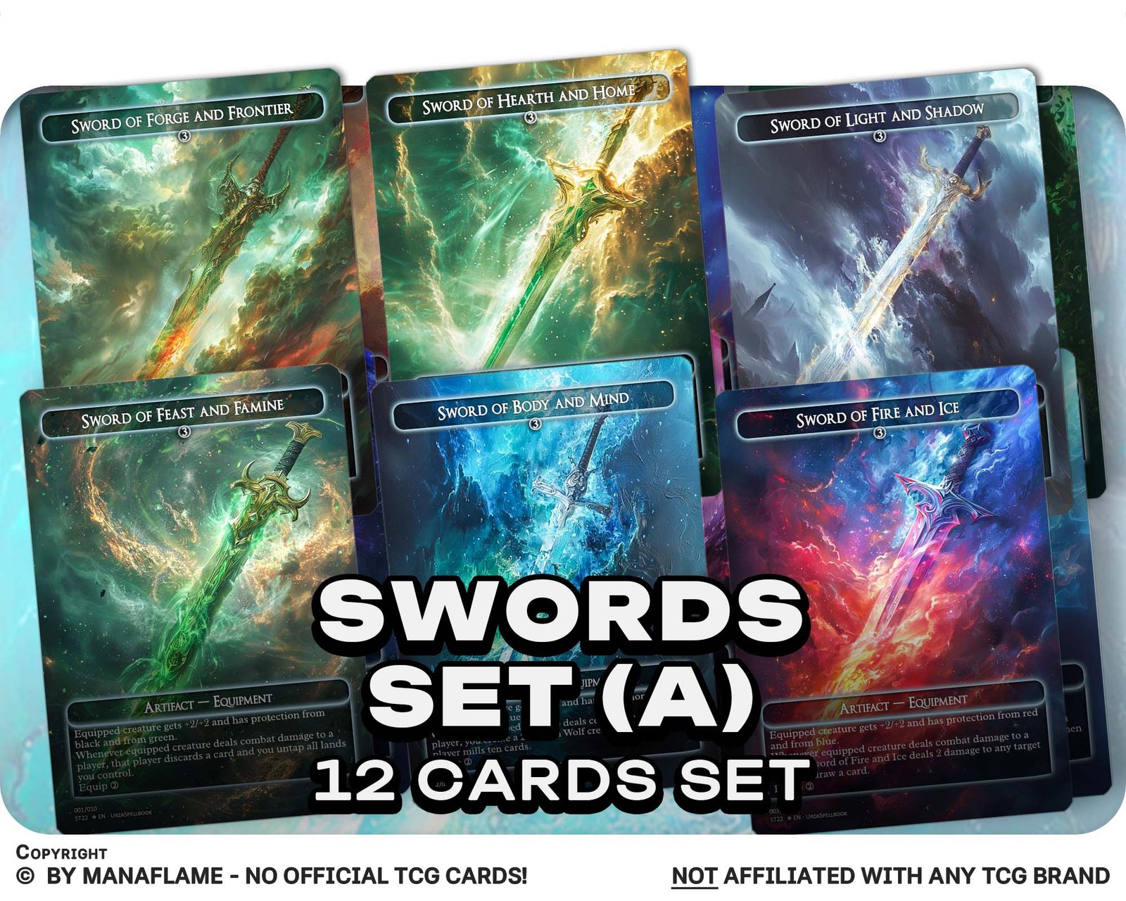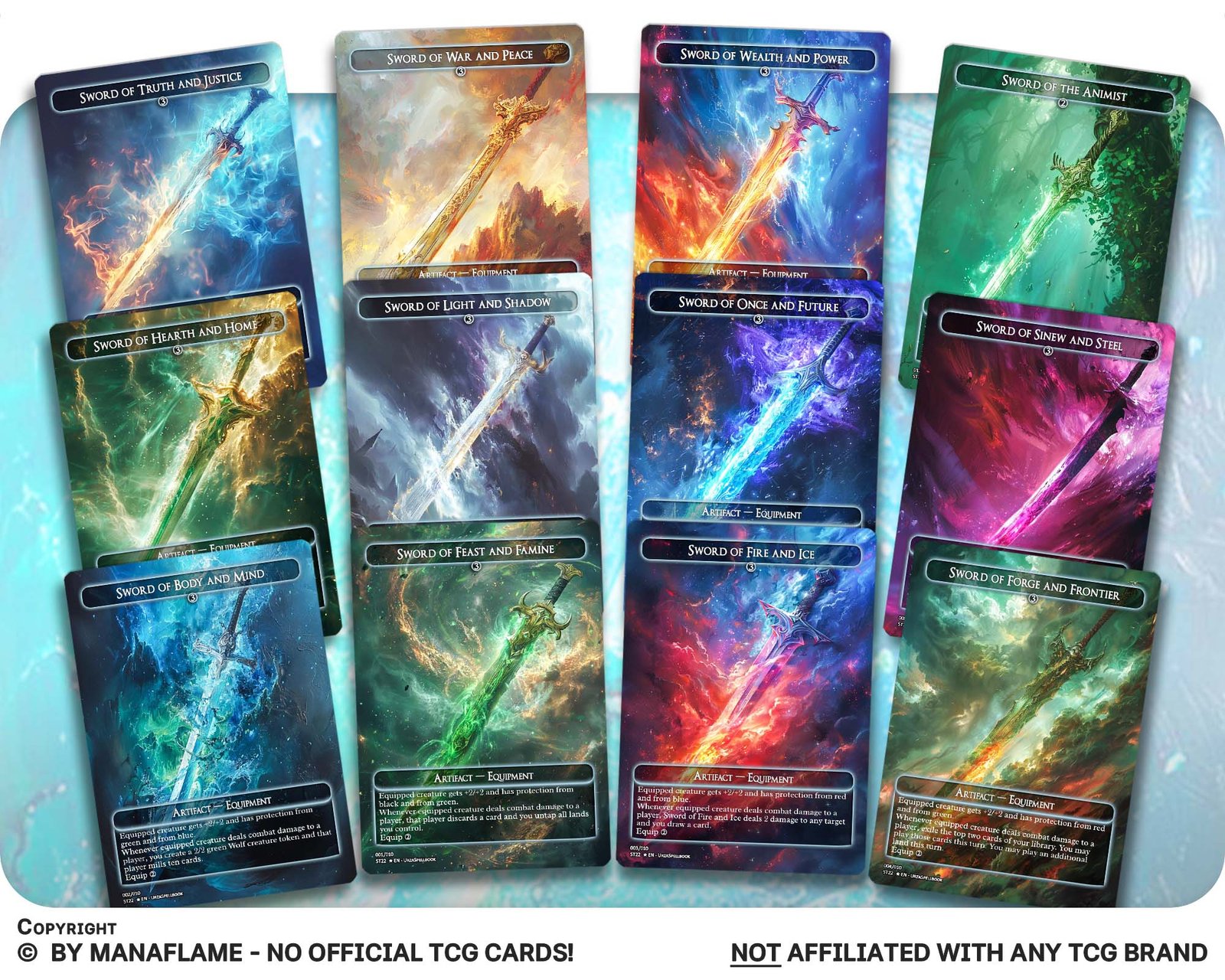 A 12-card collection of Magic’s most iconic equipment — the legendary Sword cycle plus two essential powerhouses. Perfect for proxy enthusiasts who want to wield unmatched versatility, protection, and combat dominance.