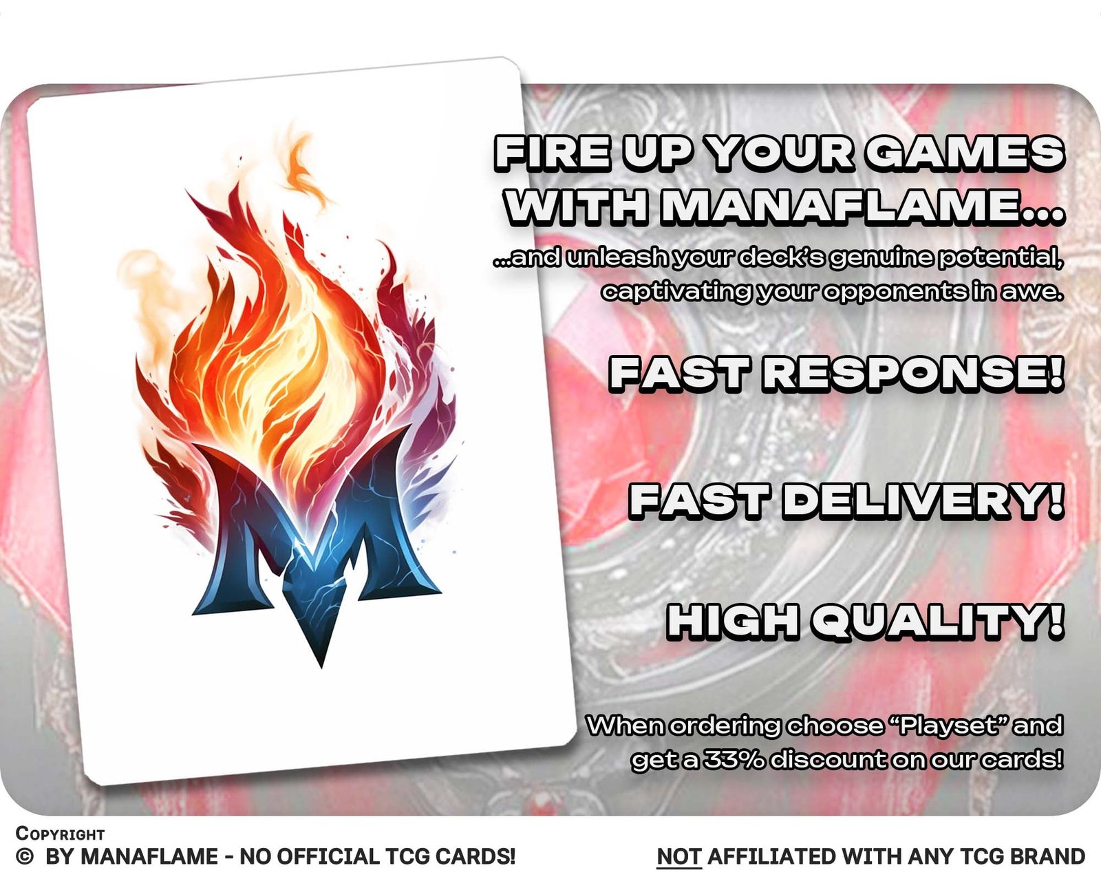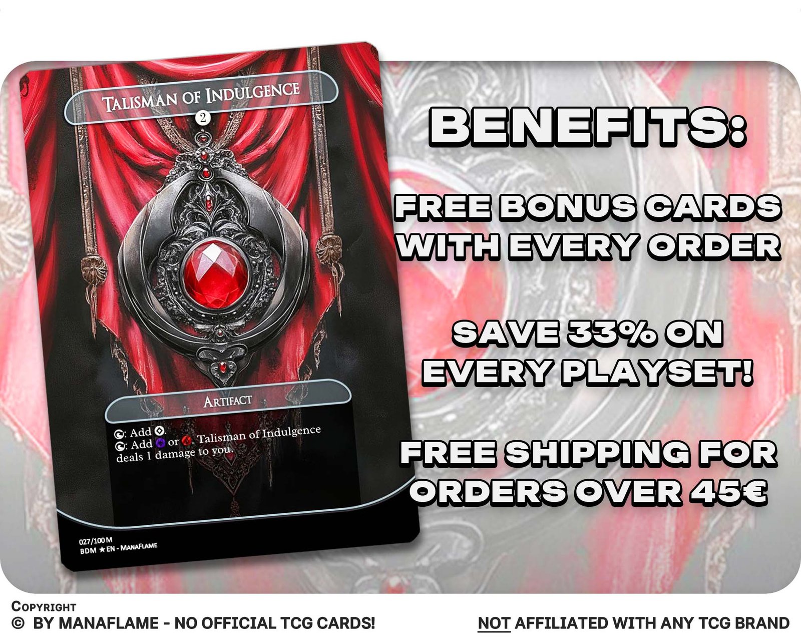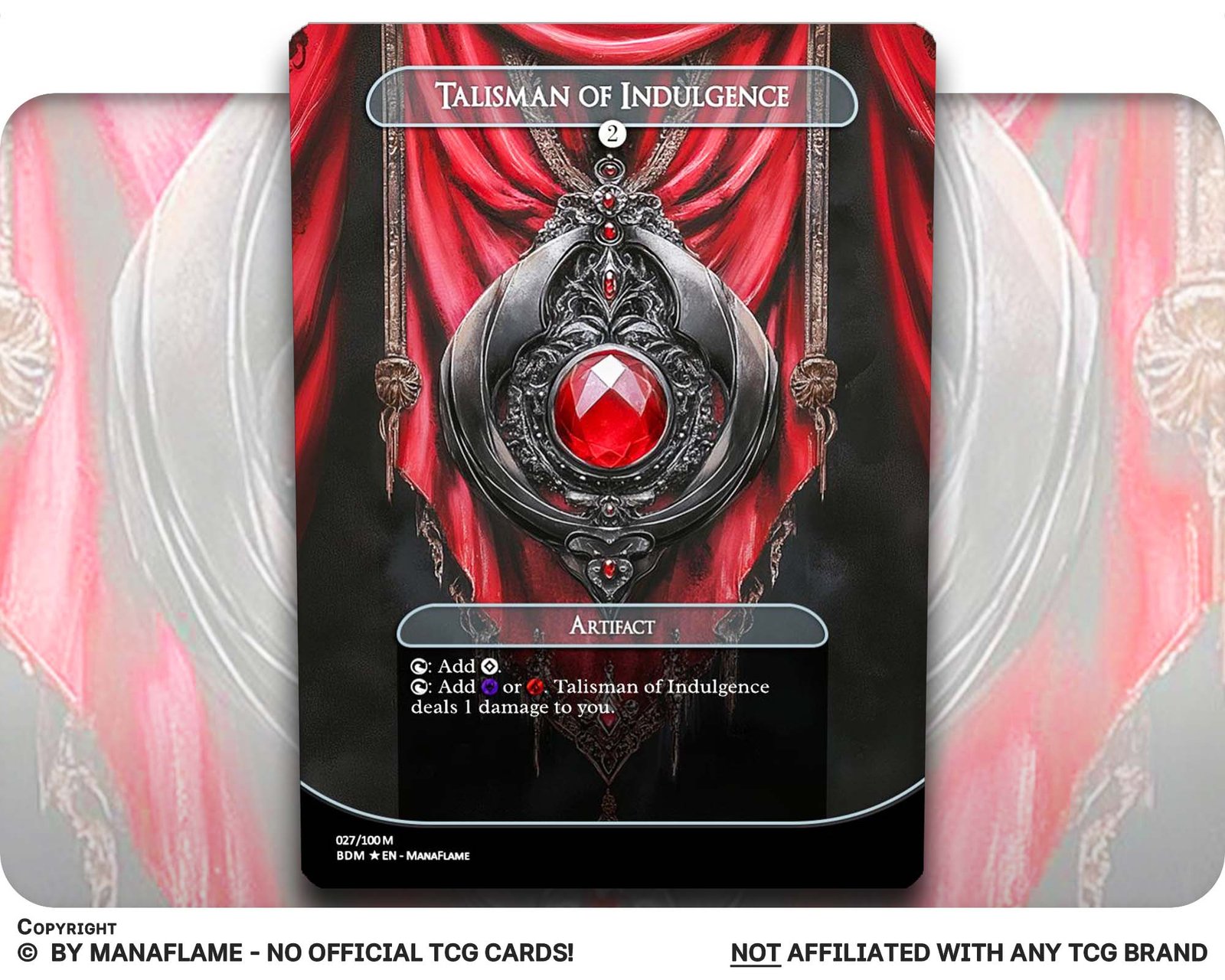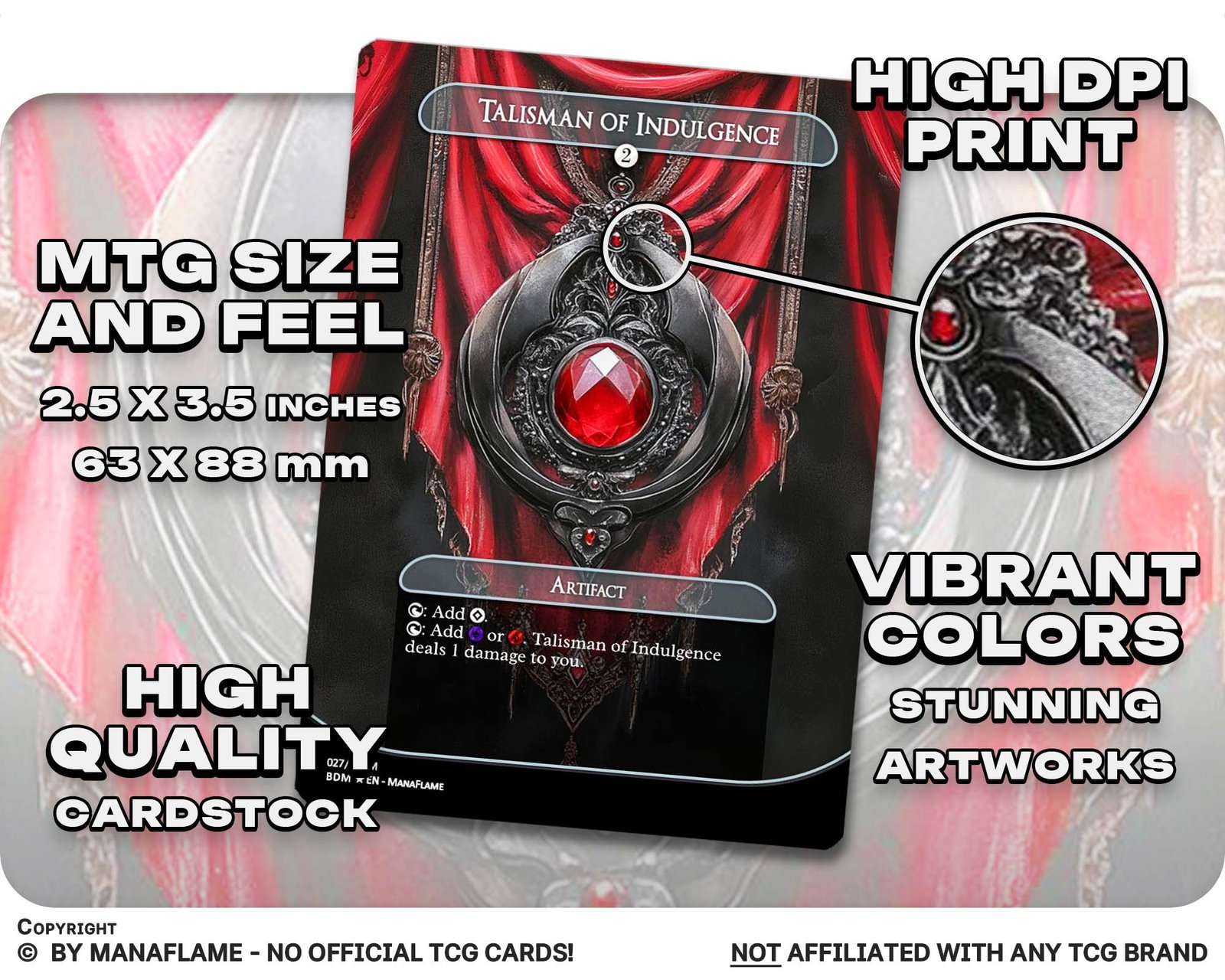 Includes 1 high-quality ManaFlame custom card of “Talisman of Indulgence”, crafted with great attention to detail.