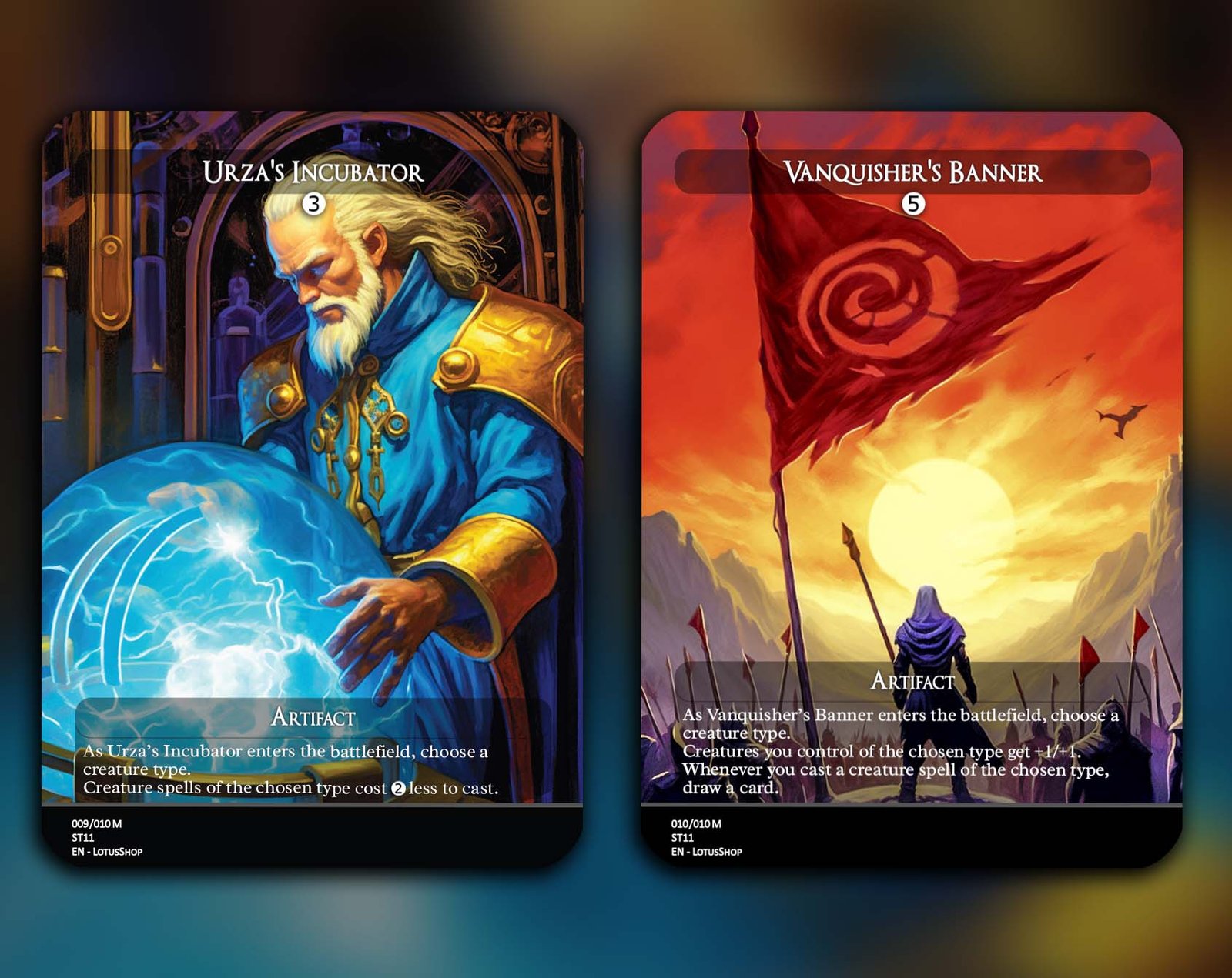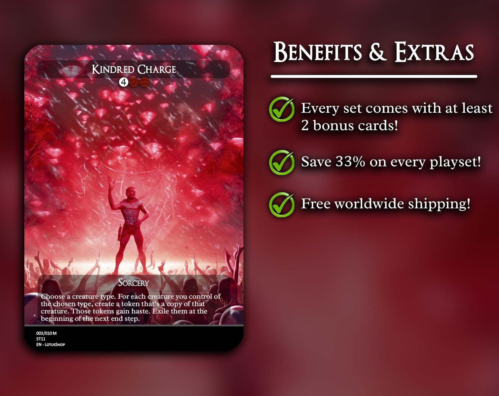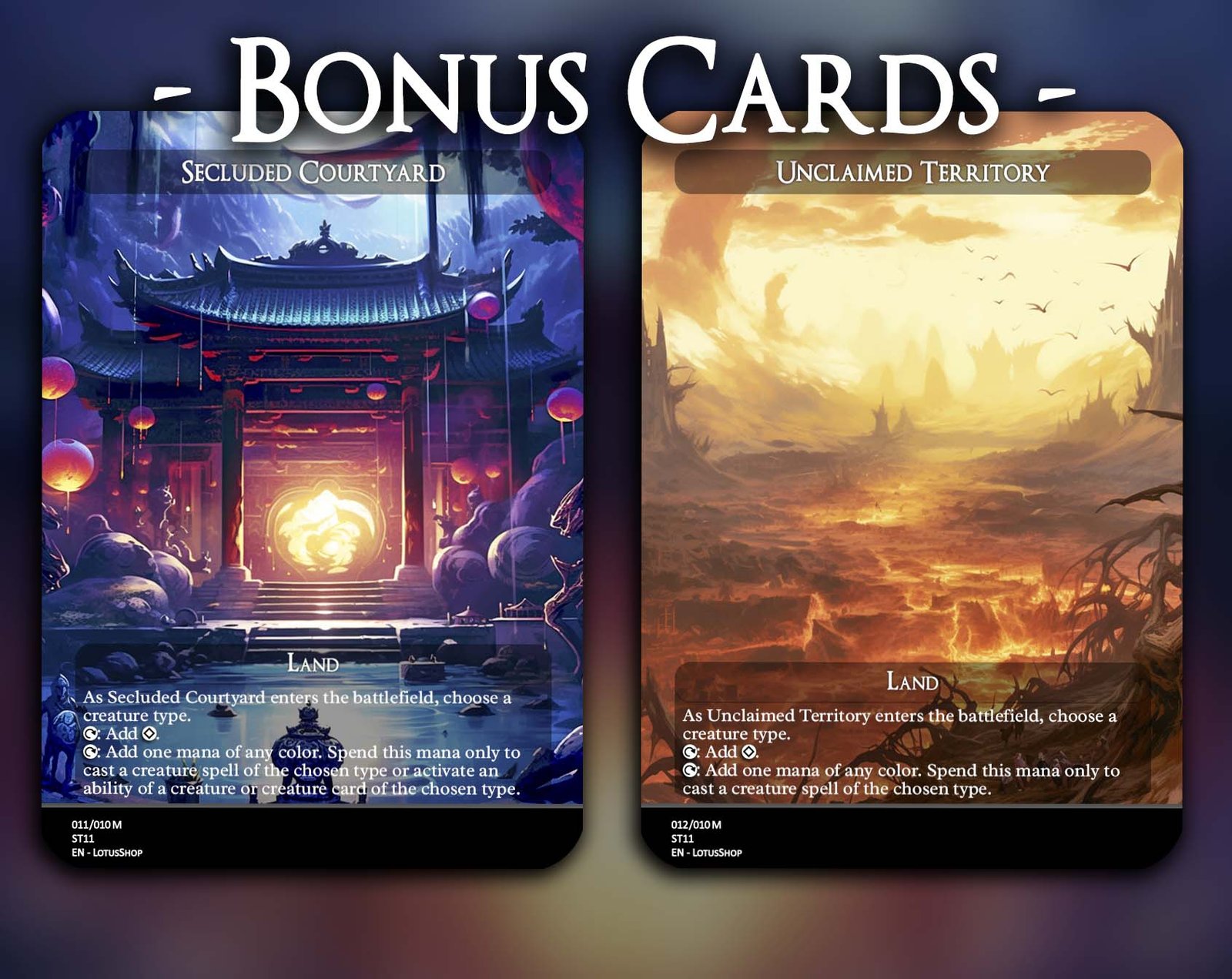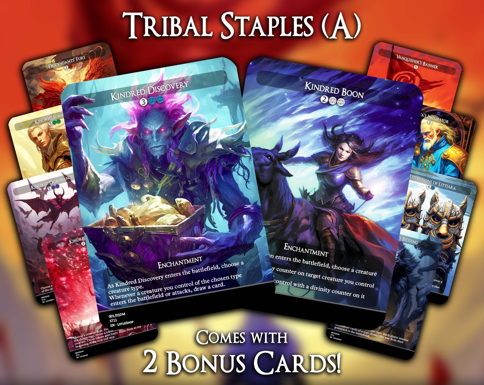 This 12-card set features the most iconic tribal support cards ever printed, perfect for powering up any creature-type focused Commander deck. From the Kindred cycle (Discovery, Boon, Charge, Dominance, Summons) to classic enablers like Patriarch’s Bidding and Descendants’ Fury, this set ensures your tribe of choice stays strong. Urza’s Incubator and Vanquisher’s Banner provide cost reduction and card draw, while Reflections of Littjara doubles your creatures. The mana base is covered with Secluded Courtyard and Unclaimed Territory, staples for smooth tribal casting.