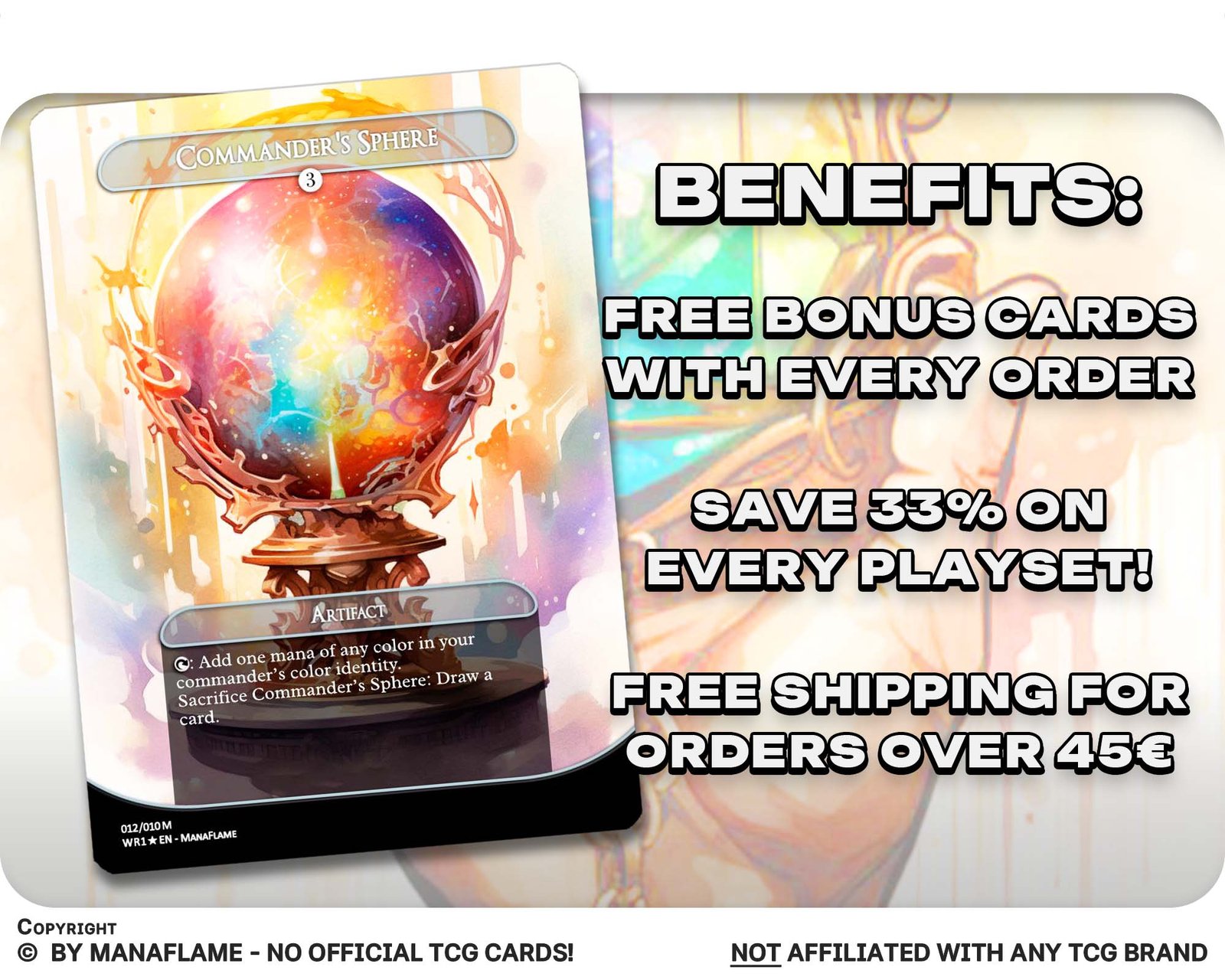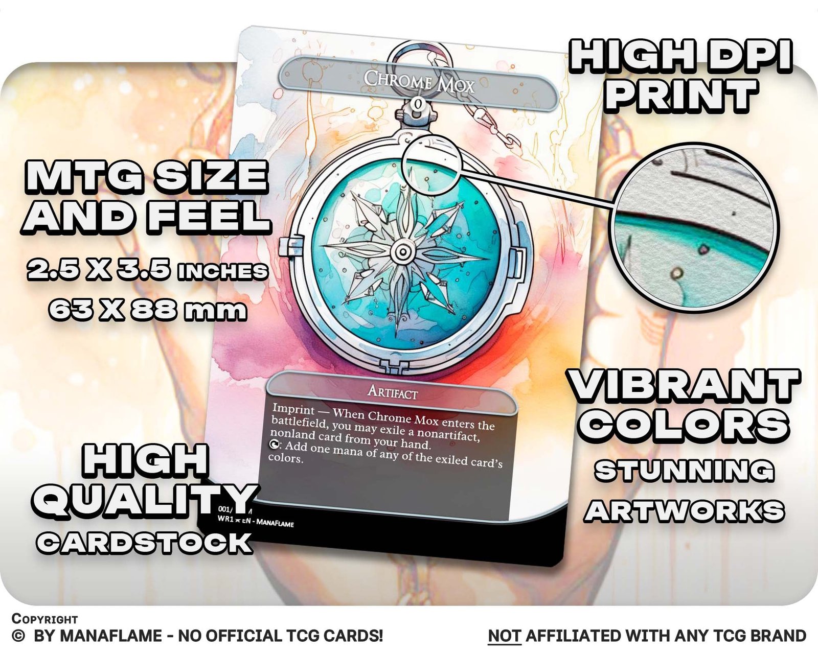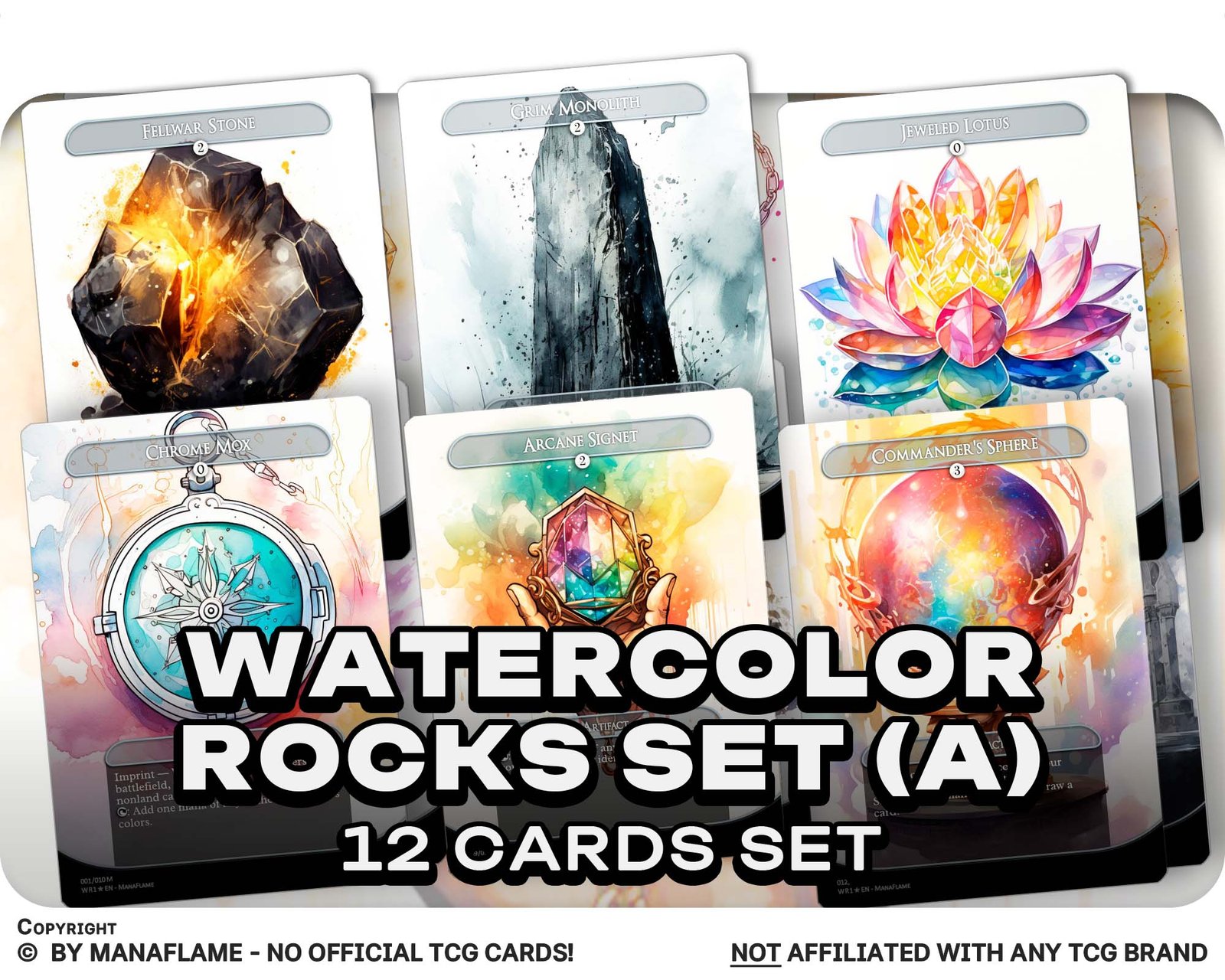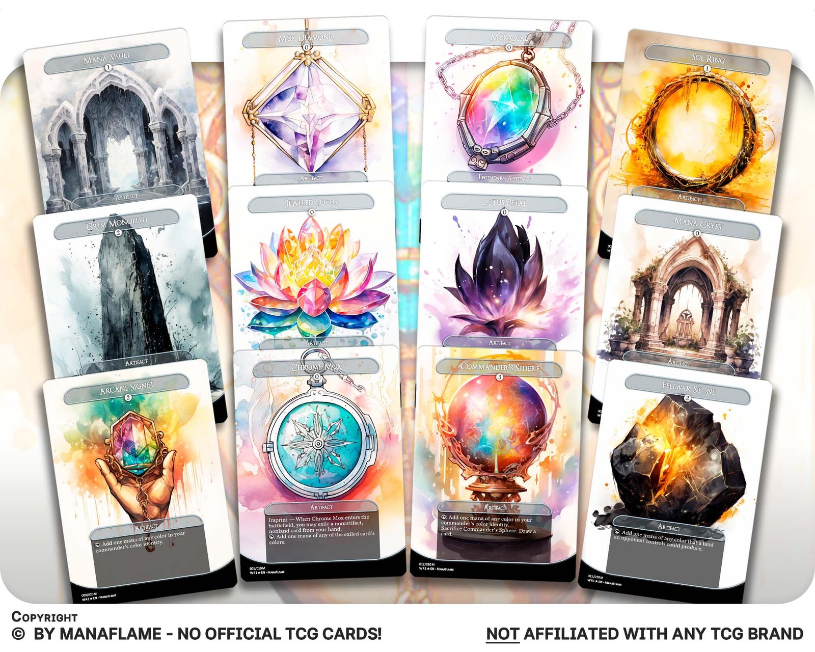 A premium 12-card set of the most iconic mana rocks, reimagined in striking watercolor style. From fast mana staples to Commander classics, this collection blends functionality with unique artistic flair—perfect for collectors and players alike.